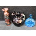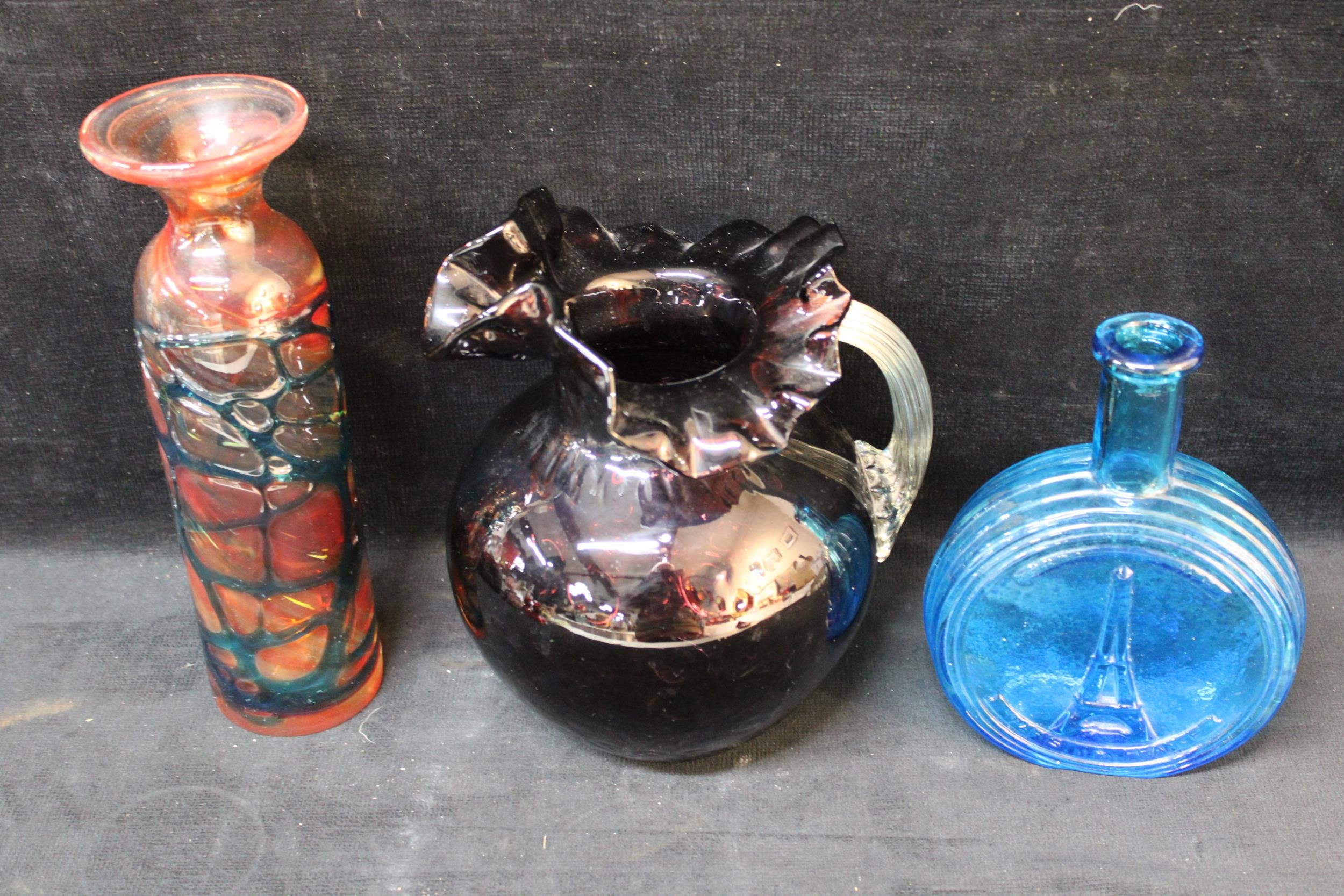 A purple glass jug, a red glass vase and a blue Italian glass vase - 27cmH