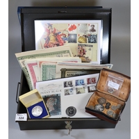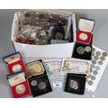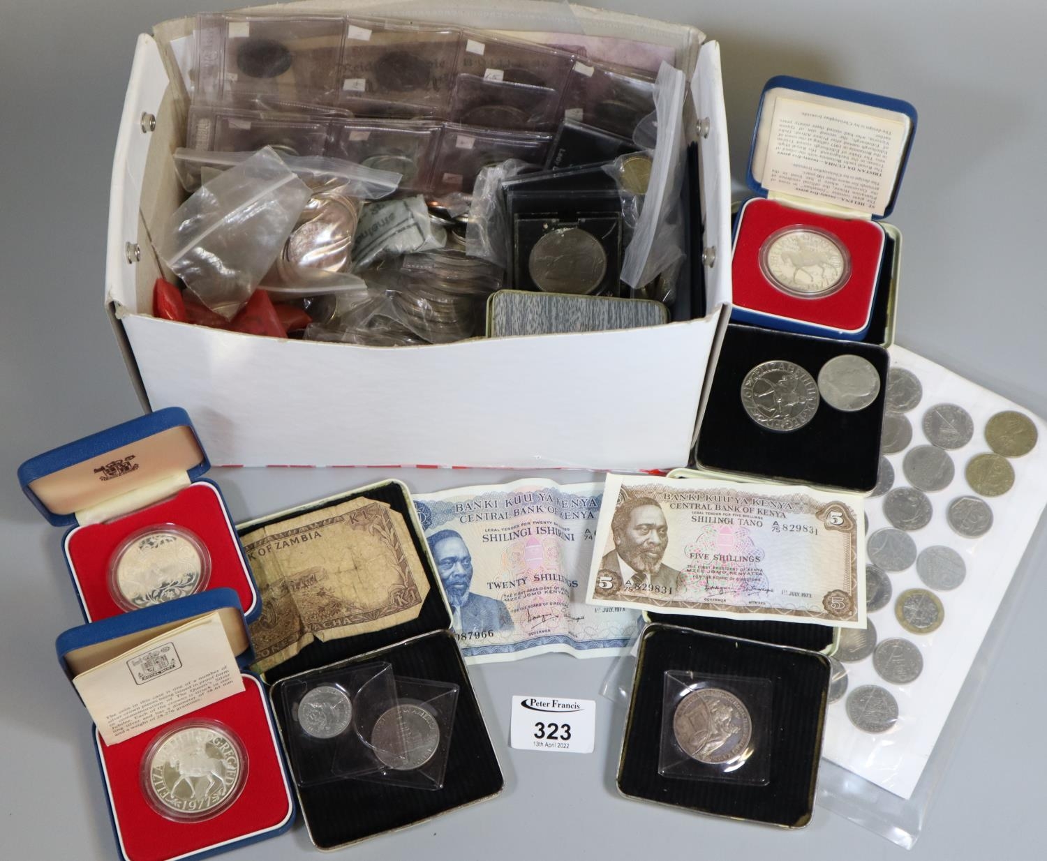 Box of assorted foreign and British coins and bank notes including a large collection of QEII crowns and coins from around the world, three 1977 silver Silver Jubilee crowns in their cases etc.