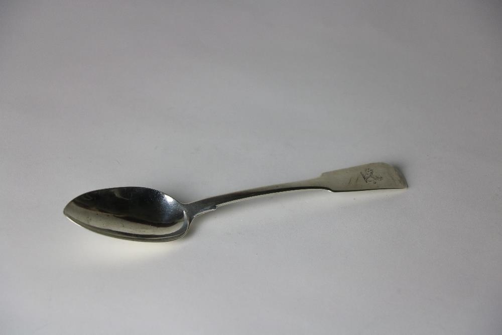 An Irish silver rat-tail Serving Spoon, by James le Bass, c. 1829, with rampant lion crest, approx. two ounces. (1)
