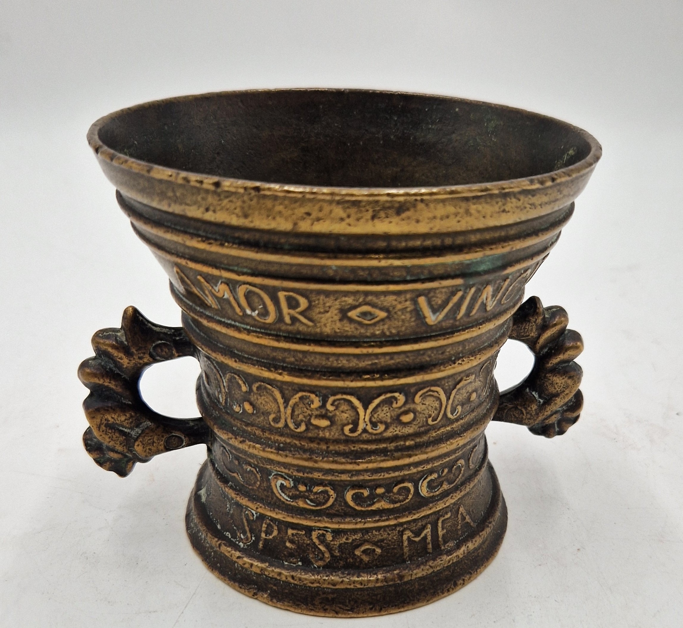 BRONZE "CUPID VINCIT" TWIN HANDLED MORTAR