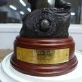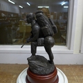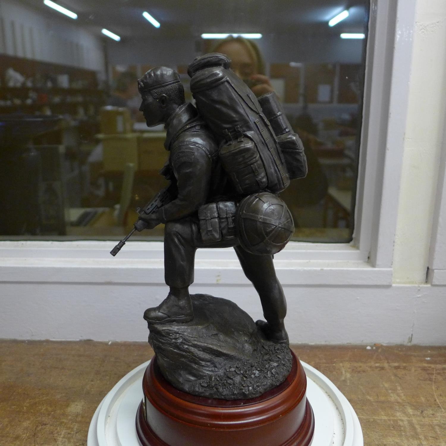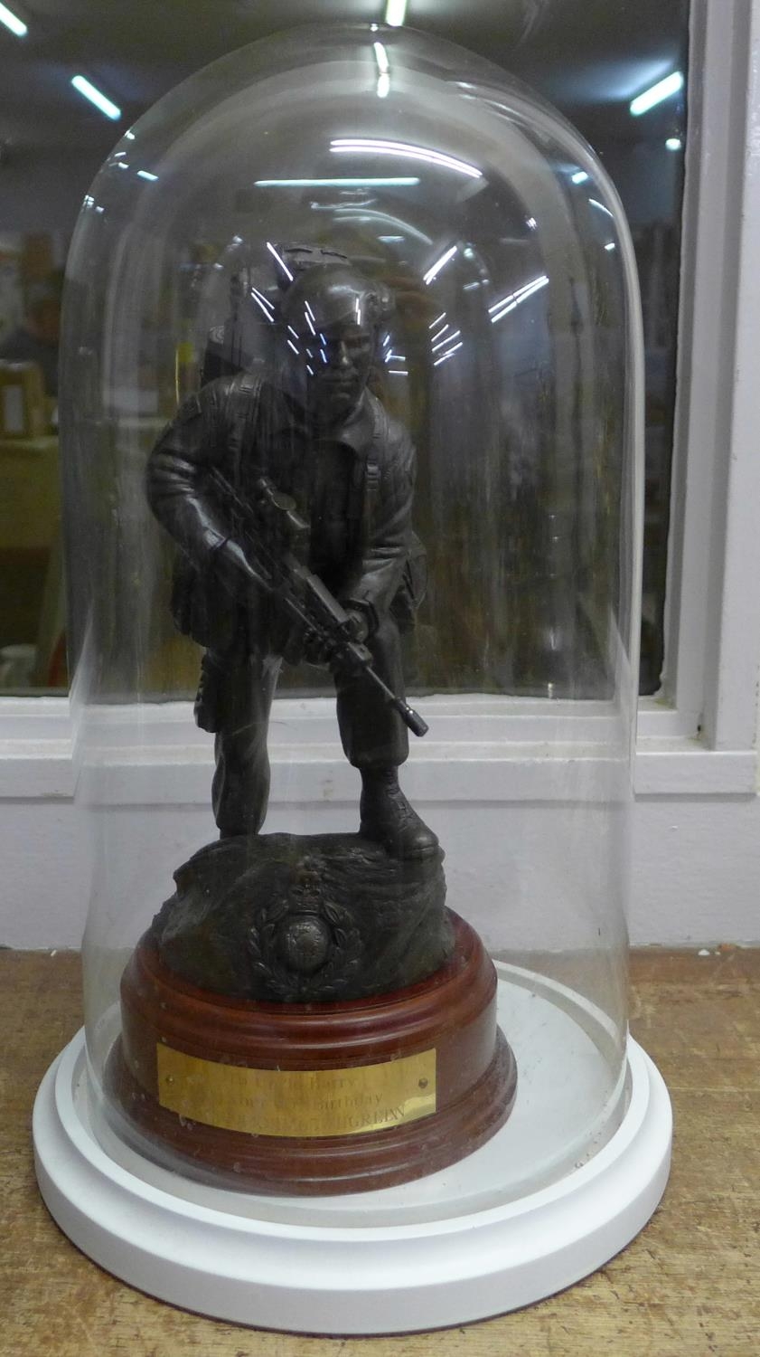A resin model of a Royal Marine on a wooden plinth with plaque under a glass dome, dome 36cm
