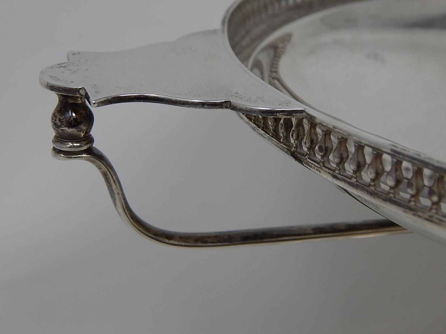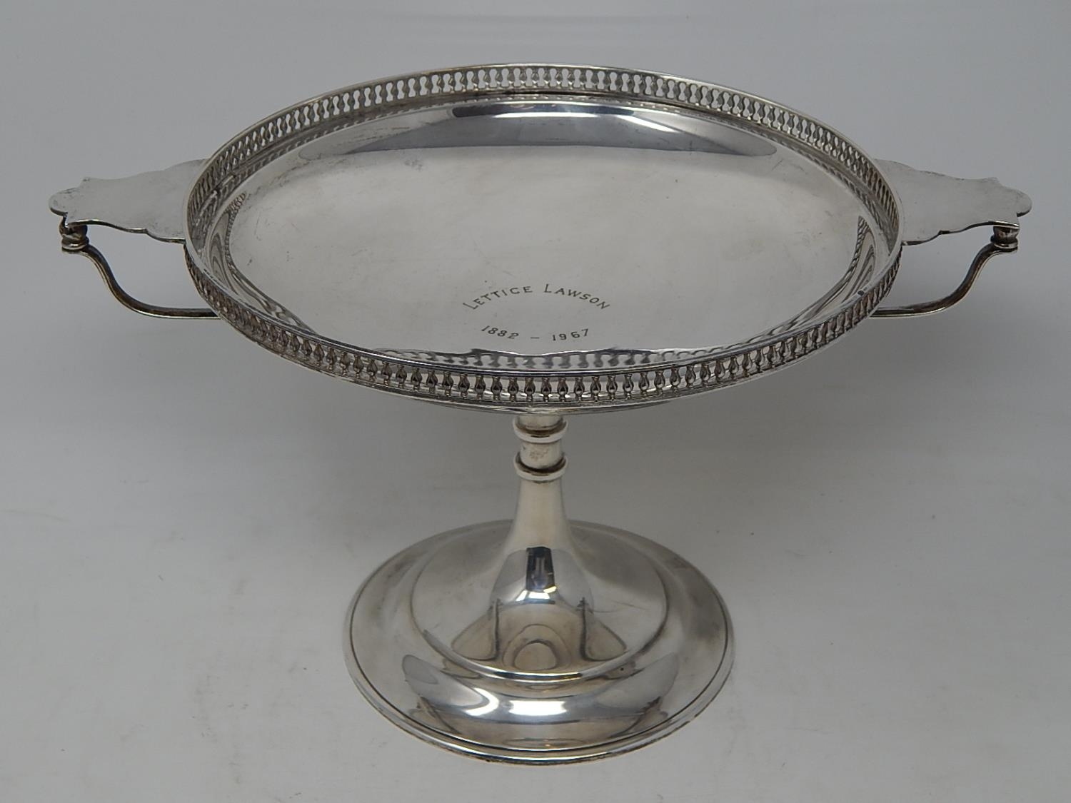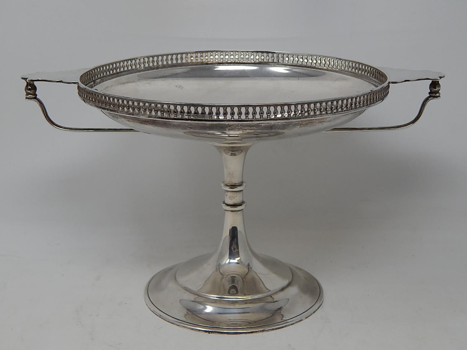 Arts & Crafts Silver Tazza with pierced gallery & stylised twin handles sitting on a conical foot. Hallmarked Sheffield 1919 by Martin Hall & Co. Weight 644g
