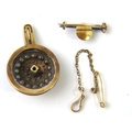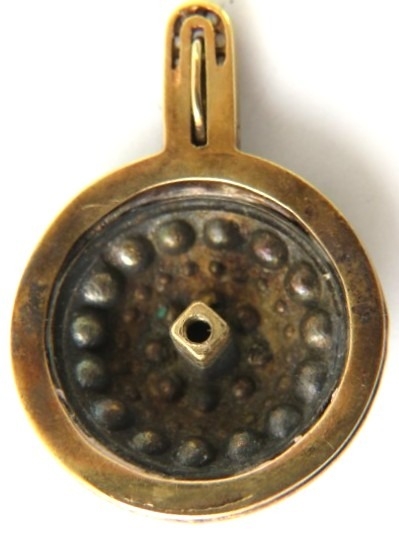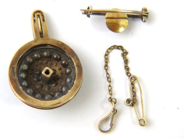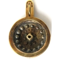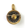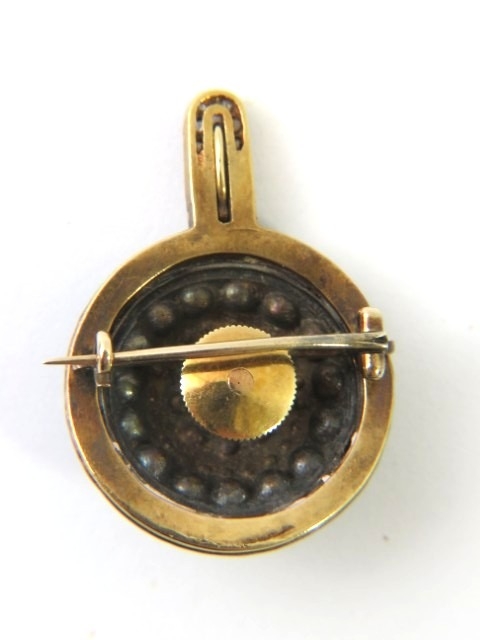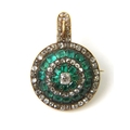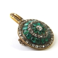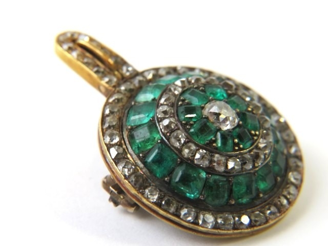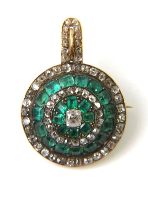 An antique emerald and diamond target pendant brooch. The domed pendant brooch with a central old mine cut diamond estimated 0.27cts, within concentric rings of old square cut emeralds and old mine cut diamonds all grain set in silvery white metal and with yellow gold solid back, diamond set fixed bale surround, with detachable brooch fitting and articulated loop bale with safety chain, the whole 34.1mm x 24.1mm approx, 9.9g gross approx, possibly Russian.