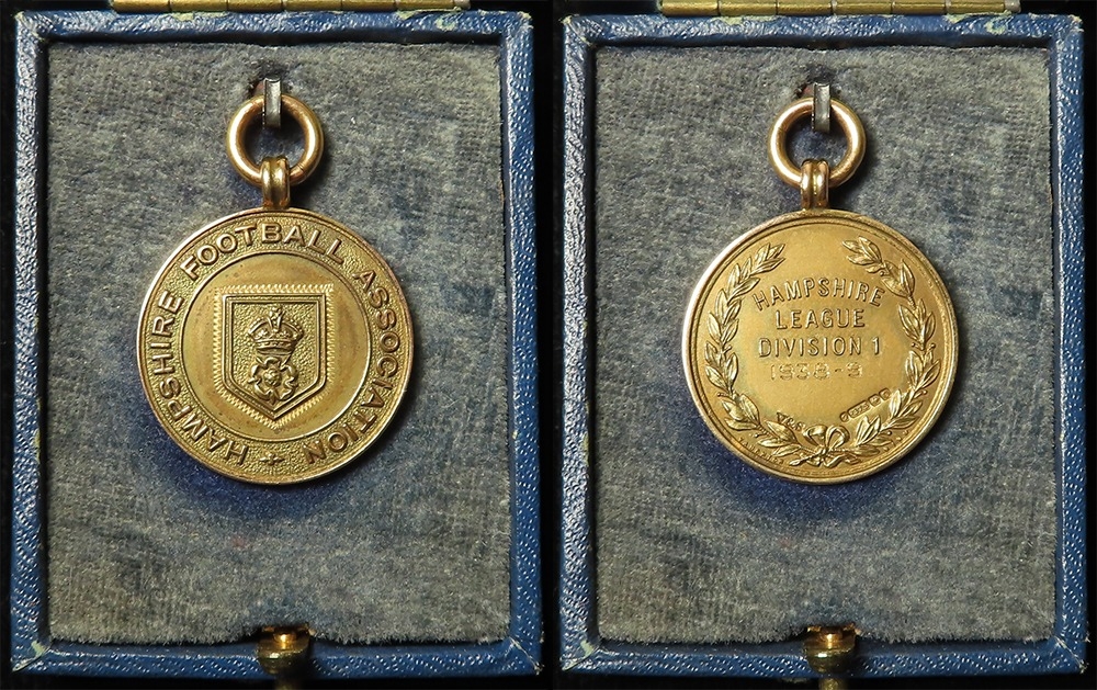 British Sporting Medal (football): Hampshire Football Association around crown & rose badge. Reverse: 'HAMPSHIRE LEAGUE DIVISION 1, 1938-9'. Hallmarked 9ct gold, weight 7.4g. In case of issue.