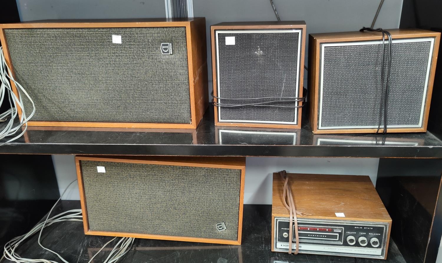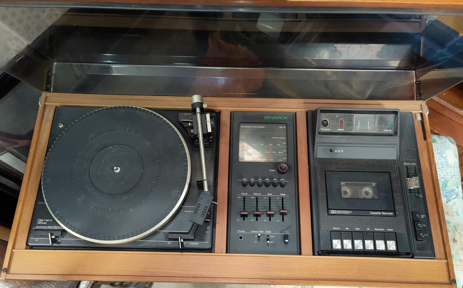 A vintage Dynatron teak record and tape deck with 4 speakers and detachable 8 track player