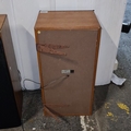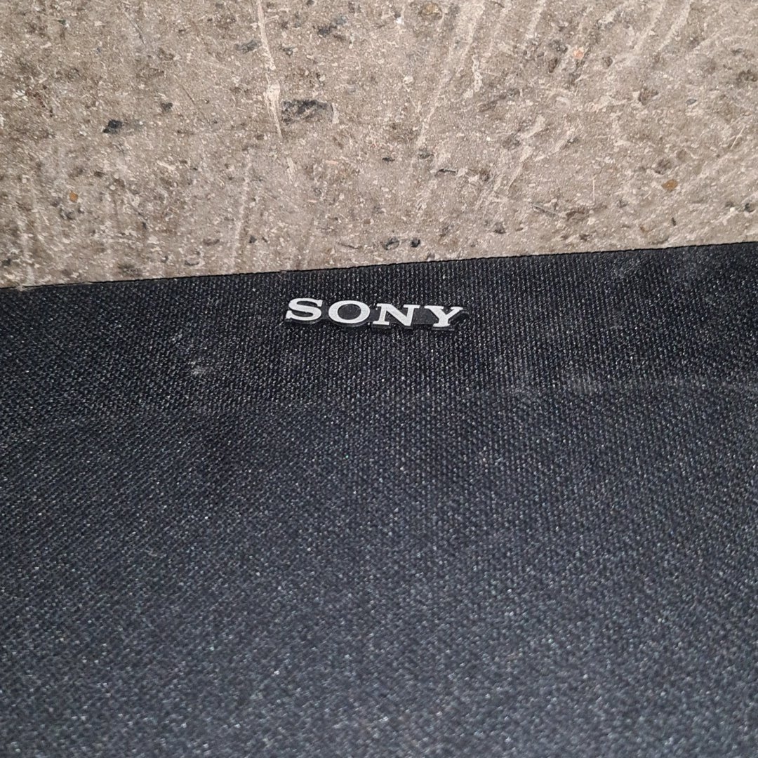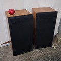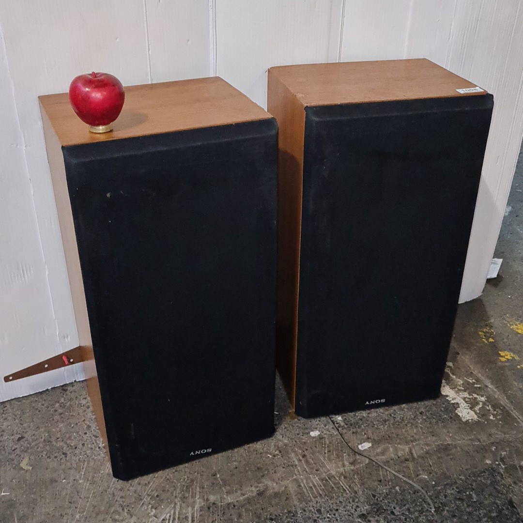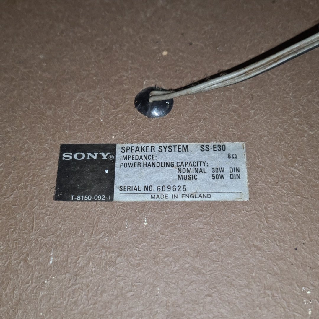 Pair of vintage Sony SS-E30 loudspeakers, made in England, with black cloth grilles and rectangular cabinets; rear labels stating 8 ohms impedance and power handling 30W nominal, 50W music (DIN). Made in England.
