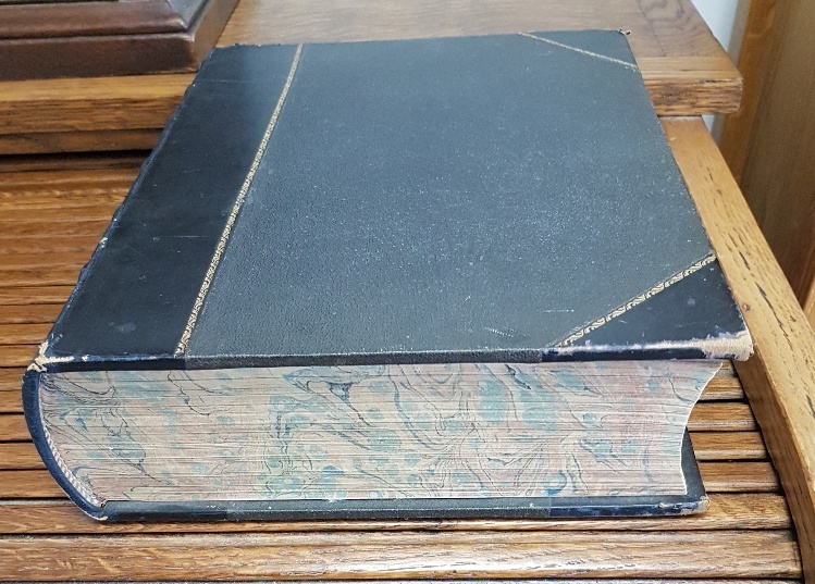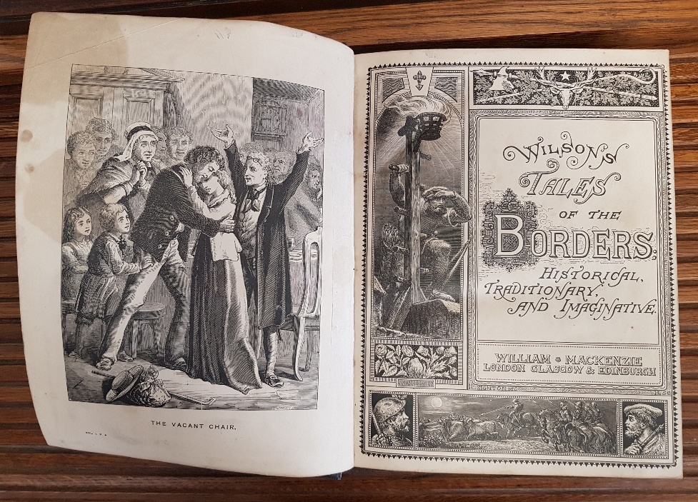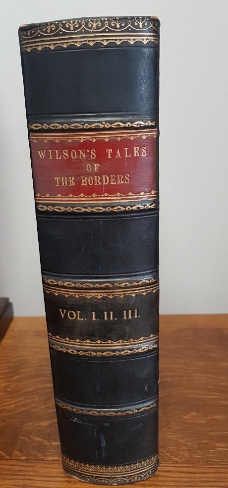Wilson's Tales of the Borders, published and printed by William McKenzie in 1870, volumes 1, 2 and 3 bound in one volume. 1,240 pages with page illustrations, size is 11 inches x 9 inches x 3 inches deep. Half bound in calf leather, with gold lettering.