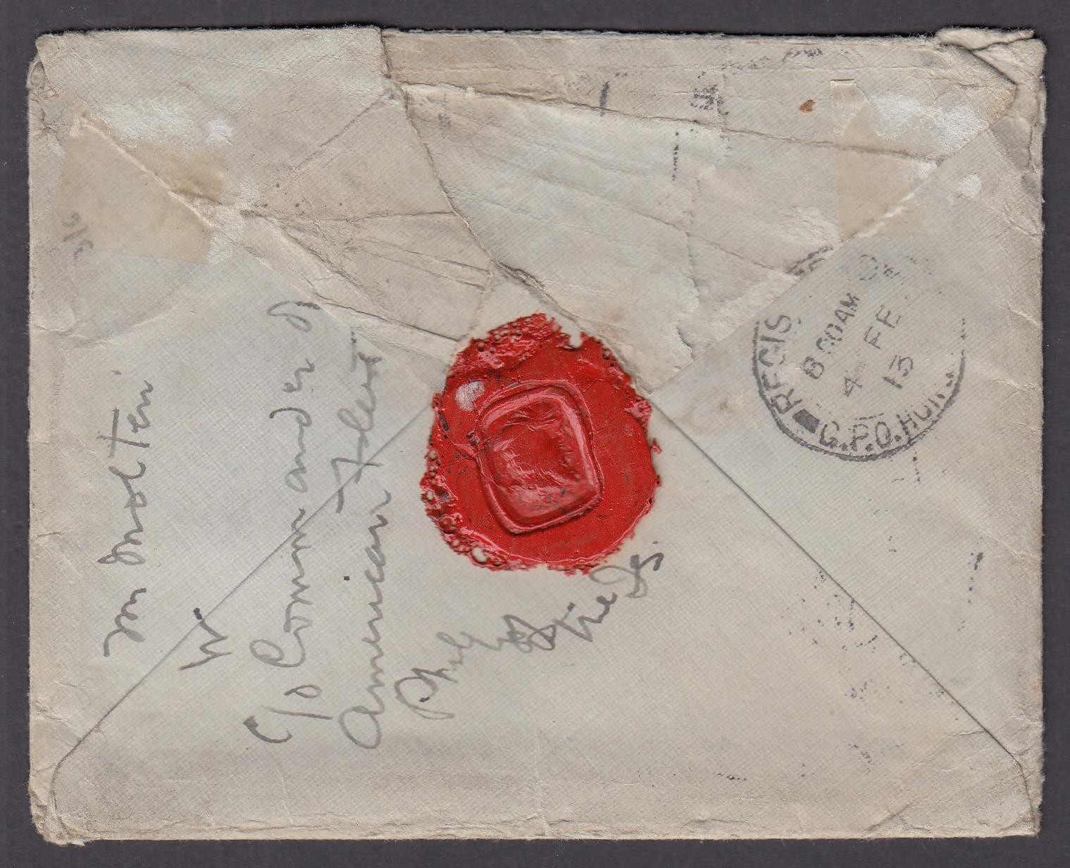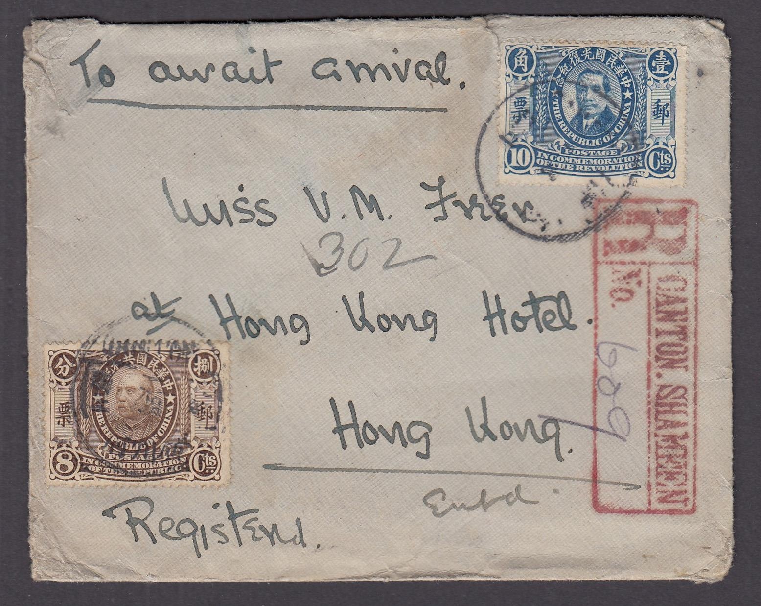 1913 Registered cover to Hong Kong from Canton, Shameen, affixed by SG247 10c & SG258 8c.