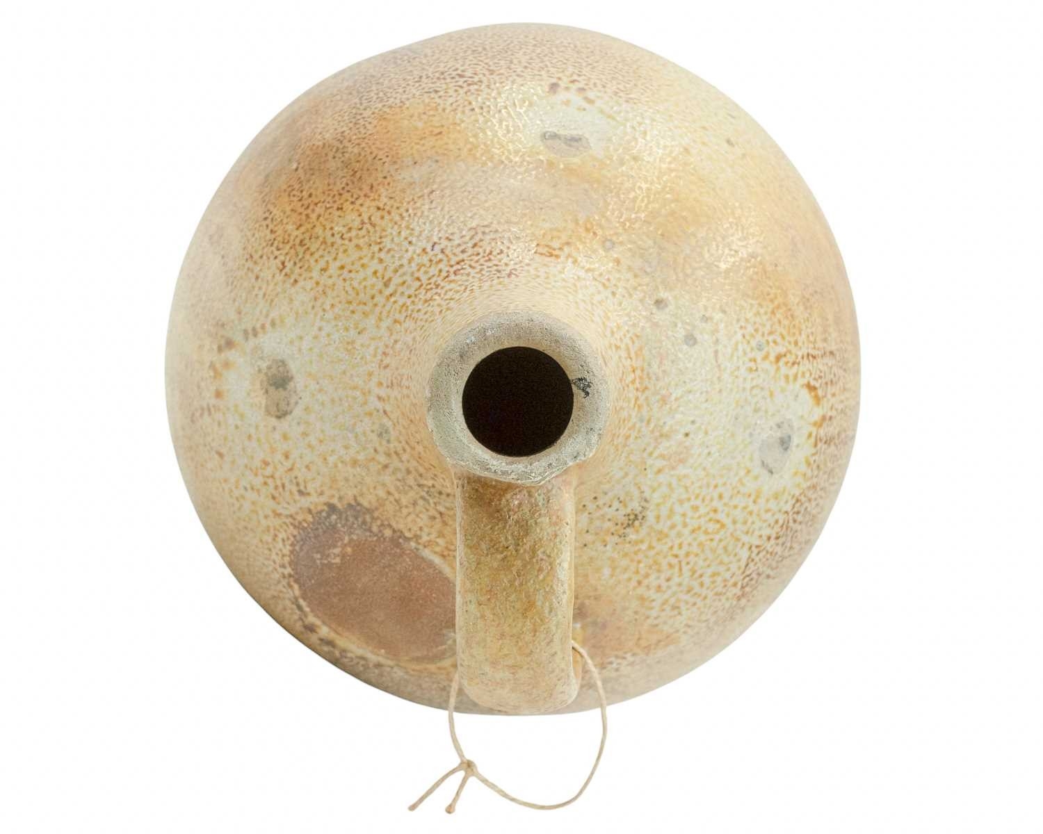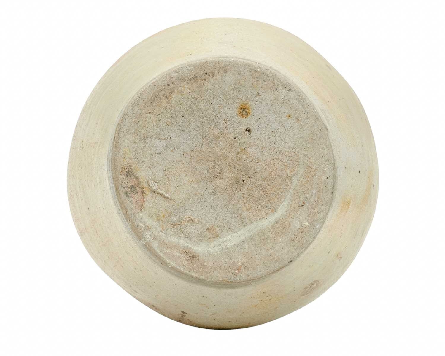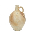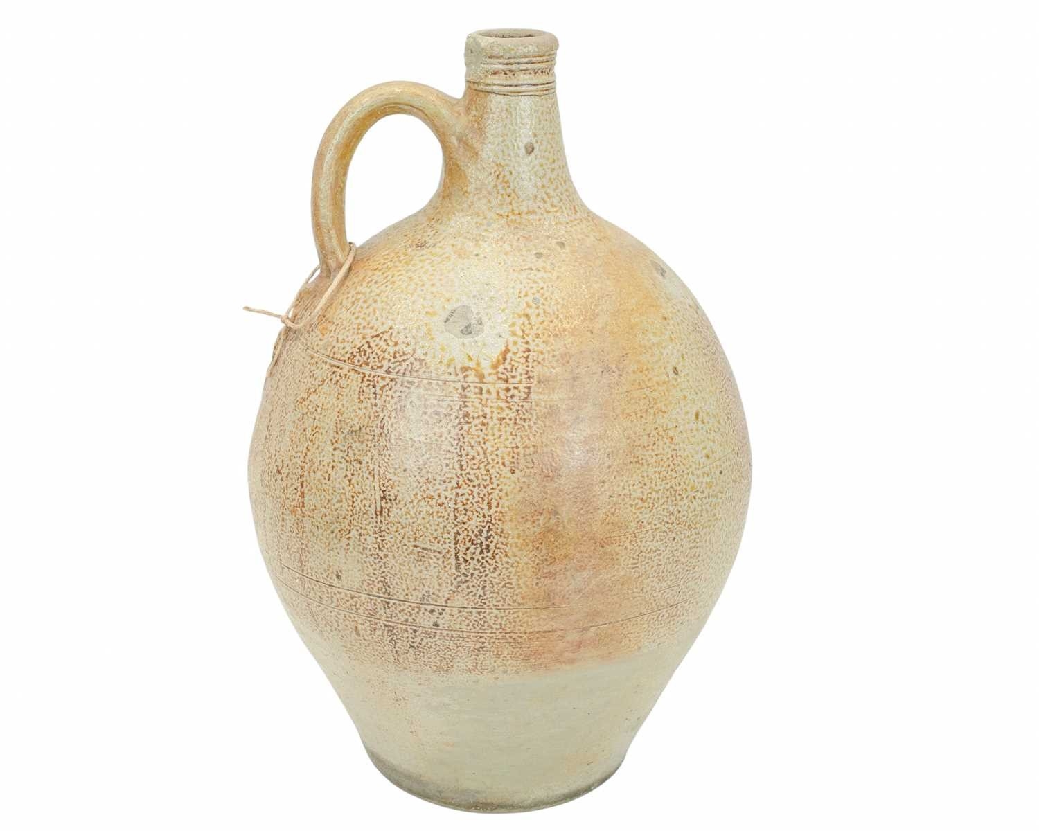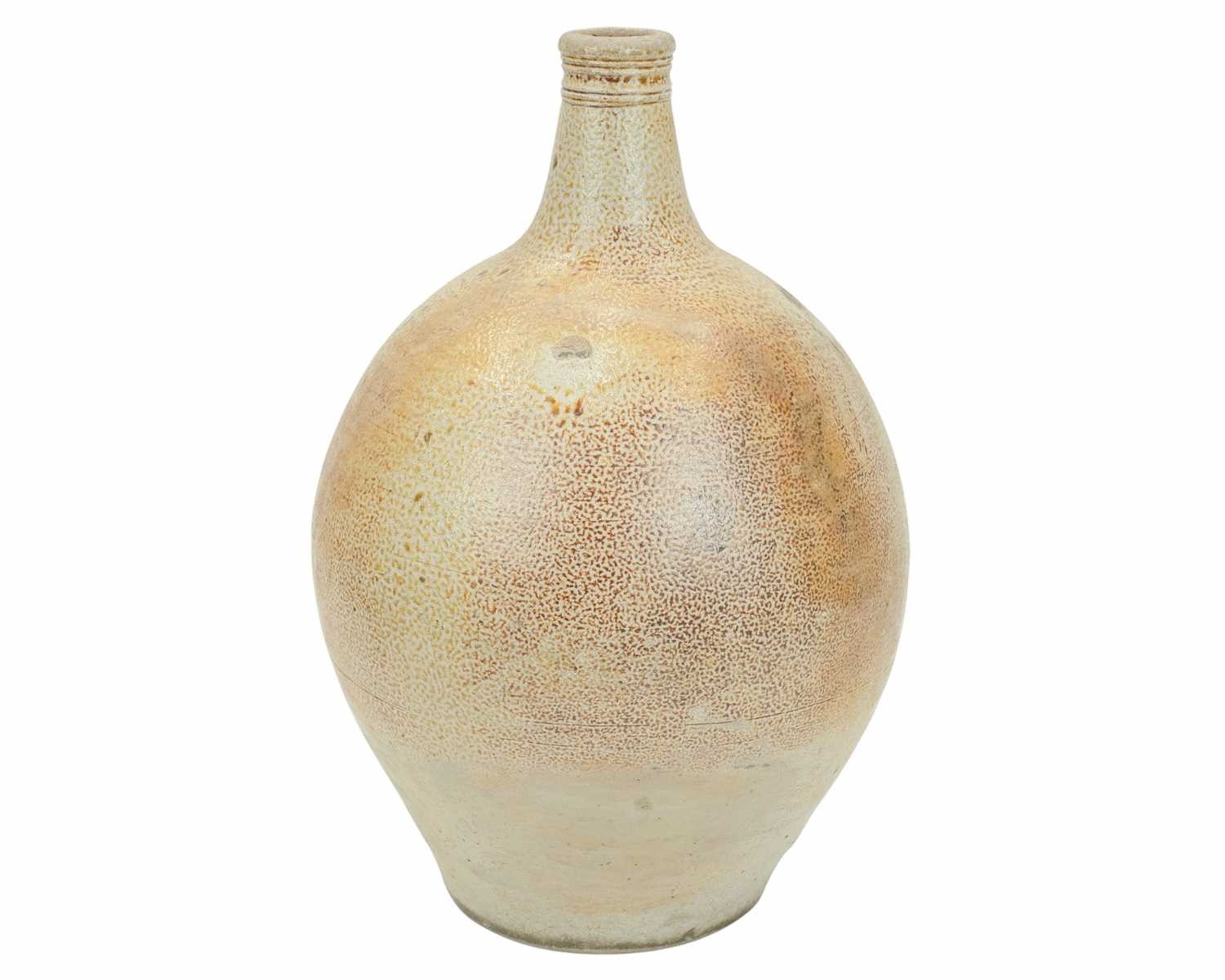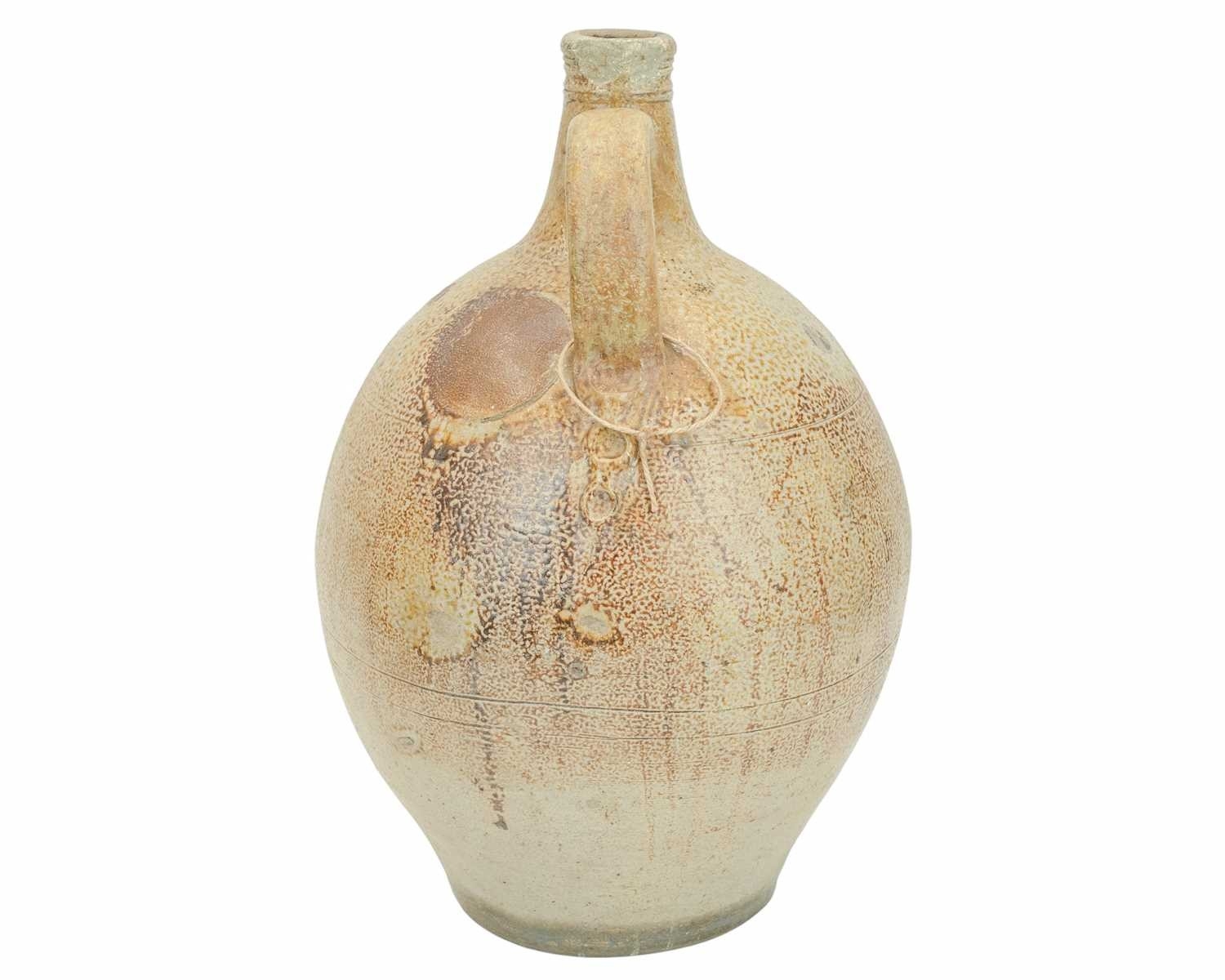 A large English salt glazed wine jug or flagon. Circa 1630, with a typical mottled glaze and narrow ribbed neck, height 47cm. Purchased from Denzil Grant, 2010. The collection of the late potter Peter Smith of Bojewyan Pottery in West Cornwall. Fellow of the Craftsman Potters Association, member of Newlyn Society of Artists and later chairman of Newlyn Gallery. Peter was also an influential teacher of ceramics at Falmouth University, where he encouraged a spontaneous and improvised approach based on developing technique and an understanding of the medium of clay as an expressive and practical form. Peter originally started as a research chemist before turning to pottery after attending evening classes. He started his own pottery at Bojewyan in West Cornwall in 1974. As well as being a renowned and experimental potter and tutor, he was also a keen collector of medieval and later pottery from the UK and further afield. His Guardian obituary can be read here: https://www.theguardian.com/artanddesign/2025/aug/13/peter-smith-obituary
