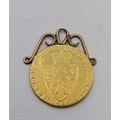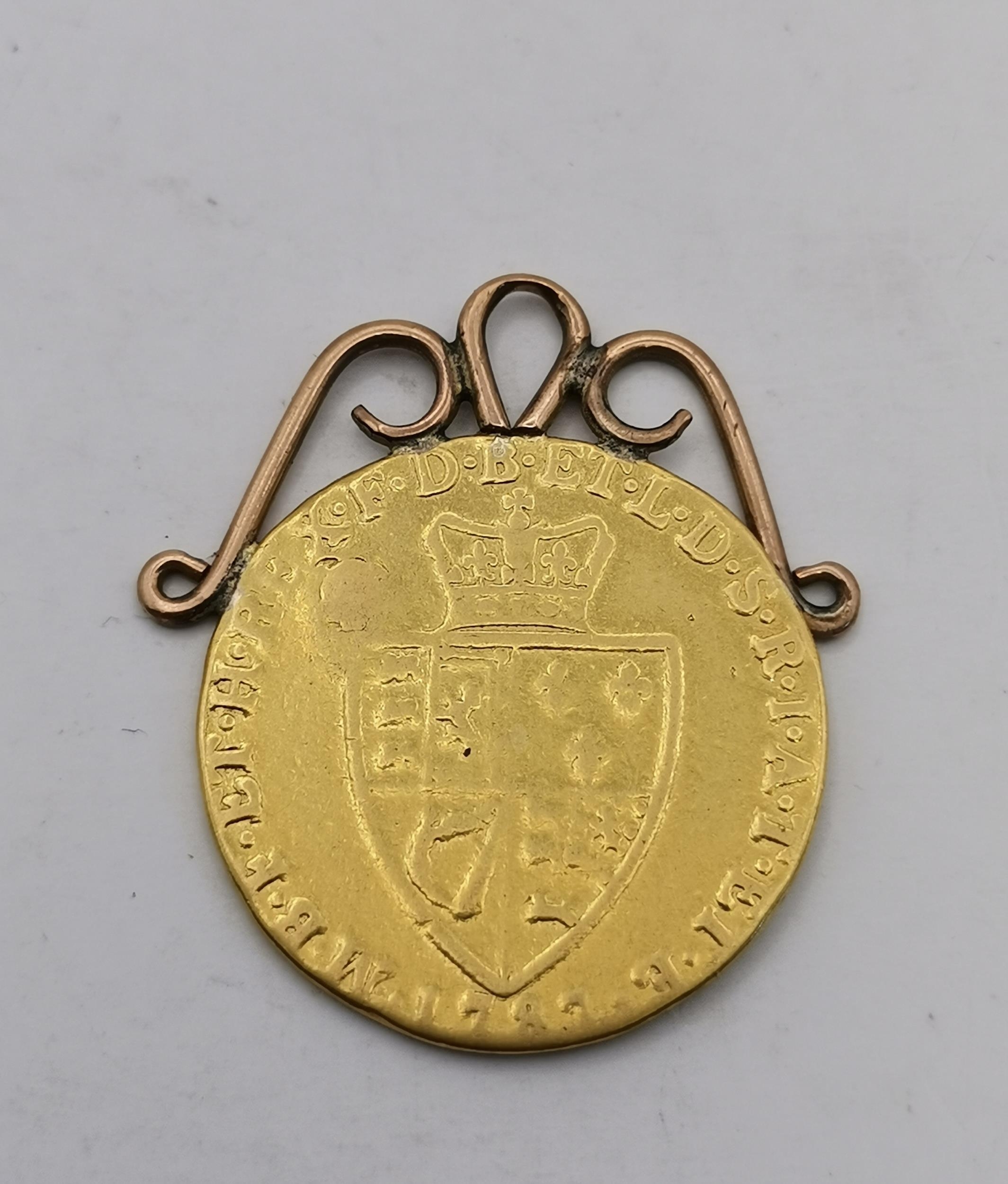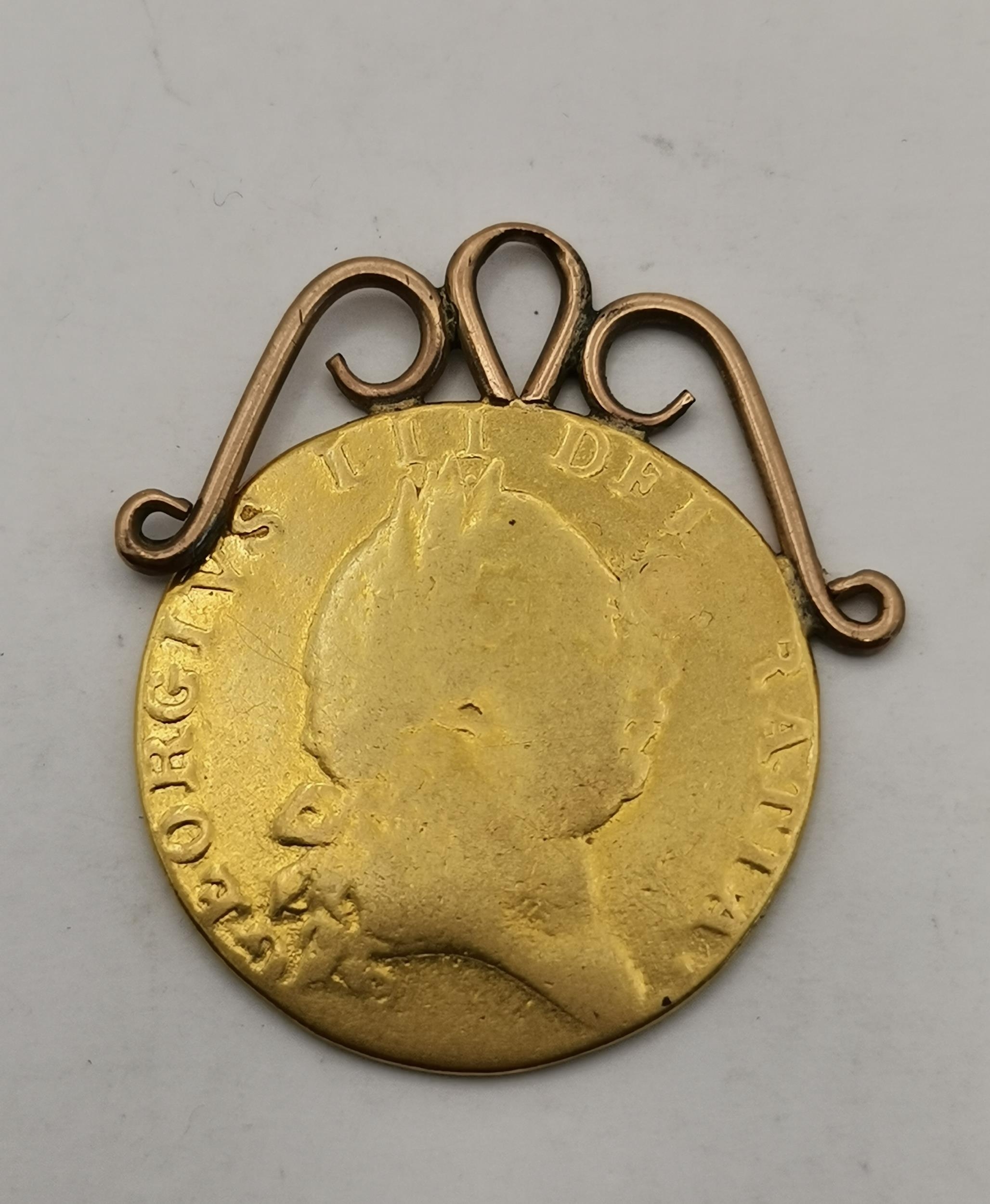 A George III 1787 spade guinea pendant, with unmarked yellow metal fixed scroll mount. 8.9g gross