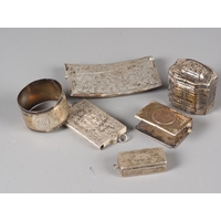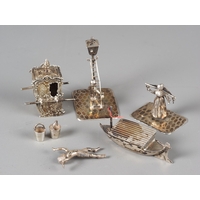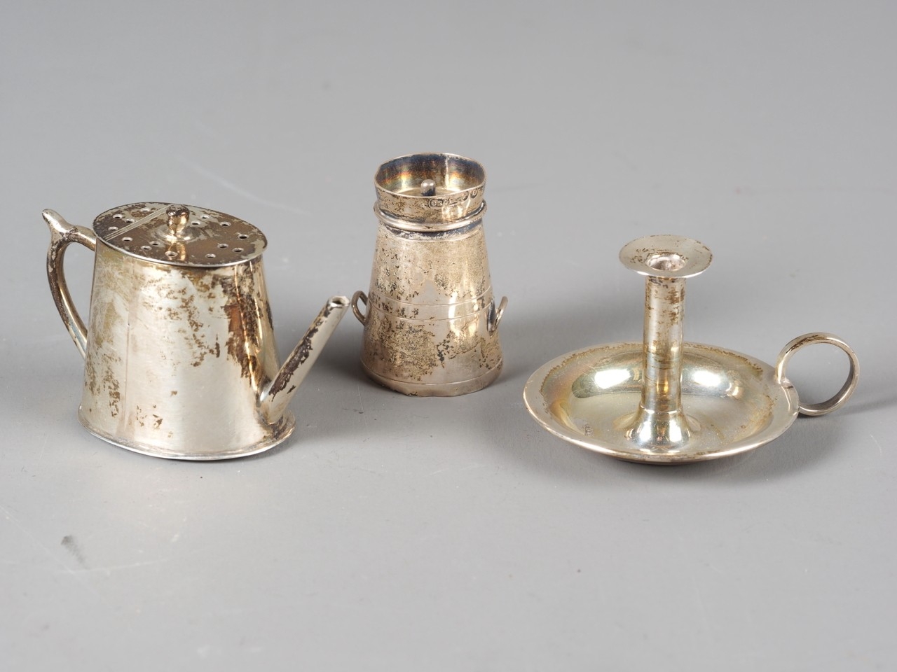 A silver pepper pot formed as a milk churn, another pepper pot formed as a watering can, and a taper stick, 1.1oz troy approx