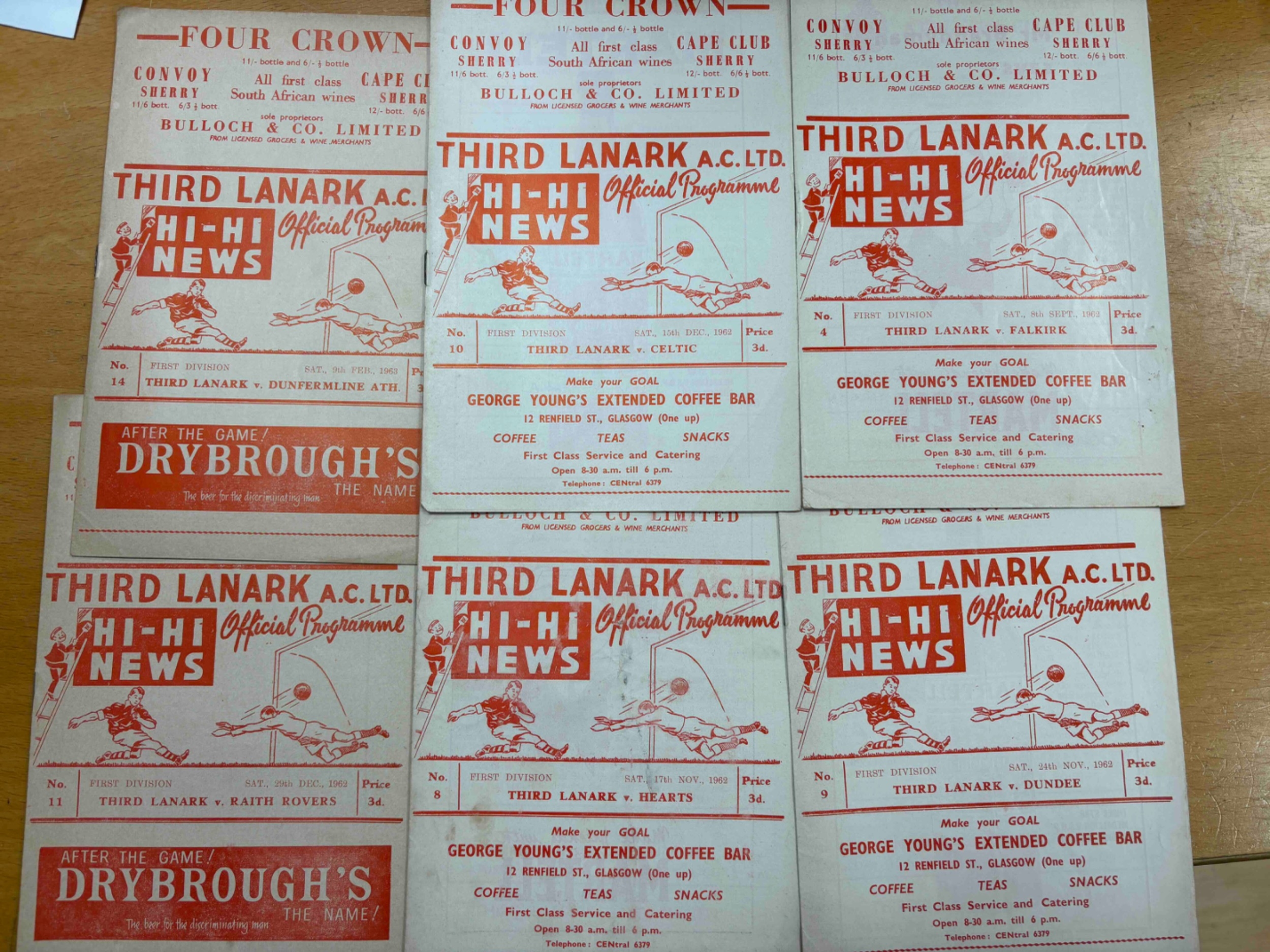 Third Lanark, 6 home programmes 62/63 v Celtic, Dundee, Dunfermline, Falkirk, Hearts & Raith. No tears or writing.