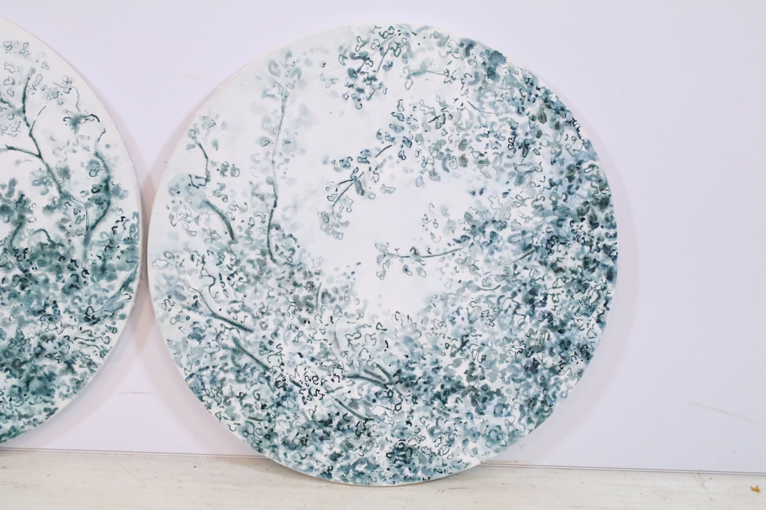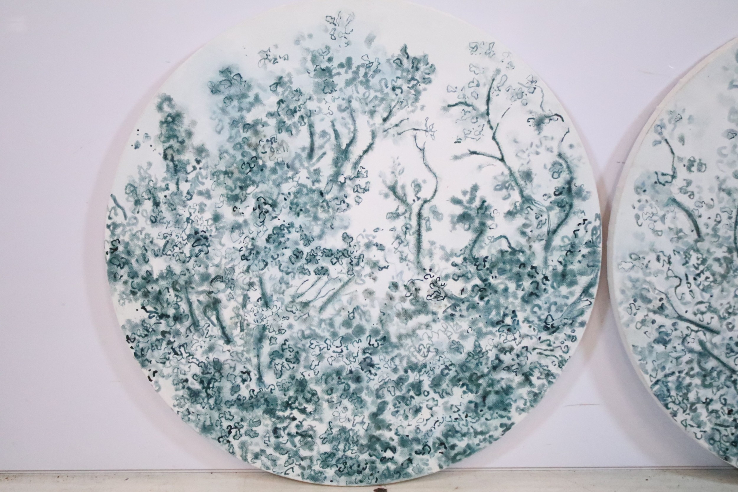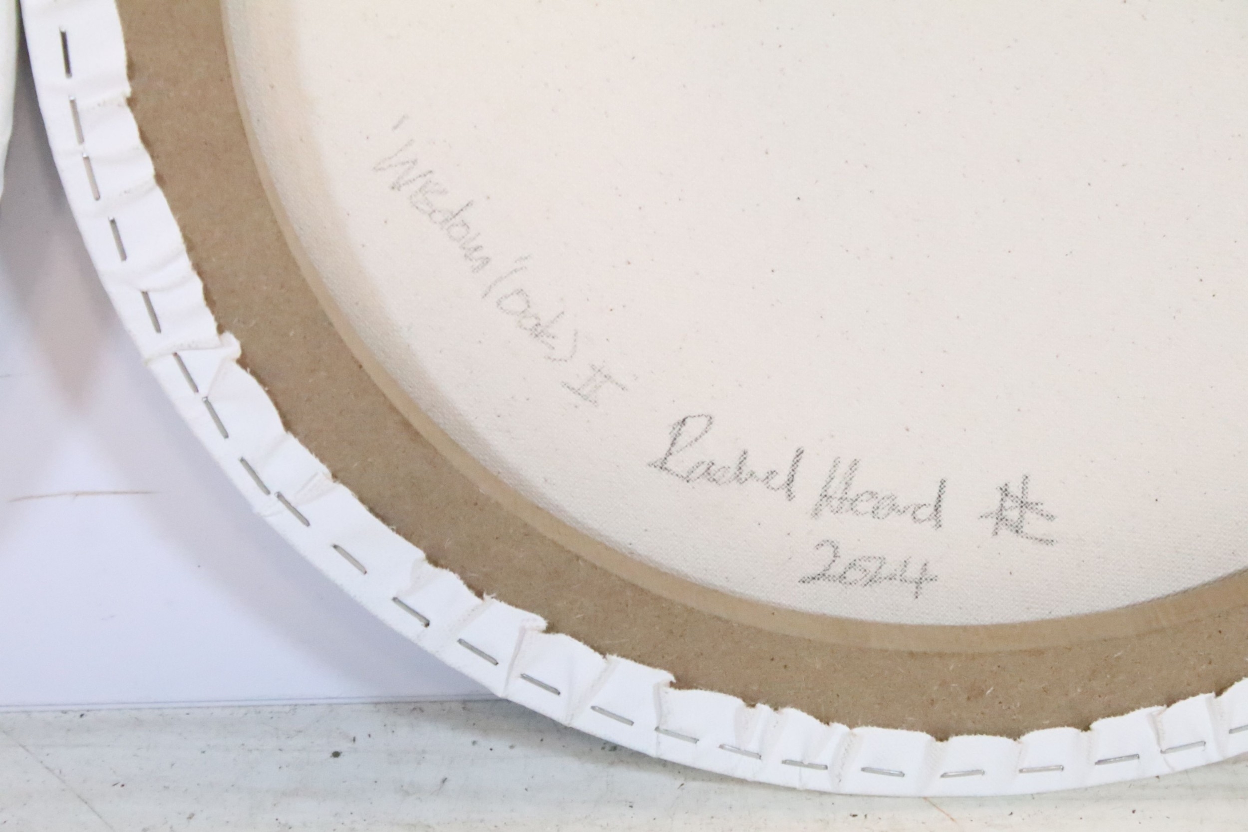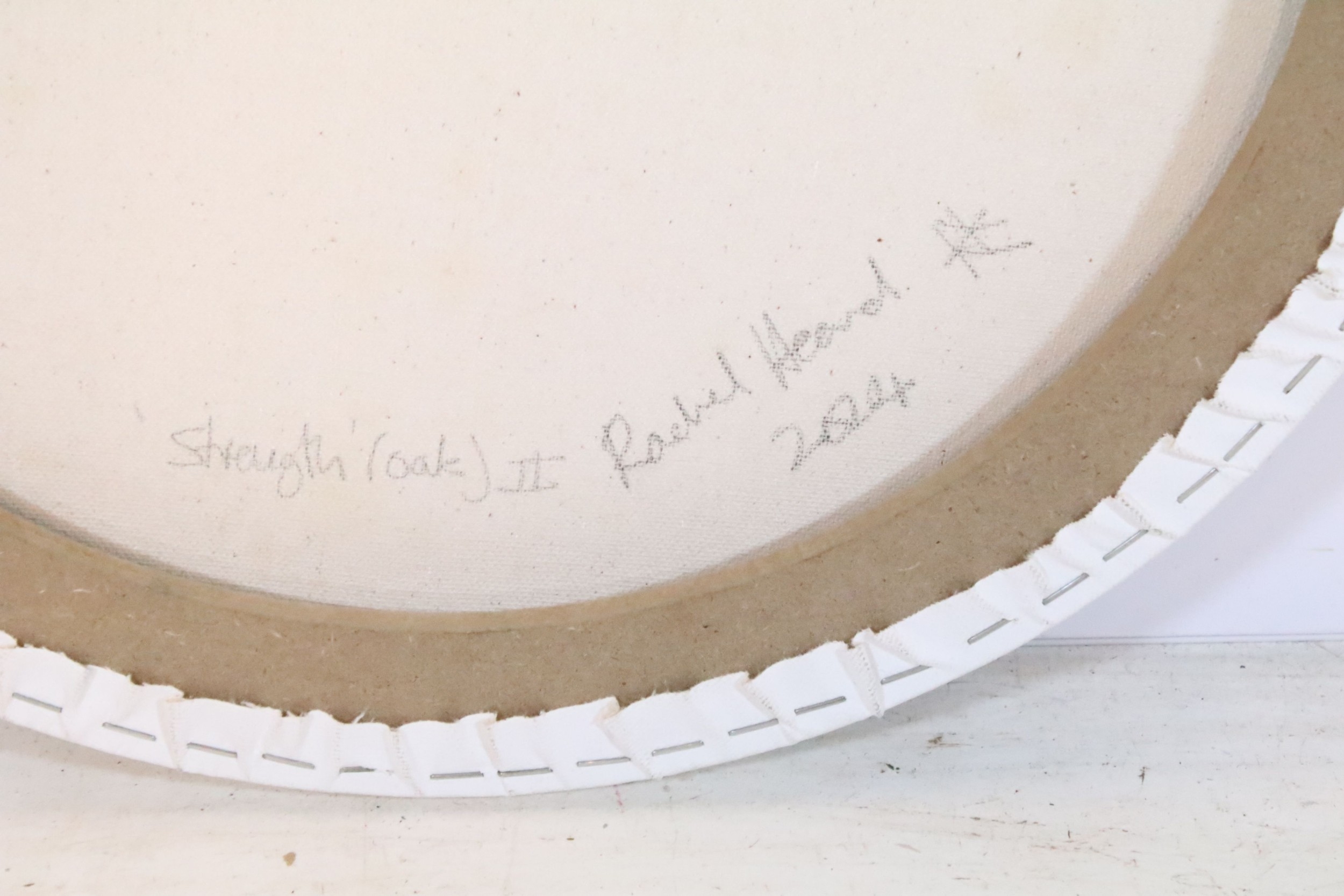 Rachel Heard (British, 20th century), a pair: 'Straigth (Oak) II' and 'Wisdom (Oak) II', each signed and titled verso, dated 2024, 40cm diameter