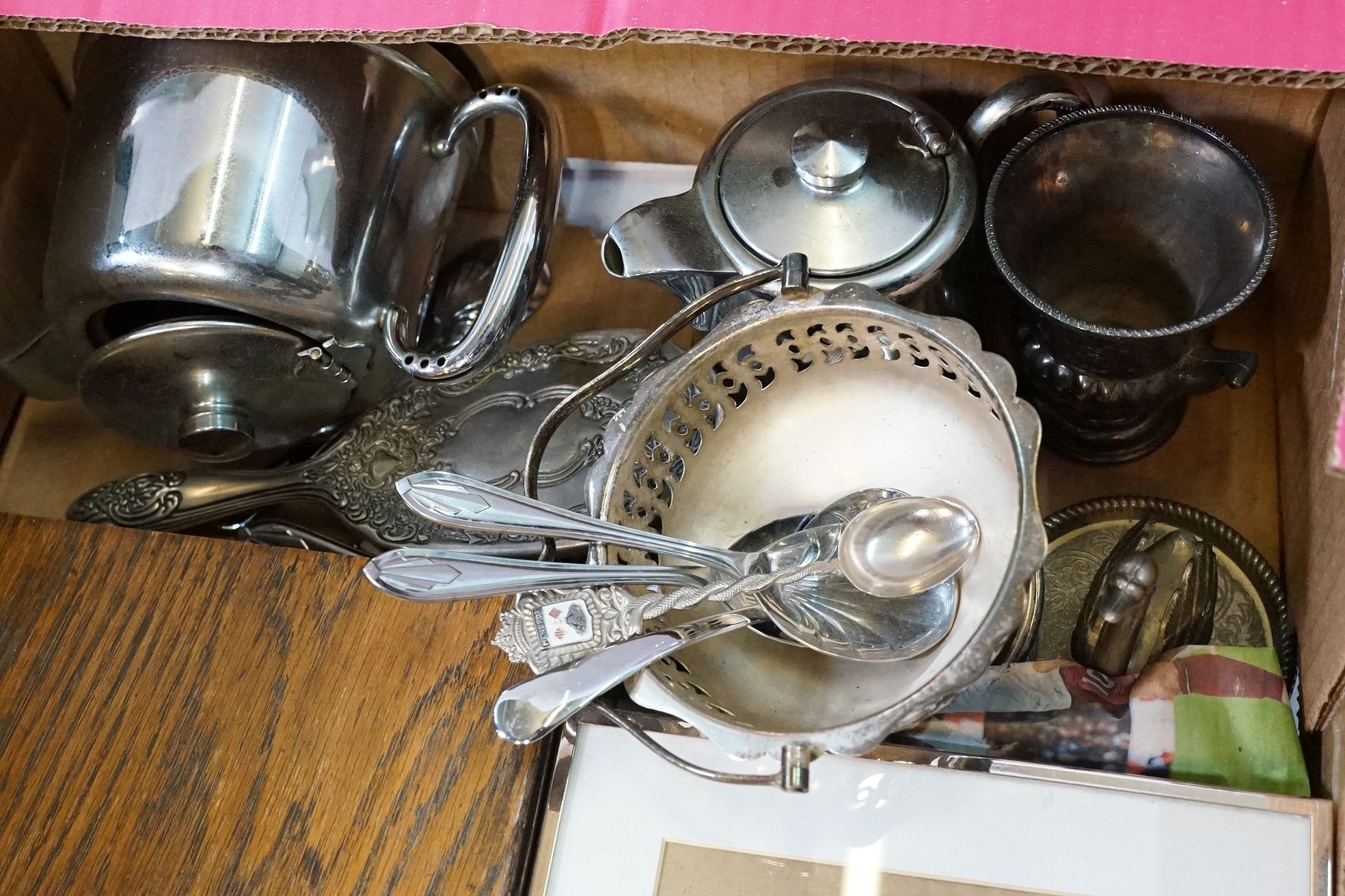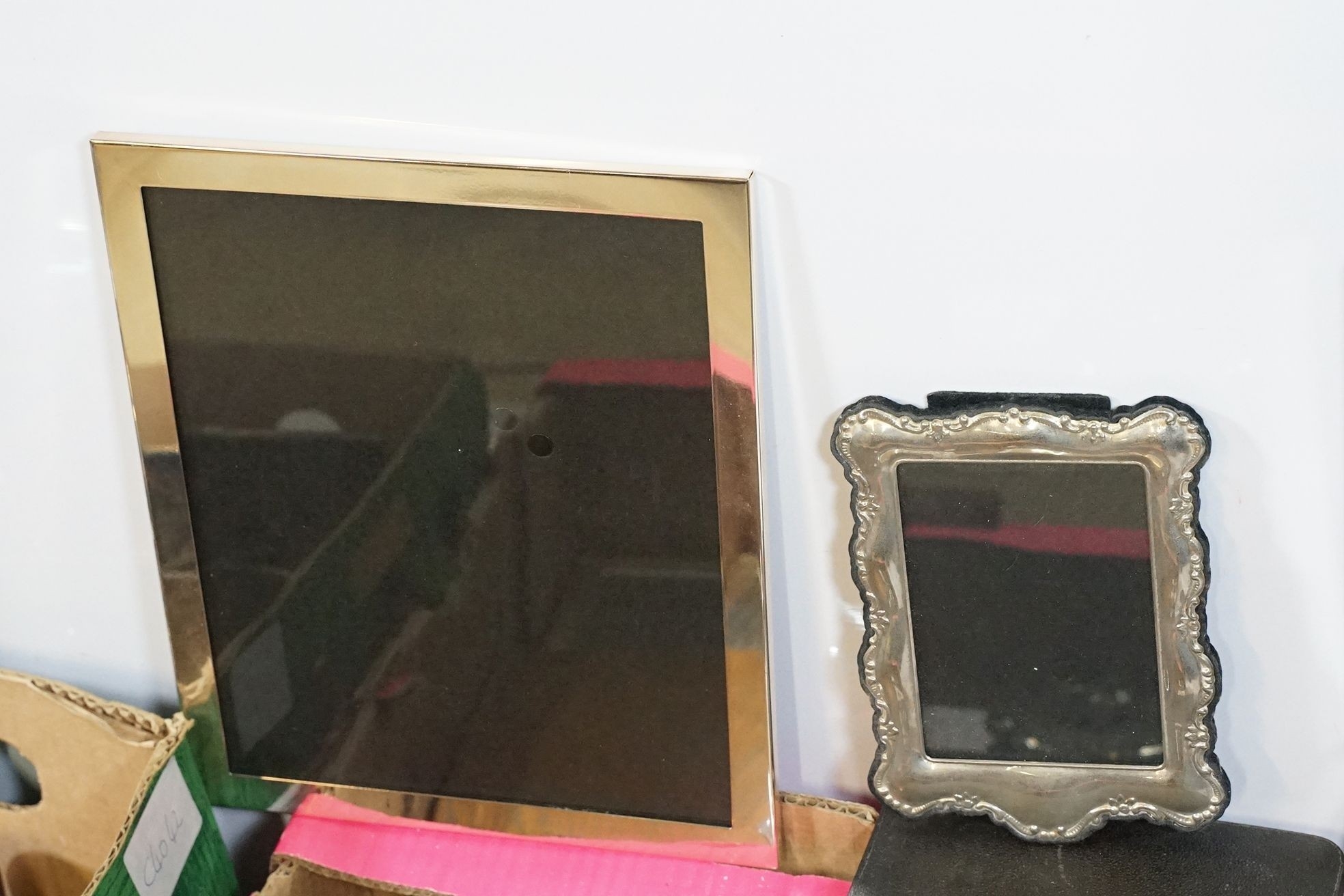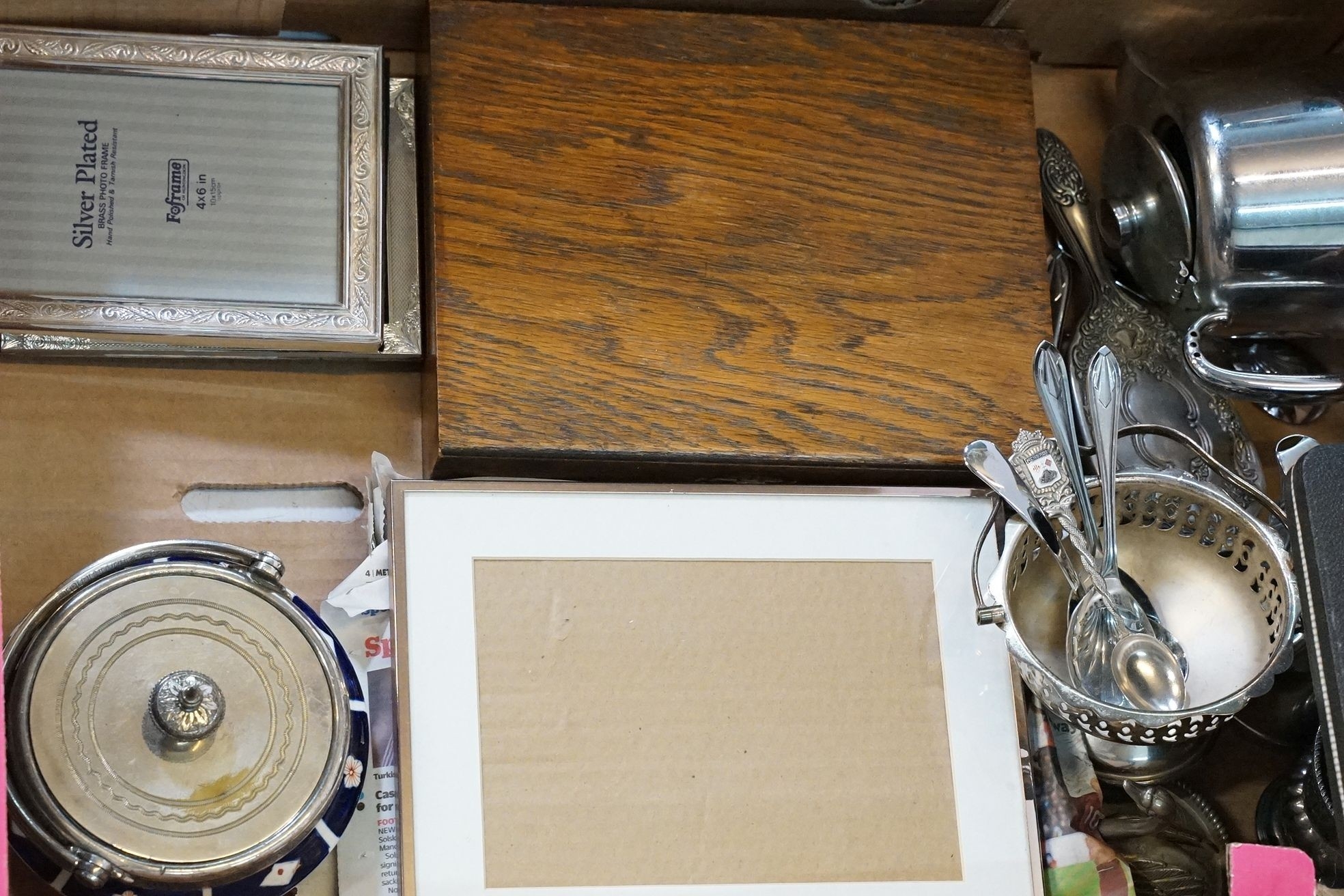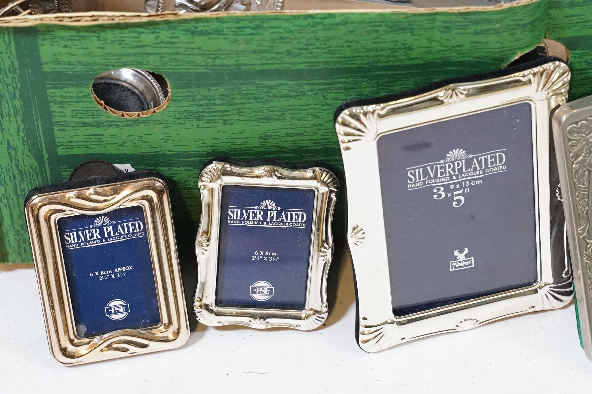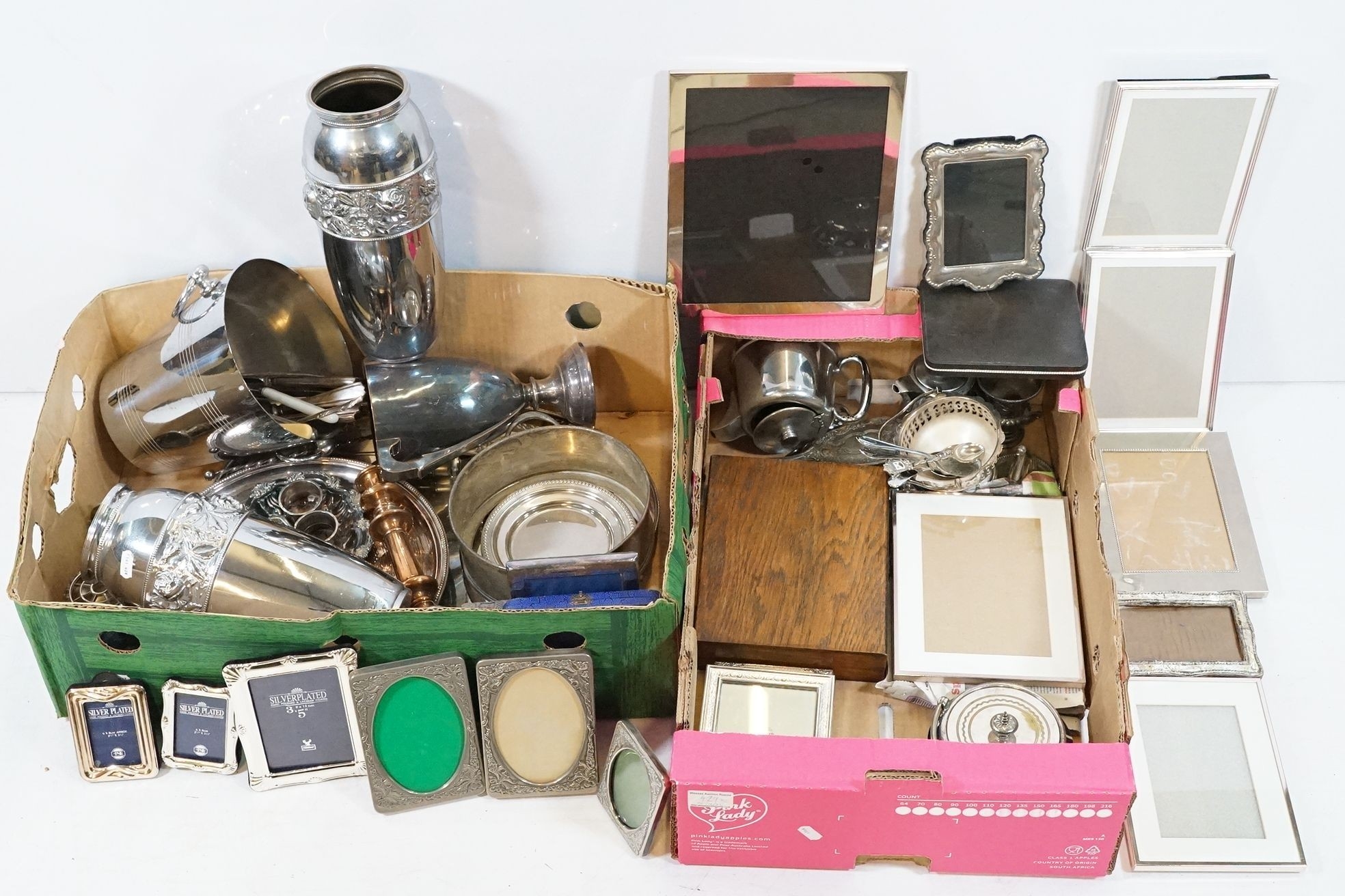 Collection of silver-plate, to comprise photo frames, one silver example, vases, cased flatware, etc. (two boxes)