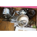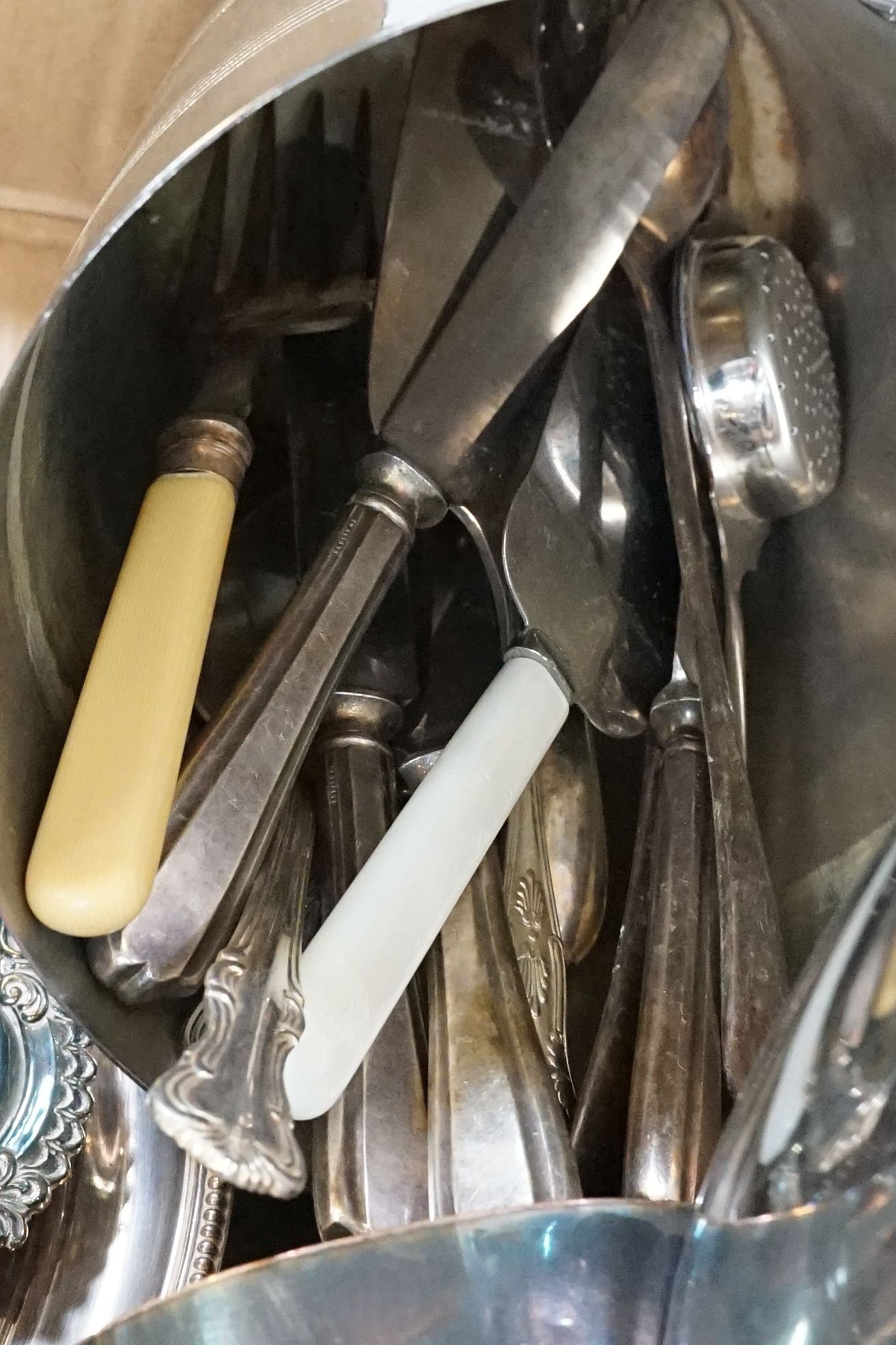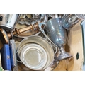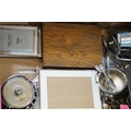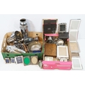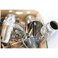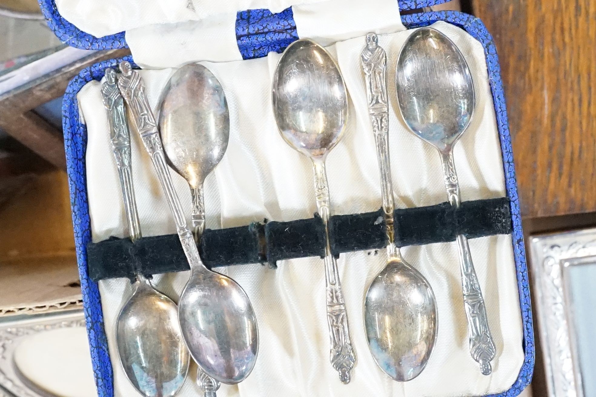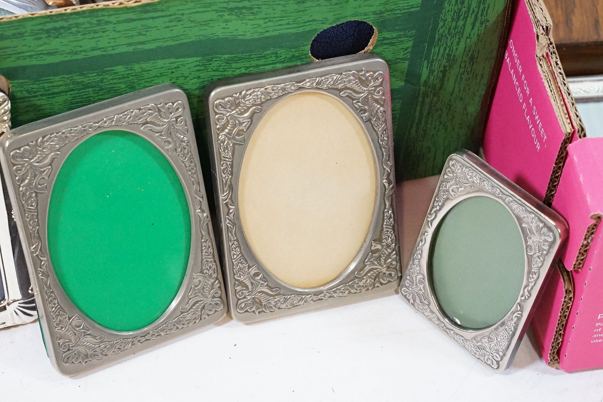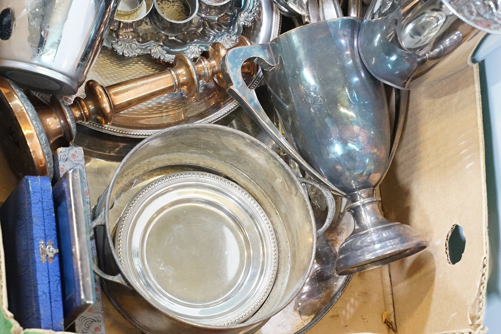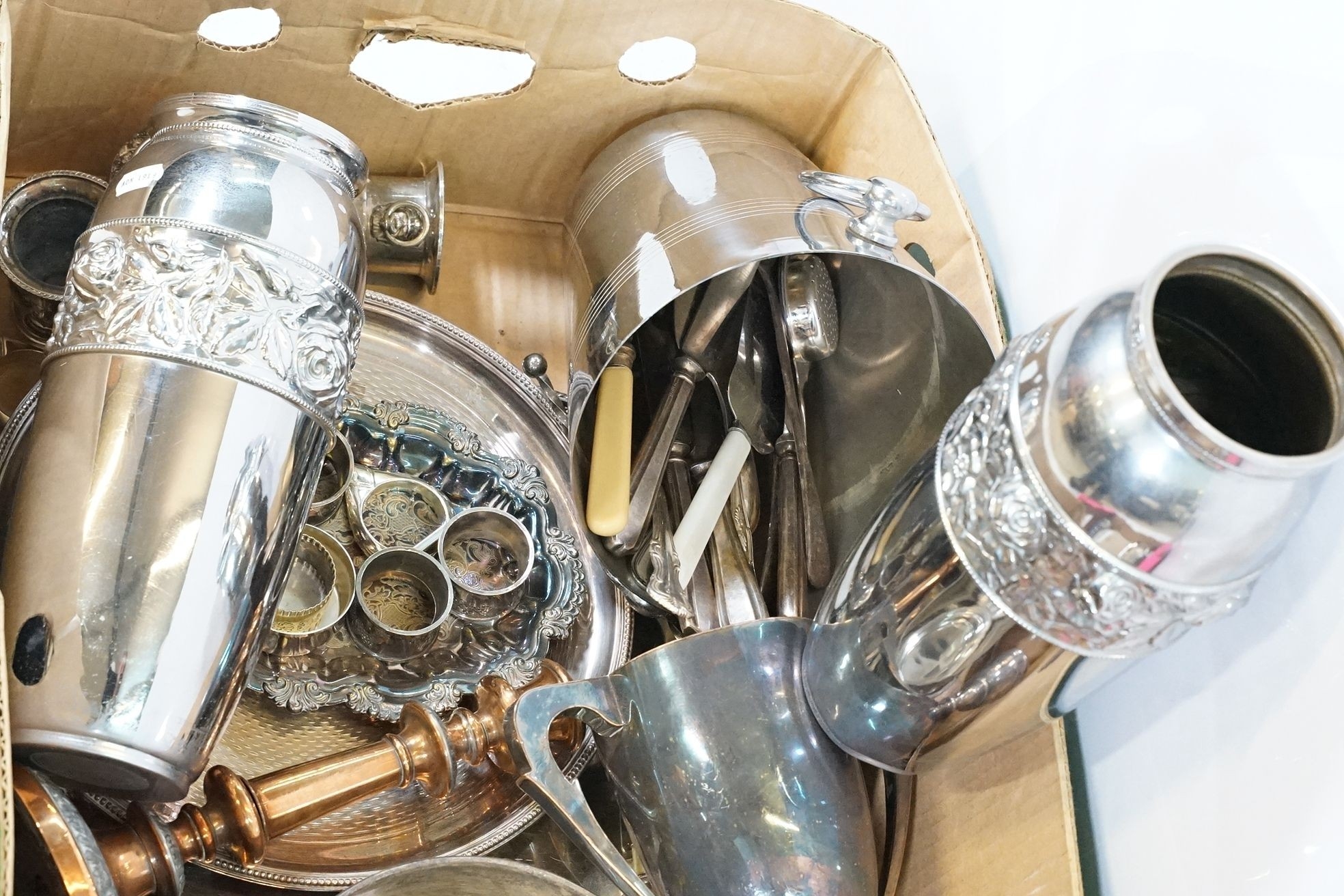 Collection of silver-plate, to comprise photo frames, one silver example, vases, cased flatware, etc. (two boxes)