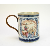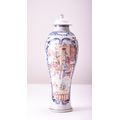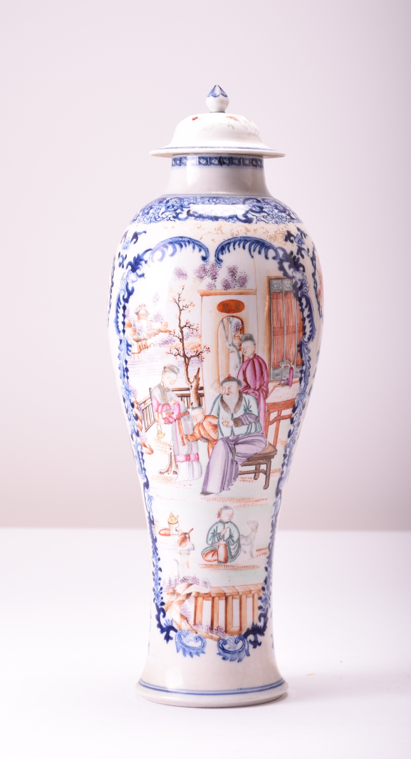 A Chinese enamelled blue and white vase and cover, 18th century Of slender baluster form and decorated with a scene of high-status figures at leisure in a formal garden beside a river. 41cm high Property of a deceased estate in Shrewsbury.