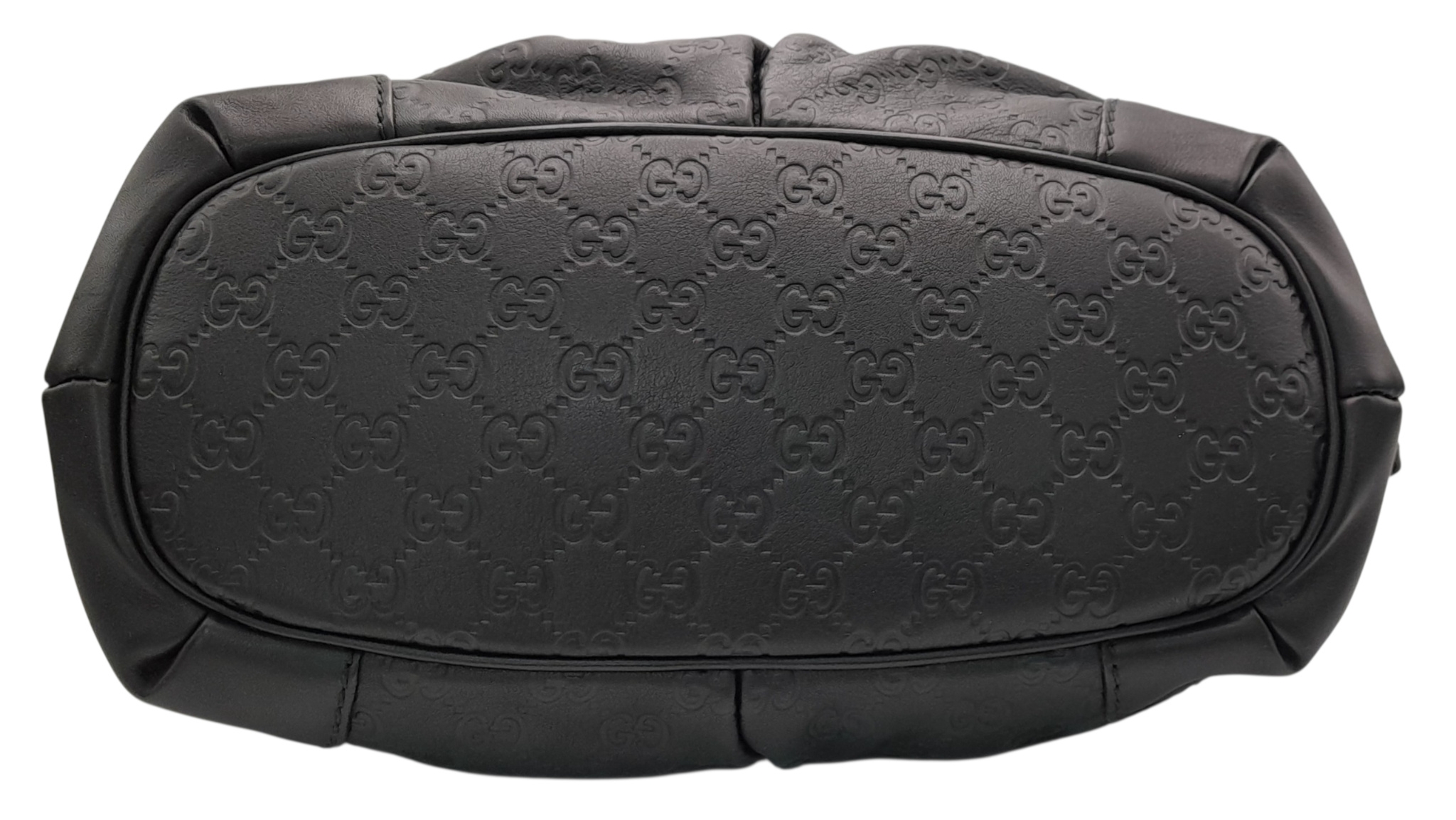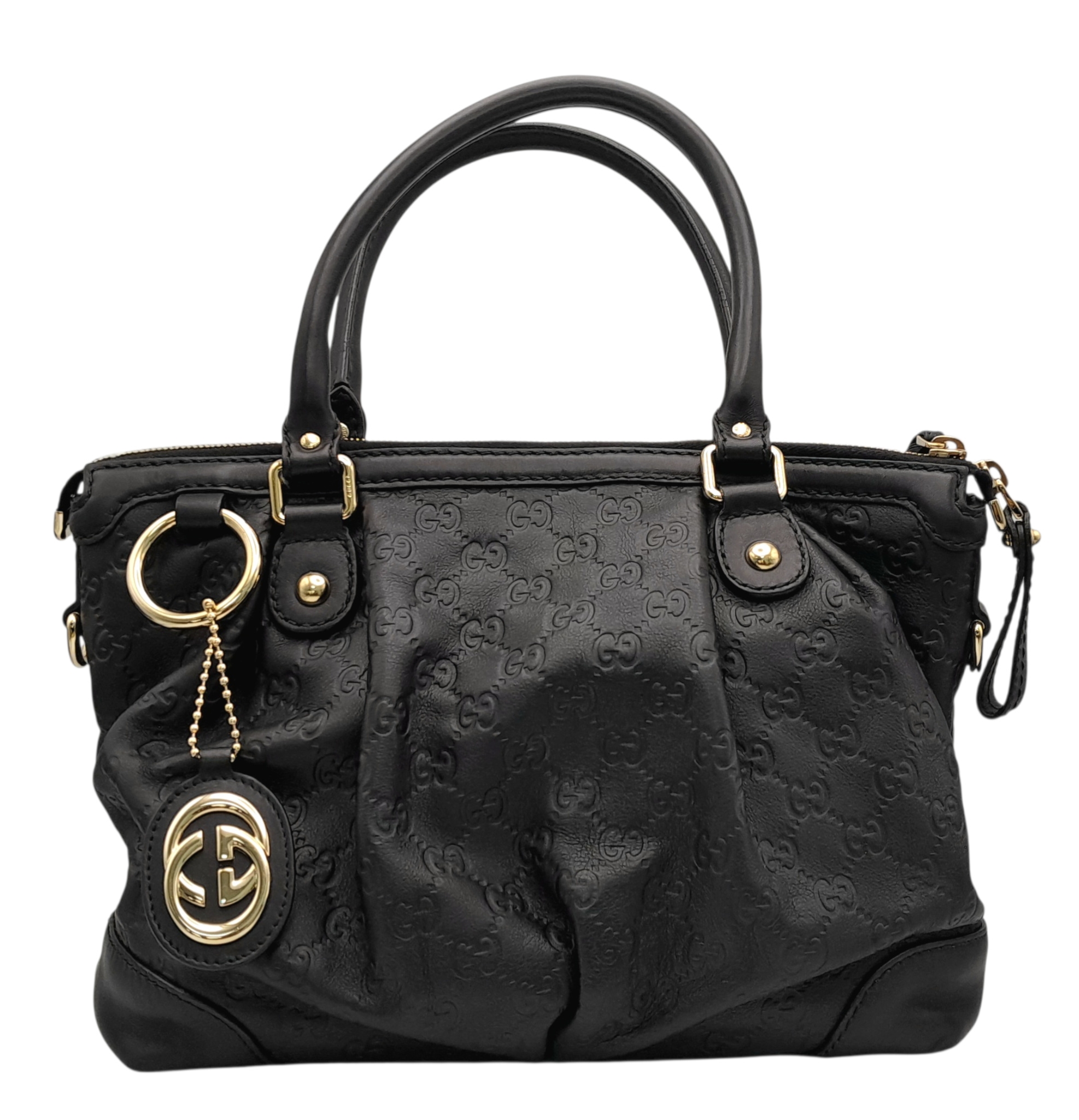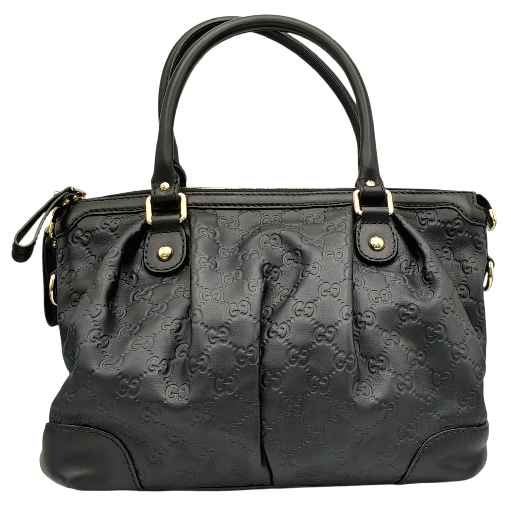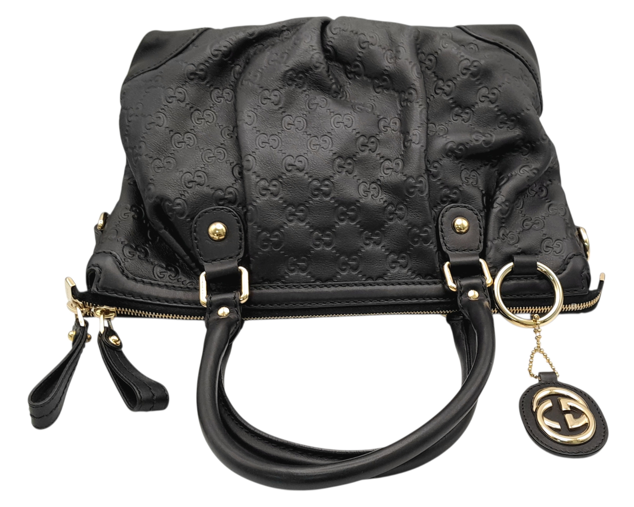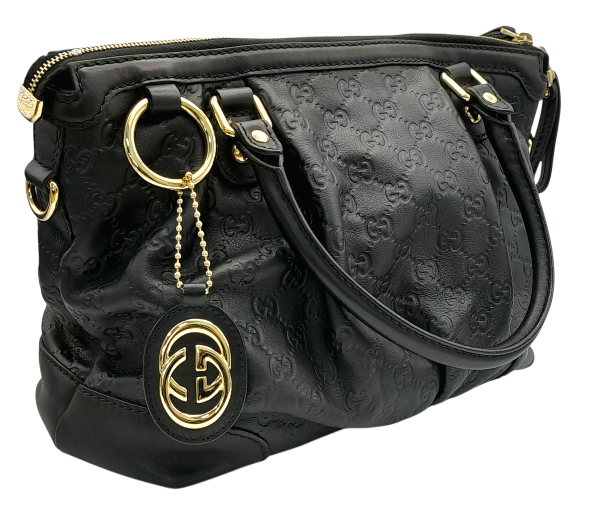 A Gucci Guccissima Sukey Handbag. Black GG monogram embossed leather exterior with silver-tone hardware, rolled leather top handles, detachable Gucci charm and zipped top closure. Beige fabric interior with a zipped inner side pocket and two open inner side pockets. Comes with a certificate of authenticity. Size approx: 34cm length x 23.5cm height. In good condition overall but Please see photos for details or request a condition report. Ref: 27506