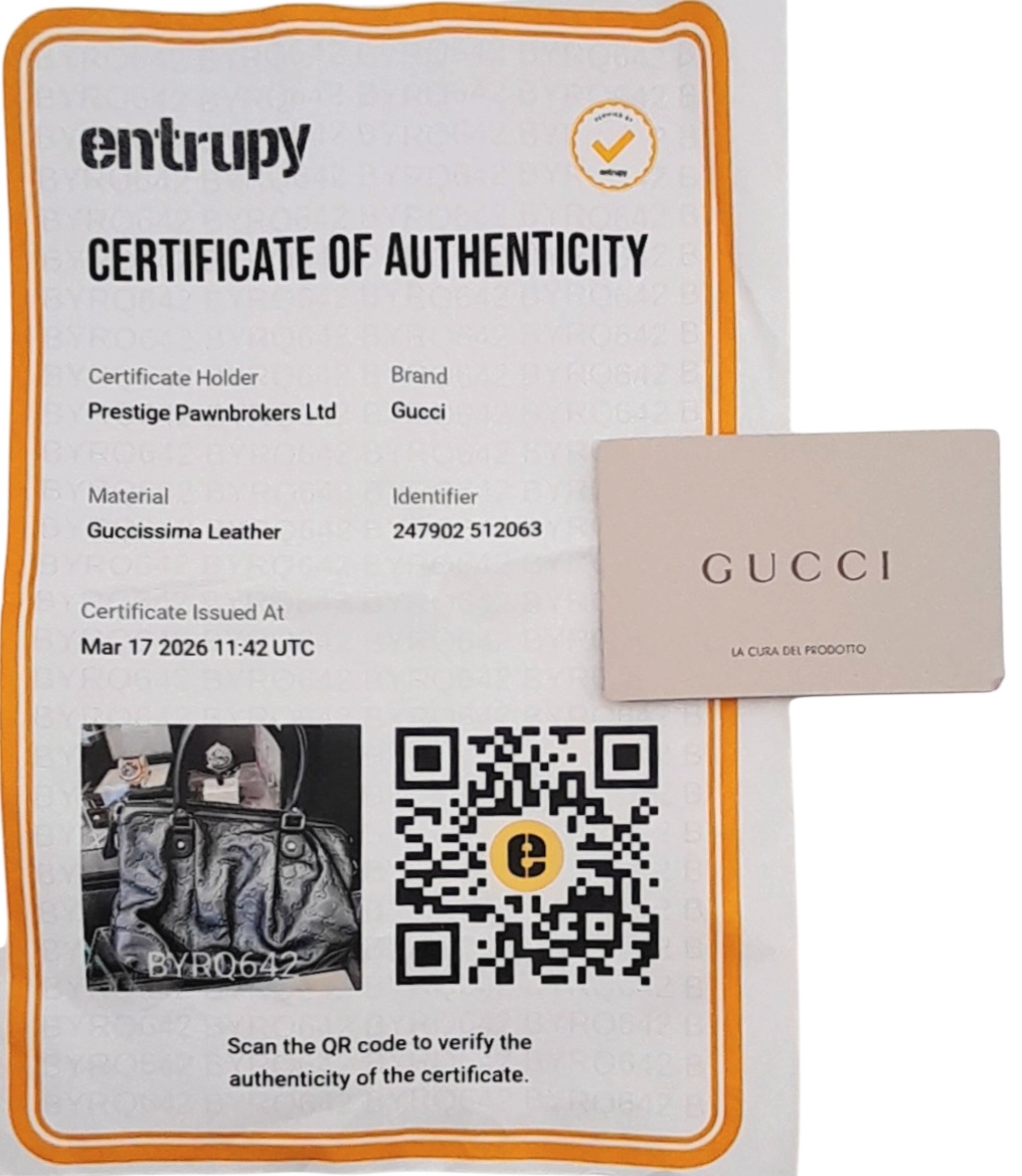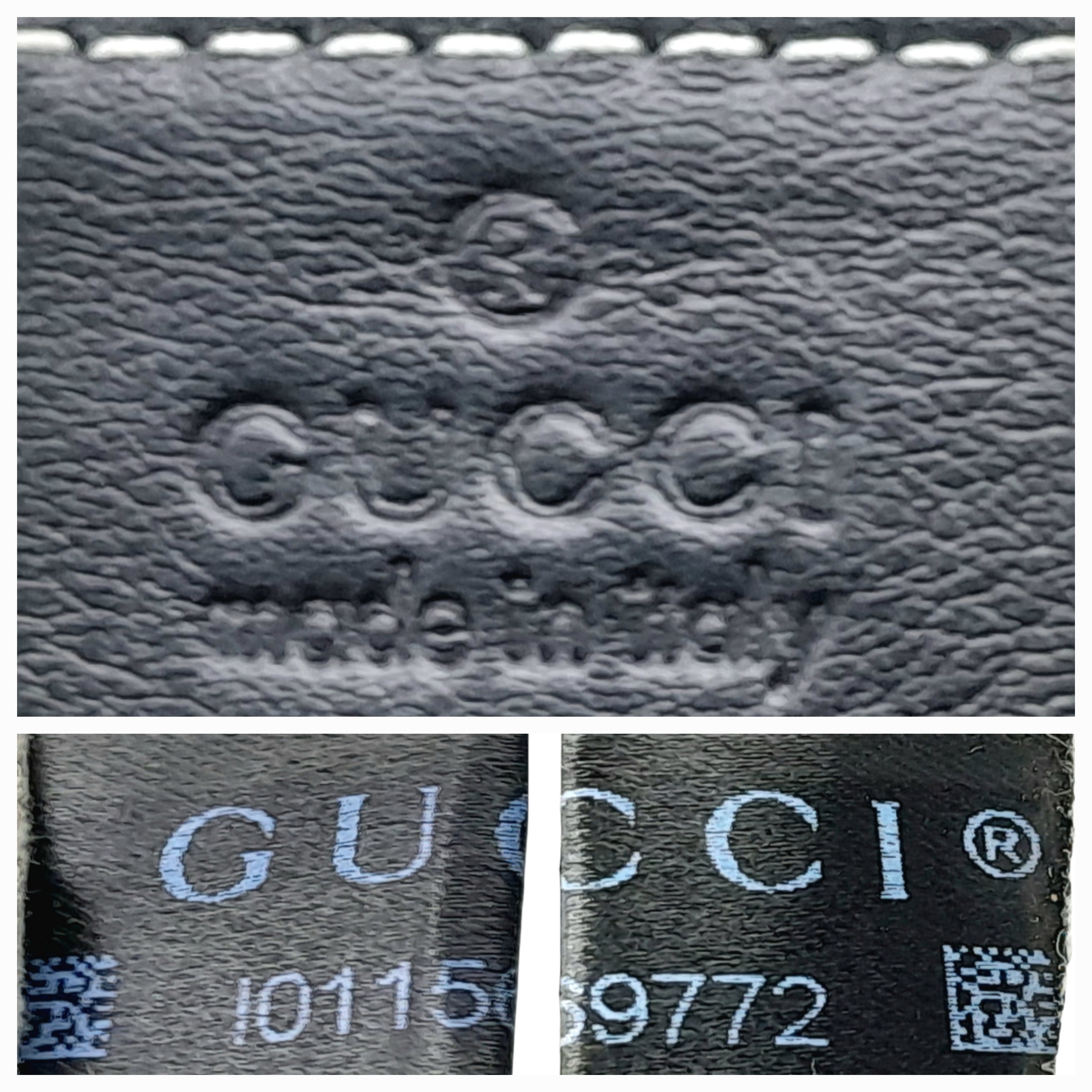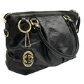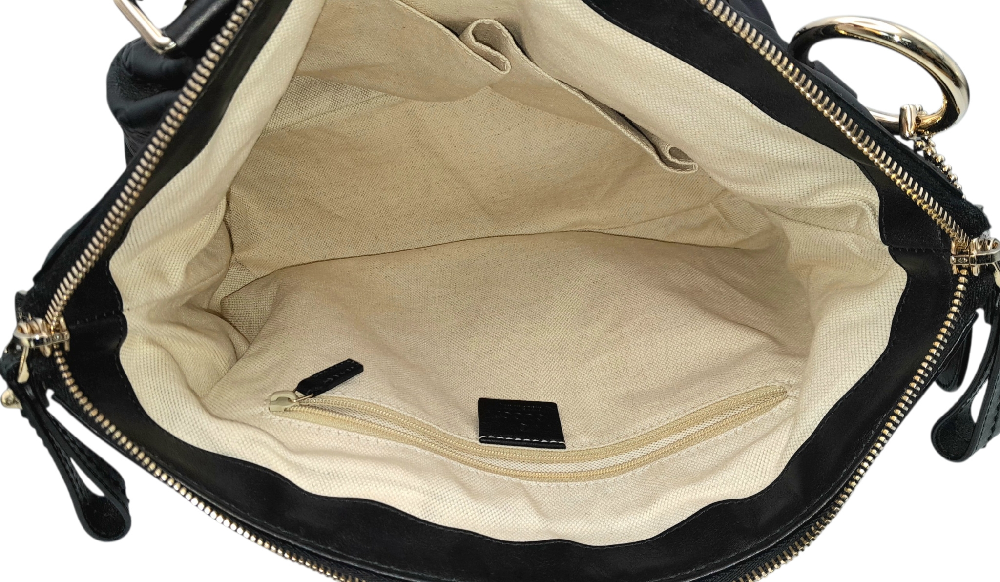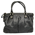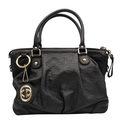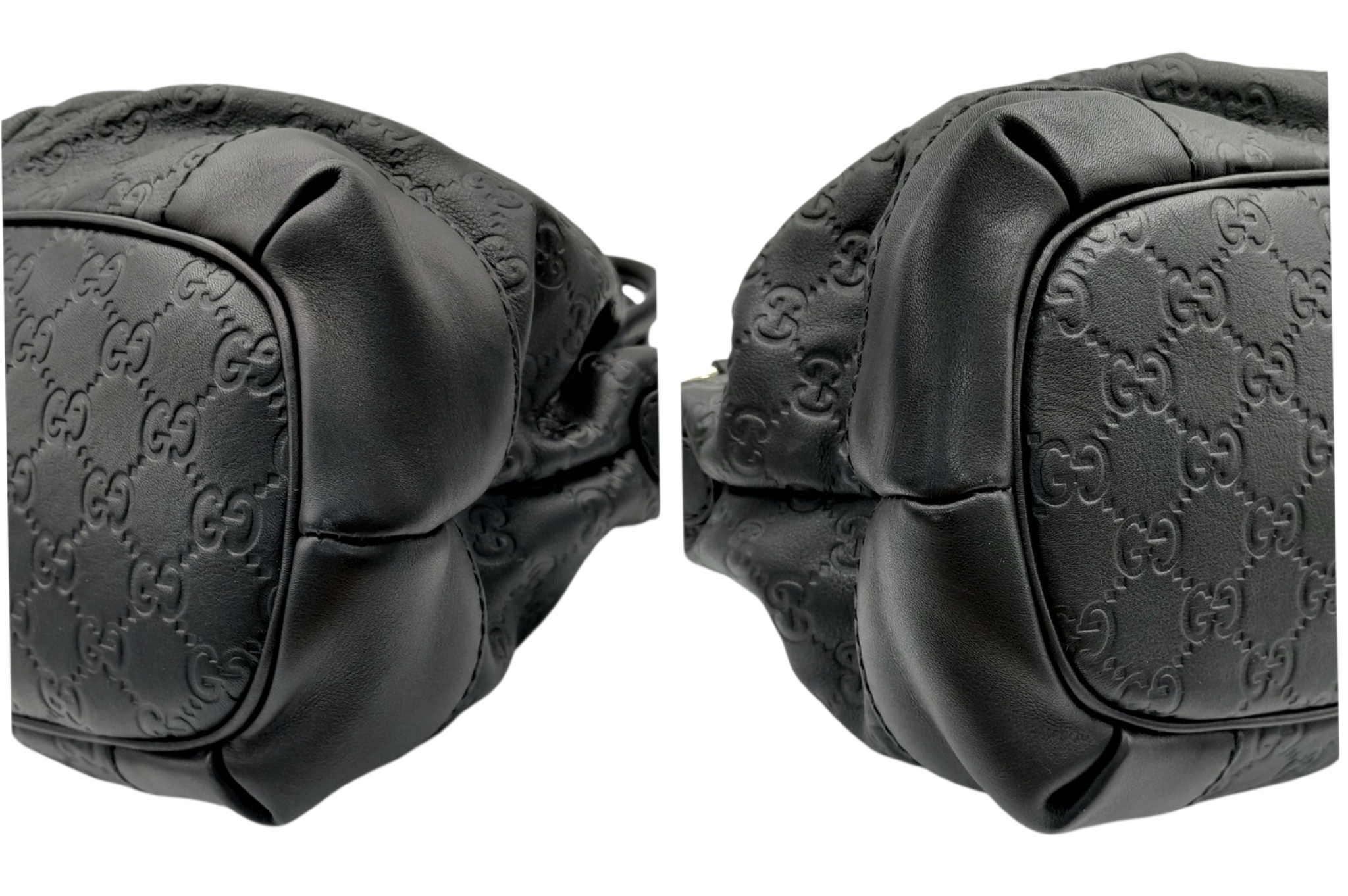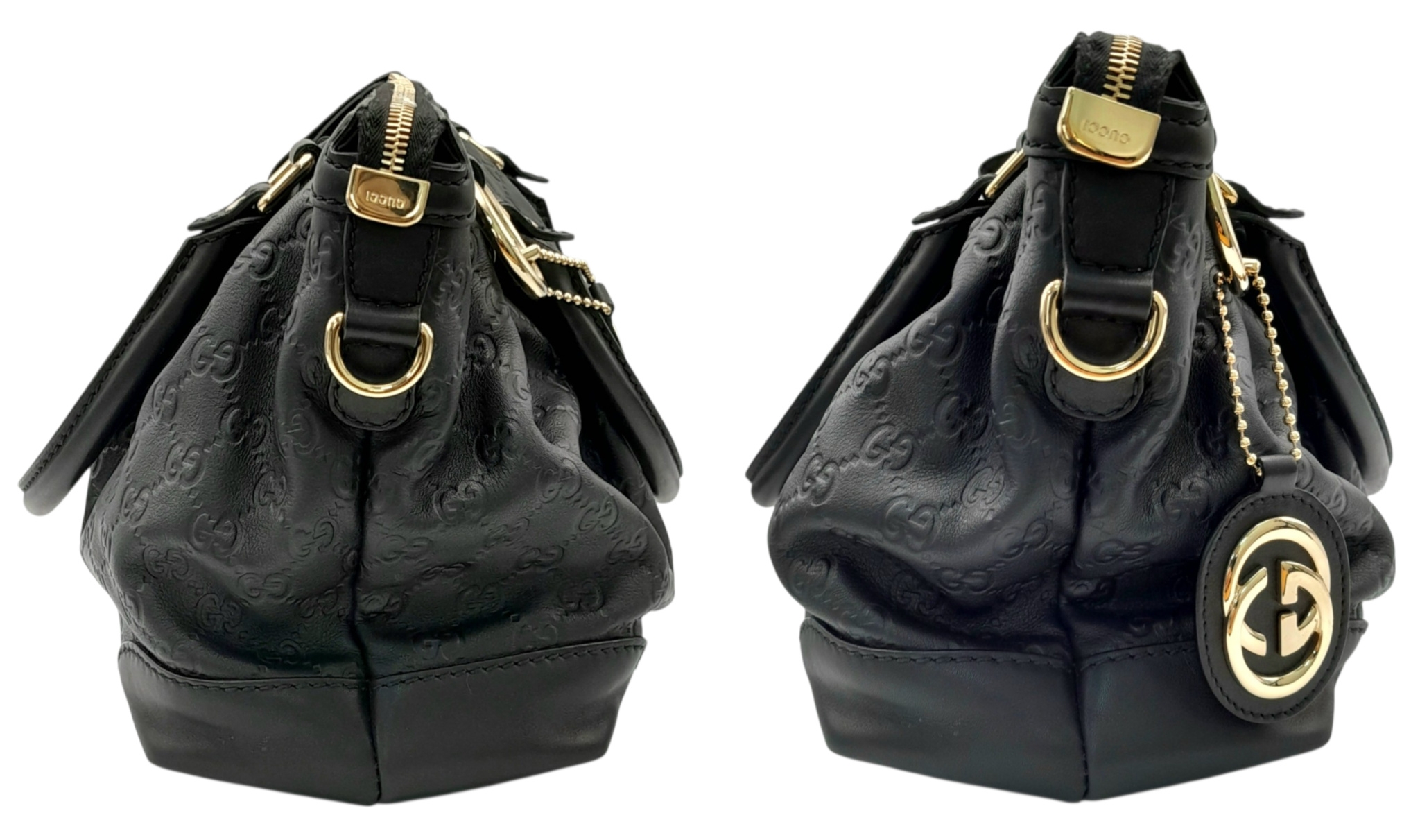 A Gucci Guccissima Sukey Handbag. Black GG monogram embossed leather exterior with silver-tone hardware, rolled leather top handles, detachable Gucci charm and zipped top closure. Beige fabric interior with a zipped inner side pocket and two open inner side pockets. Comes with a certificate of authenticity. Size approx: 34cm length x 23.5cm height. In good condition overall but Please see photos for details or request a condition report. Ref: 27506