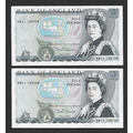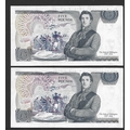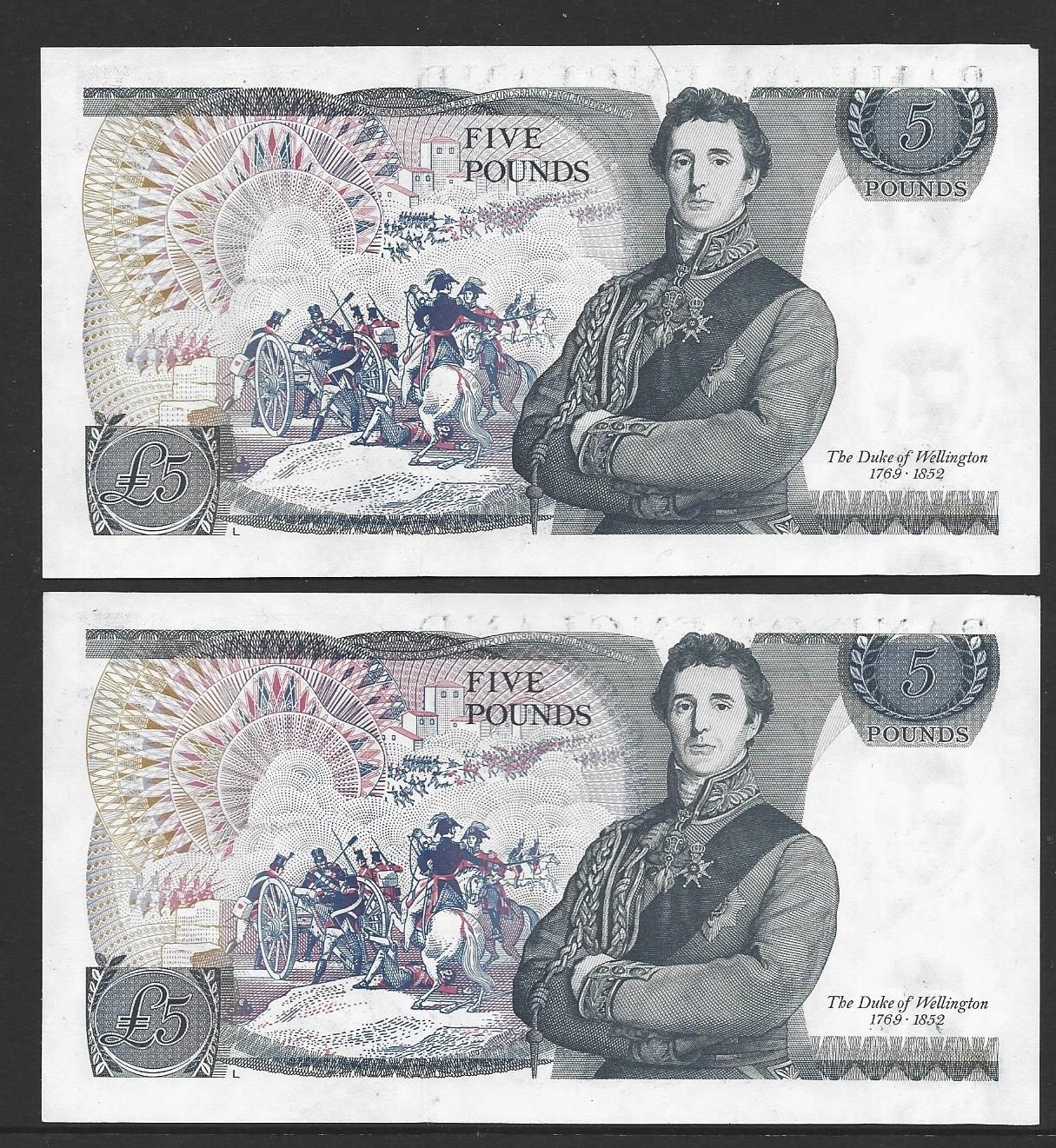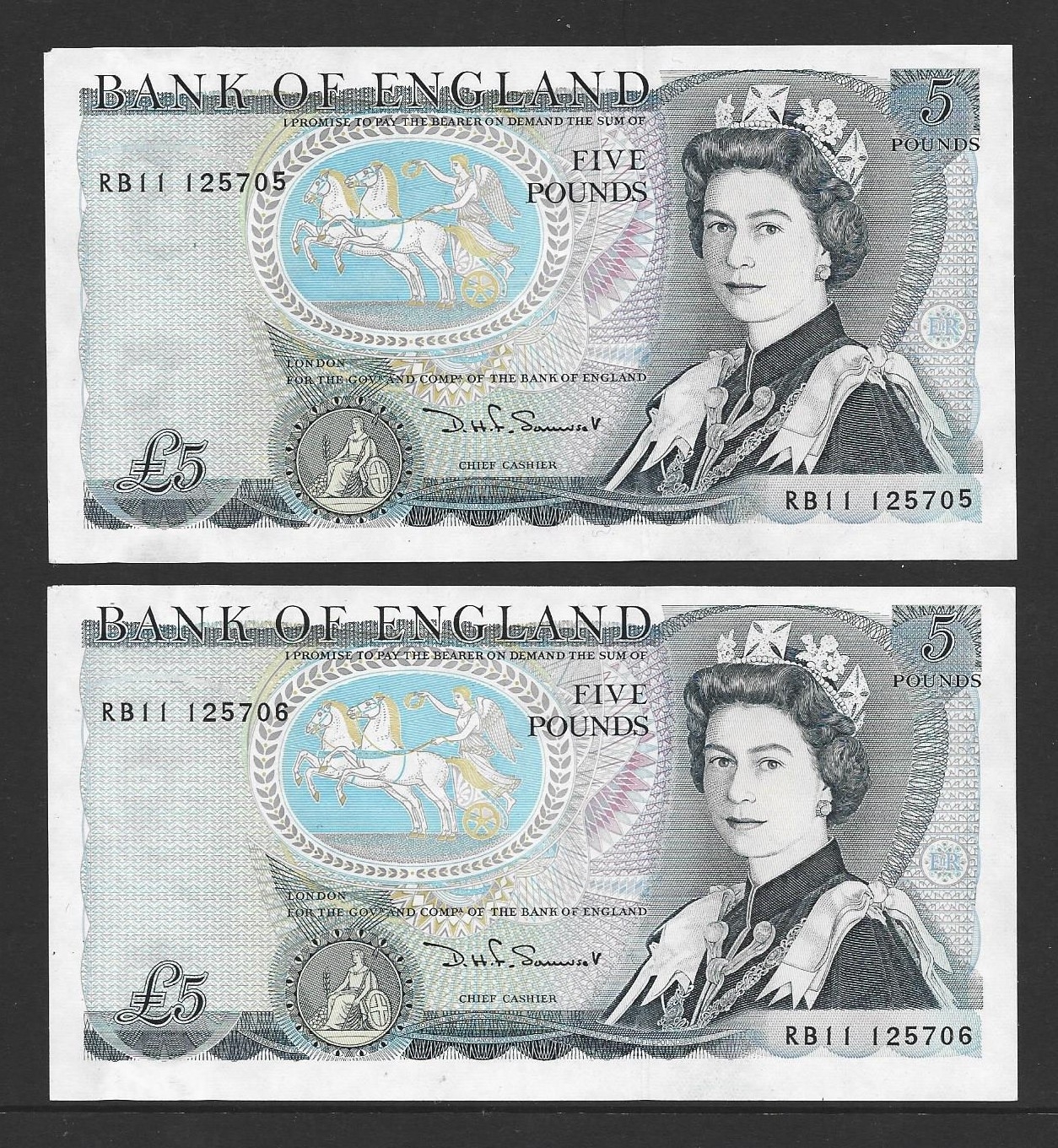 BANKNOTES. United Kingdom, Bank of England, 2x 5 Pounds, ND(1987), sign. D.H.F. SOMERSET, Duggleby-B345 (BE116b), consecutive serial numbers RB11 125705 and RB11 125706, EF, tiny corner tear to upper left corners. (2)
