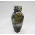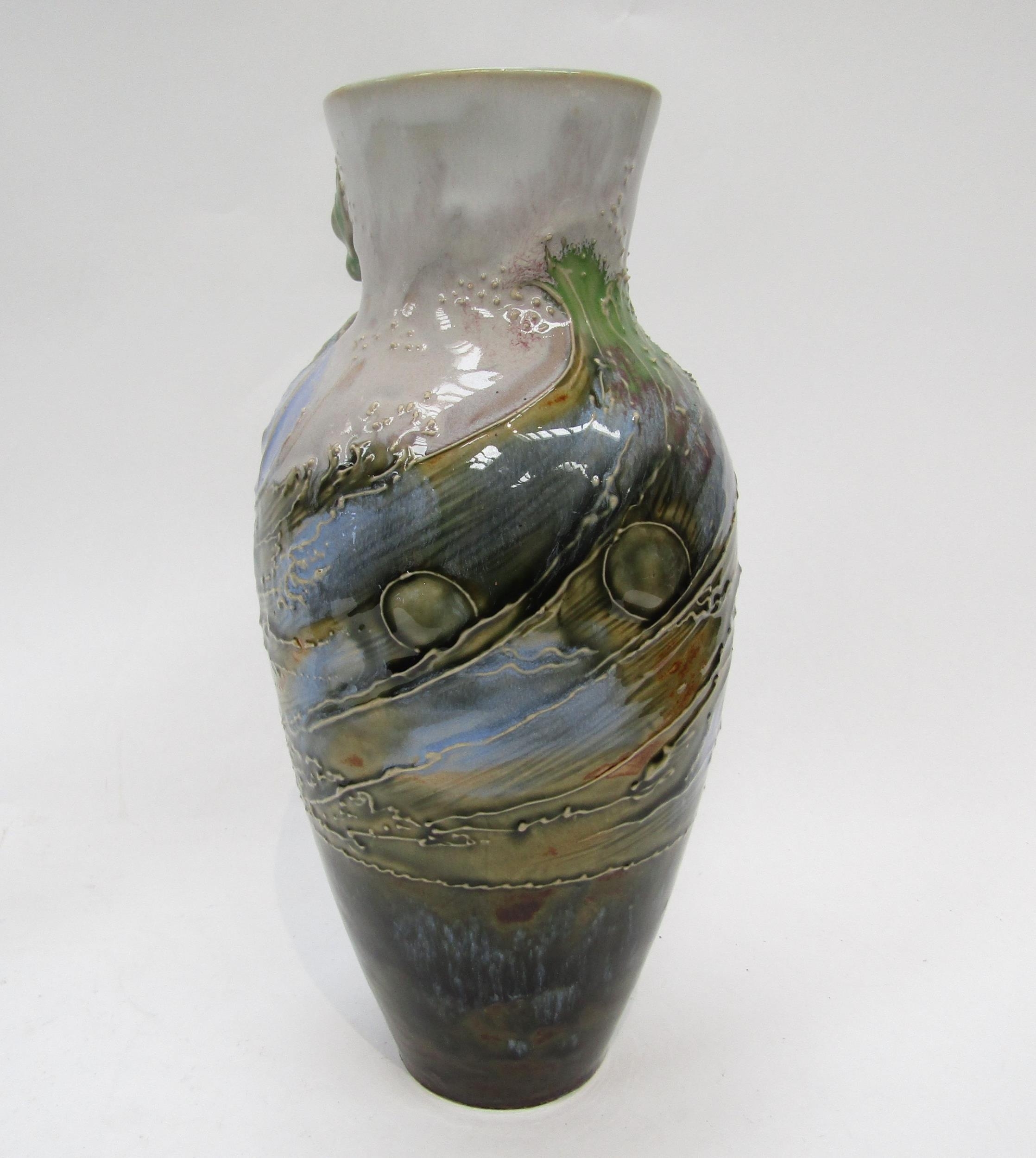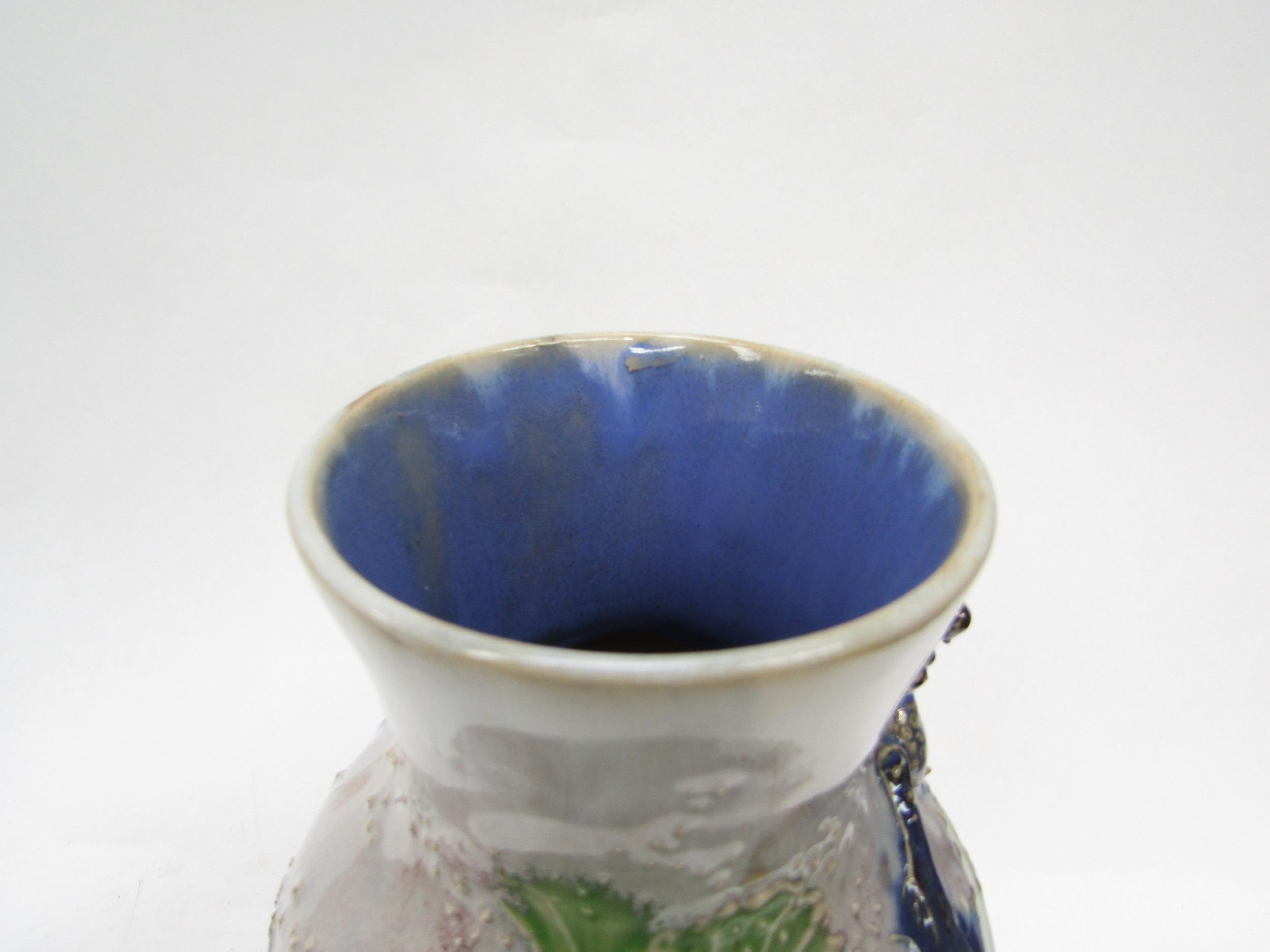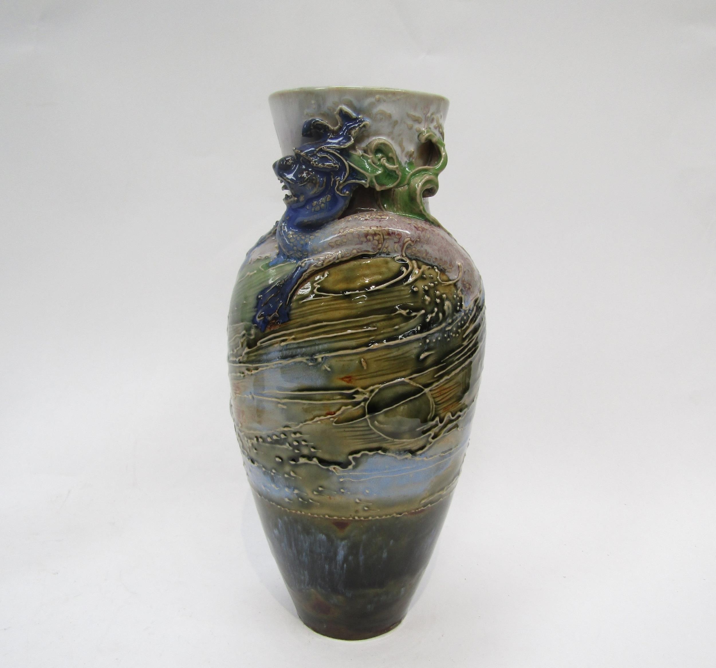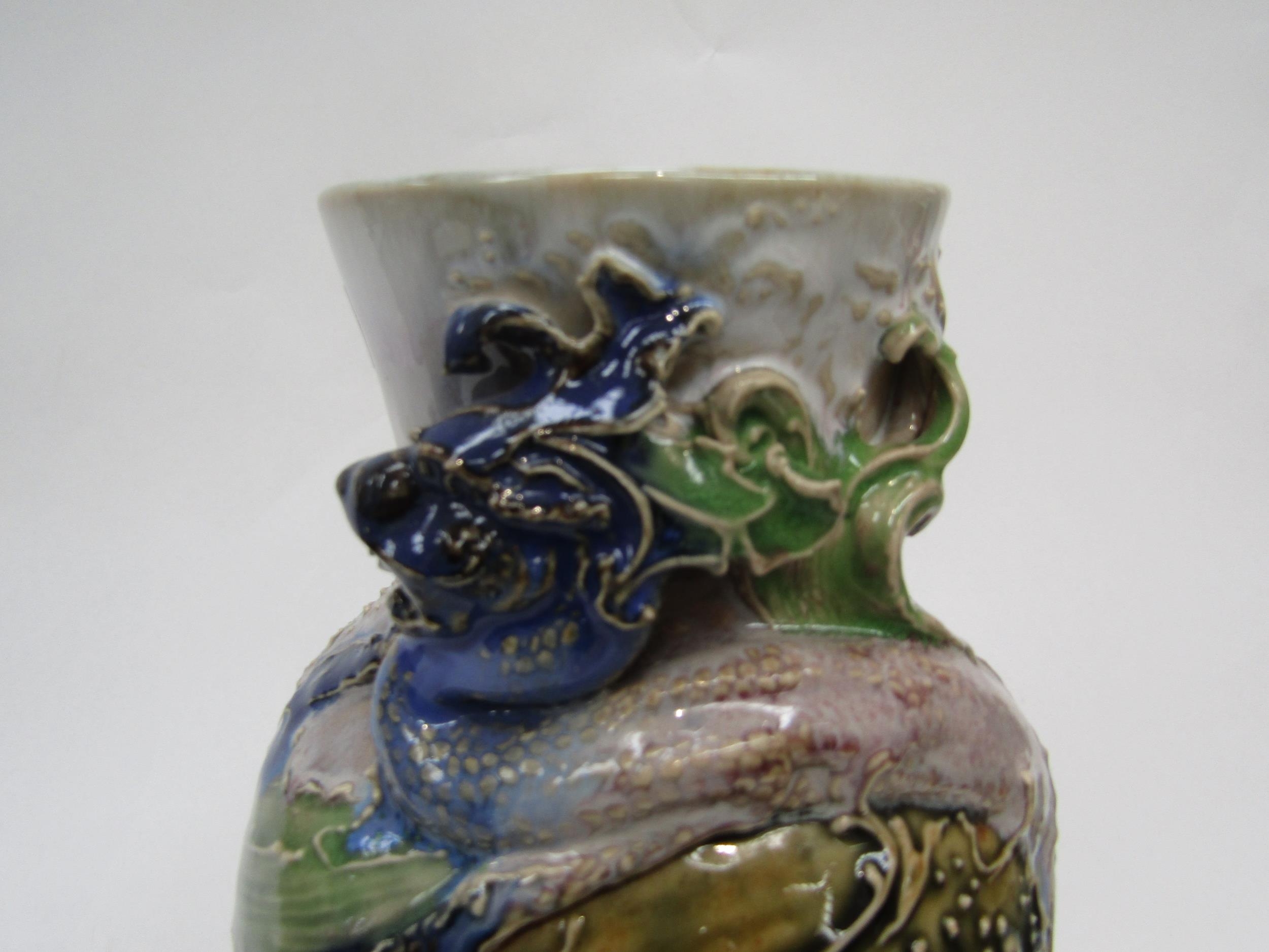 A Royal Doulton Mark V Marshall vase decorated with a dragon in high relief, two pearls and wave detail, 27.5cm tall