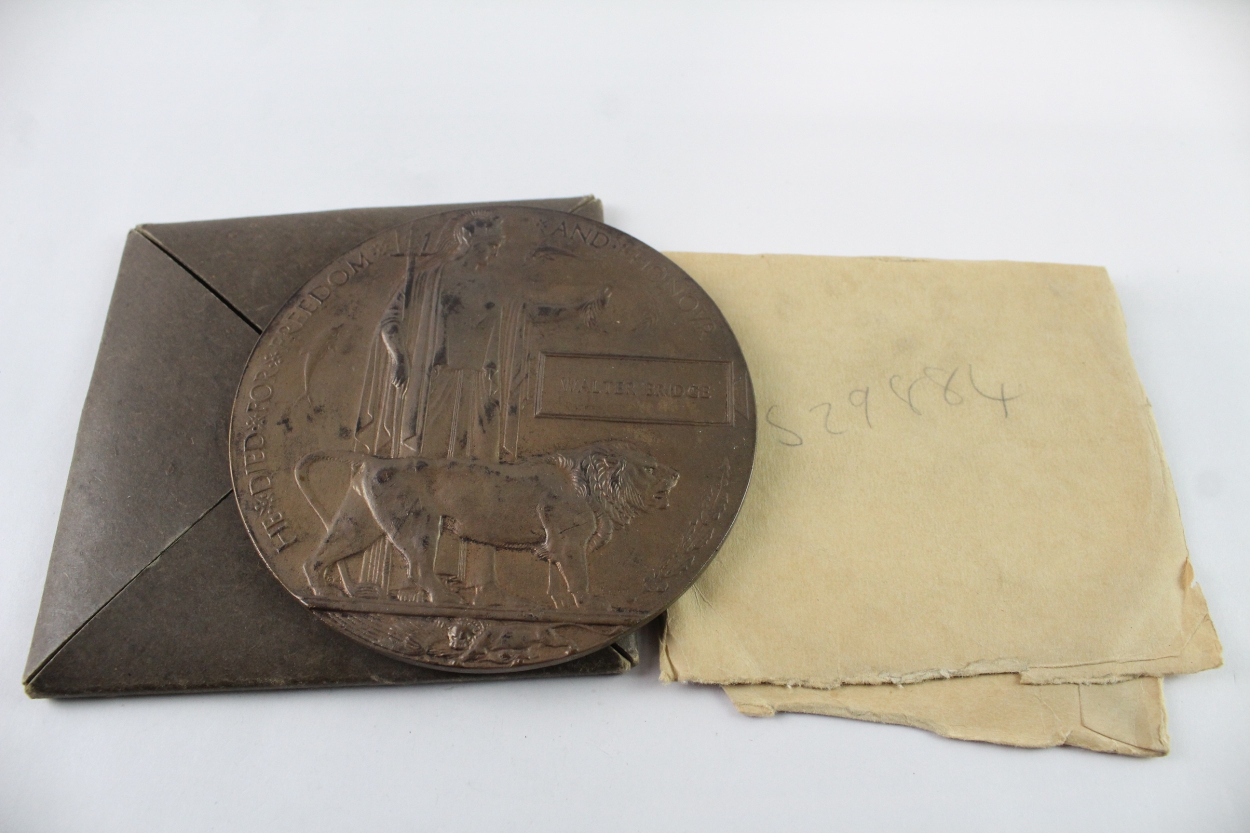 WW1 Death Plaque, Card Holder & Envelope Named To Walter Bridge