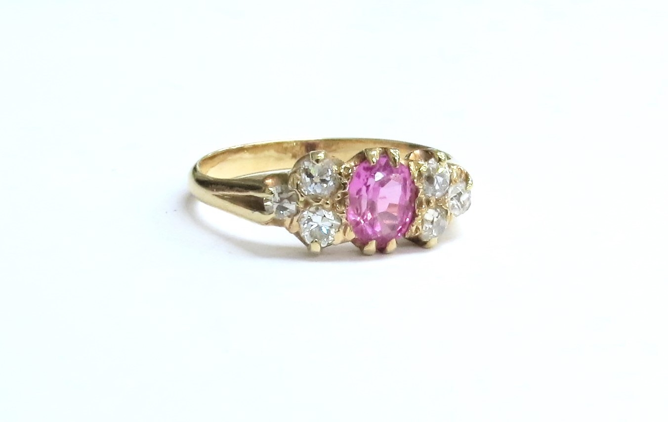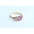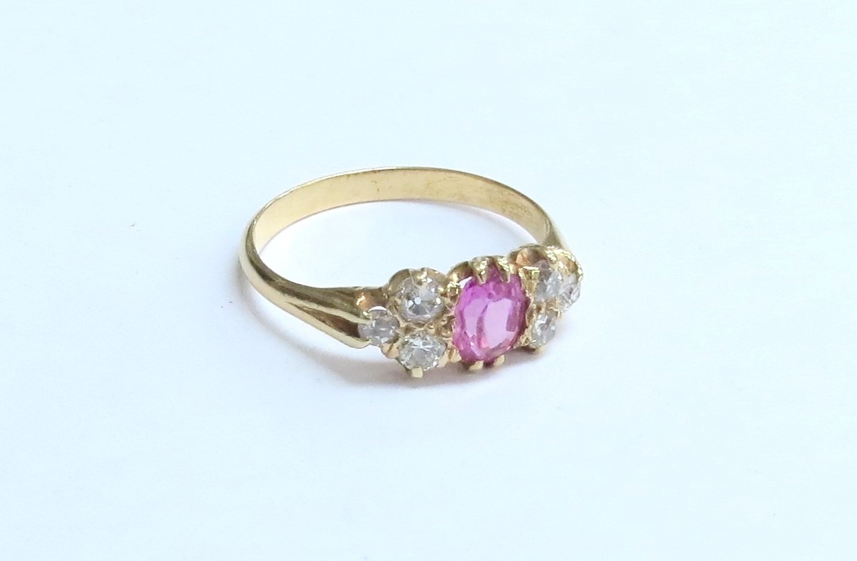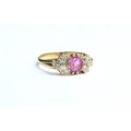 An unmarked gold ring centrally set with a pink stone flanked by three diamonds. Size M, 2.7g
