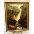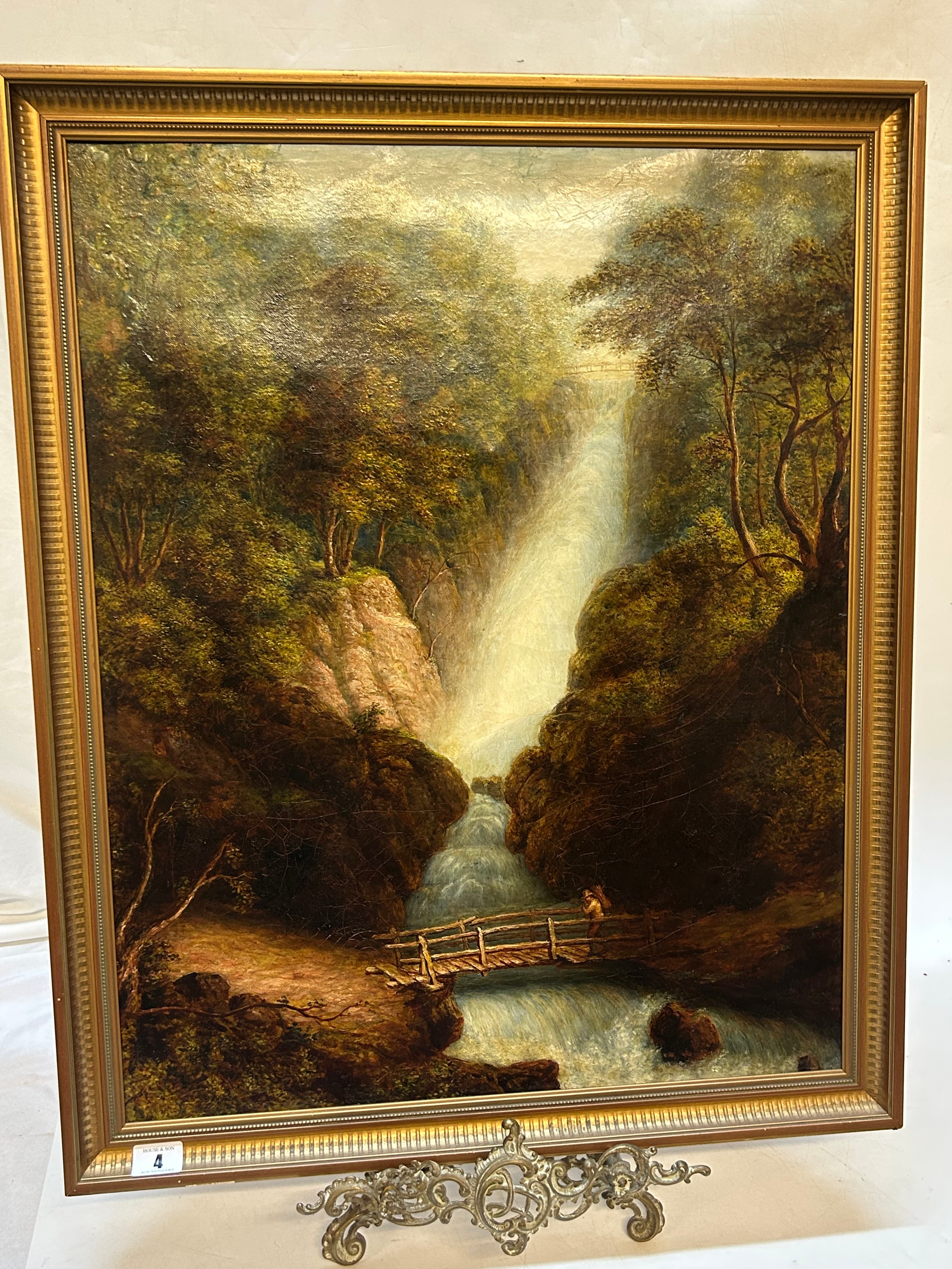 A 19th Century oils on canvas - Figure on a bridge before a waterfall, framed - 23 1/2in. x 19in.