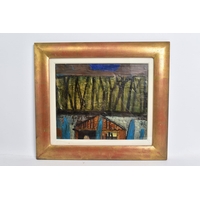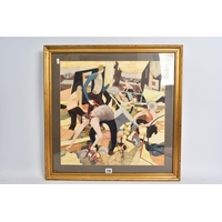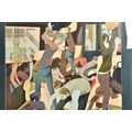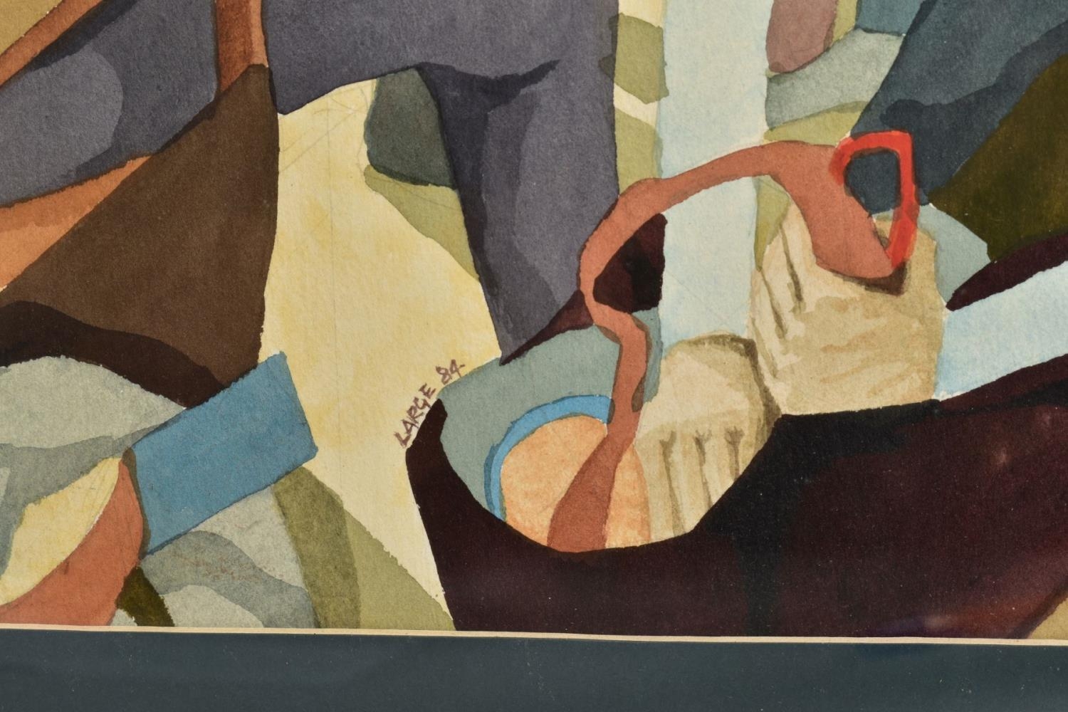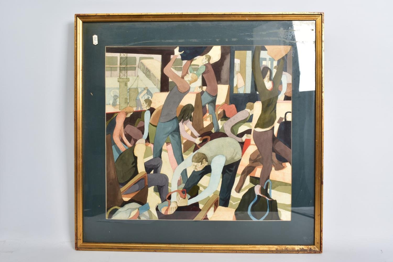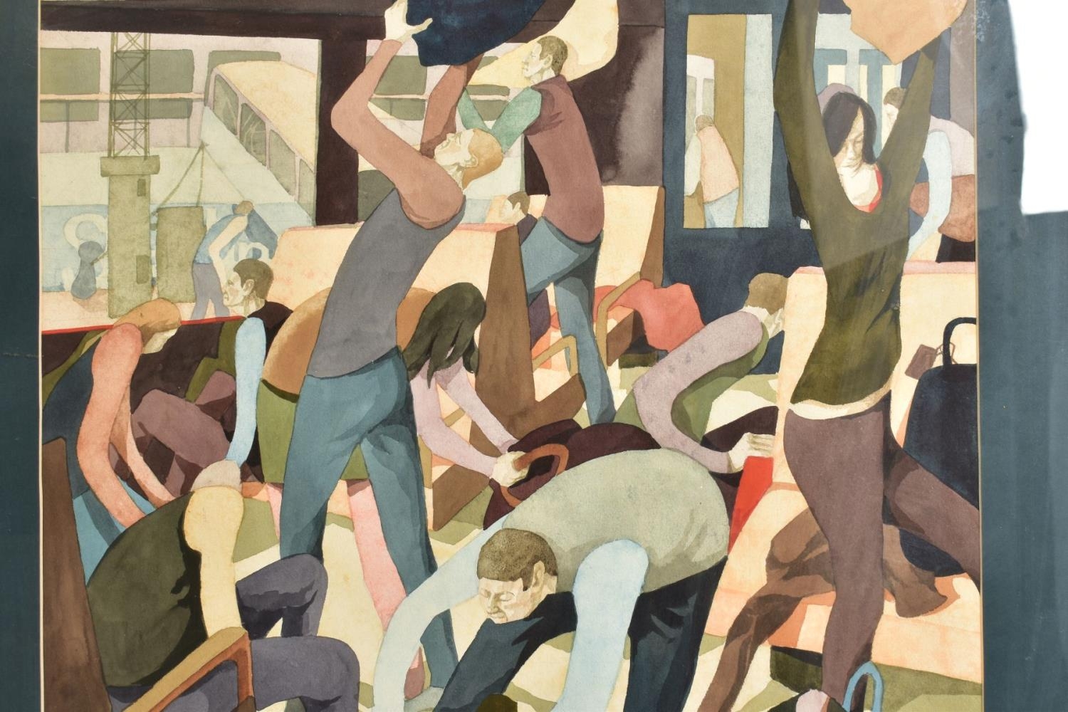 GEORGE LARGE (BRITISH 1936) UNTITLED, Passengers on a ferry stowing luggage, signed and dated (19)84, no information verso, watercolour on paper, framed, approximate size 45cm x 48cm (A) (condition:- painting is in good condition, frame is marked in places, backing board is loose)