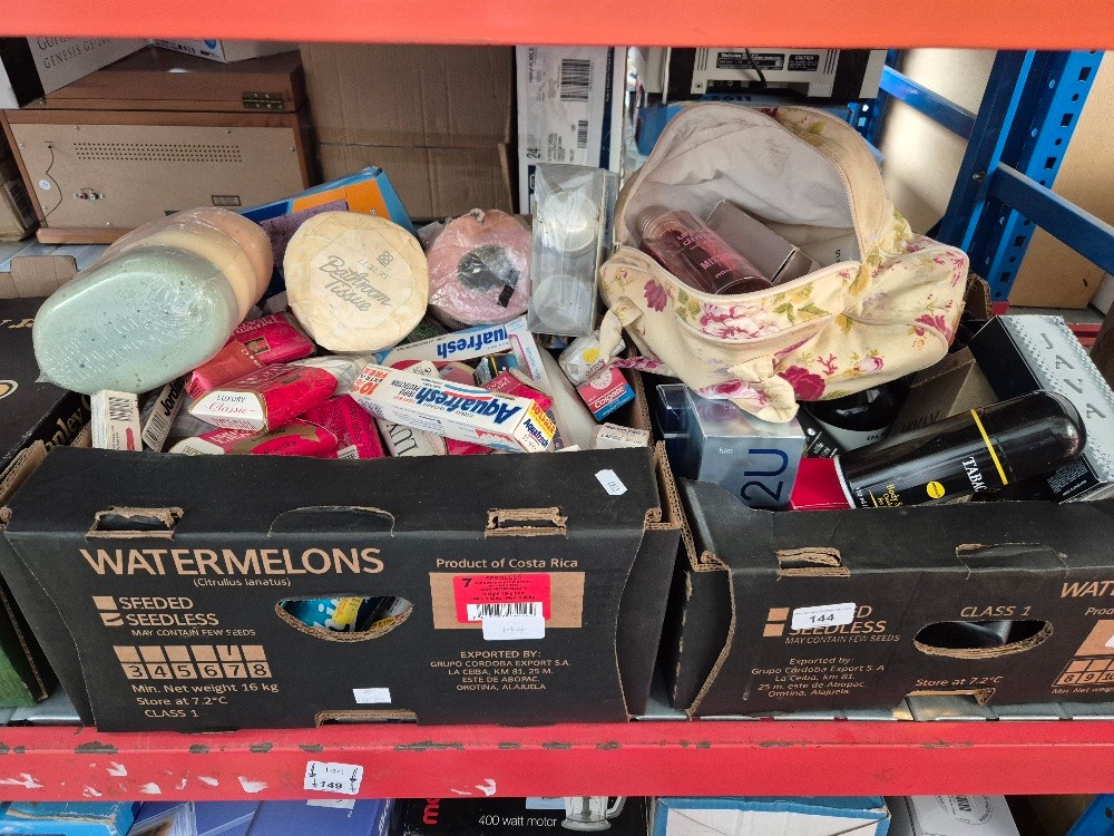 2 boxes of toiletries including shampoos, perfumes, soaps, gift sets and including Calvin Klein, Hilfiger