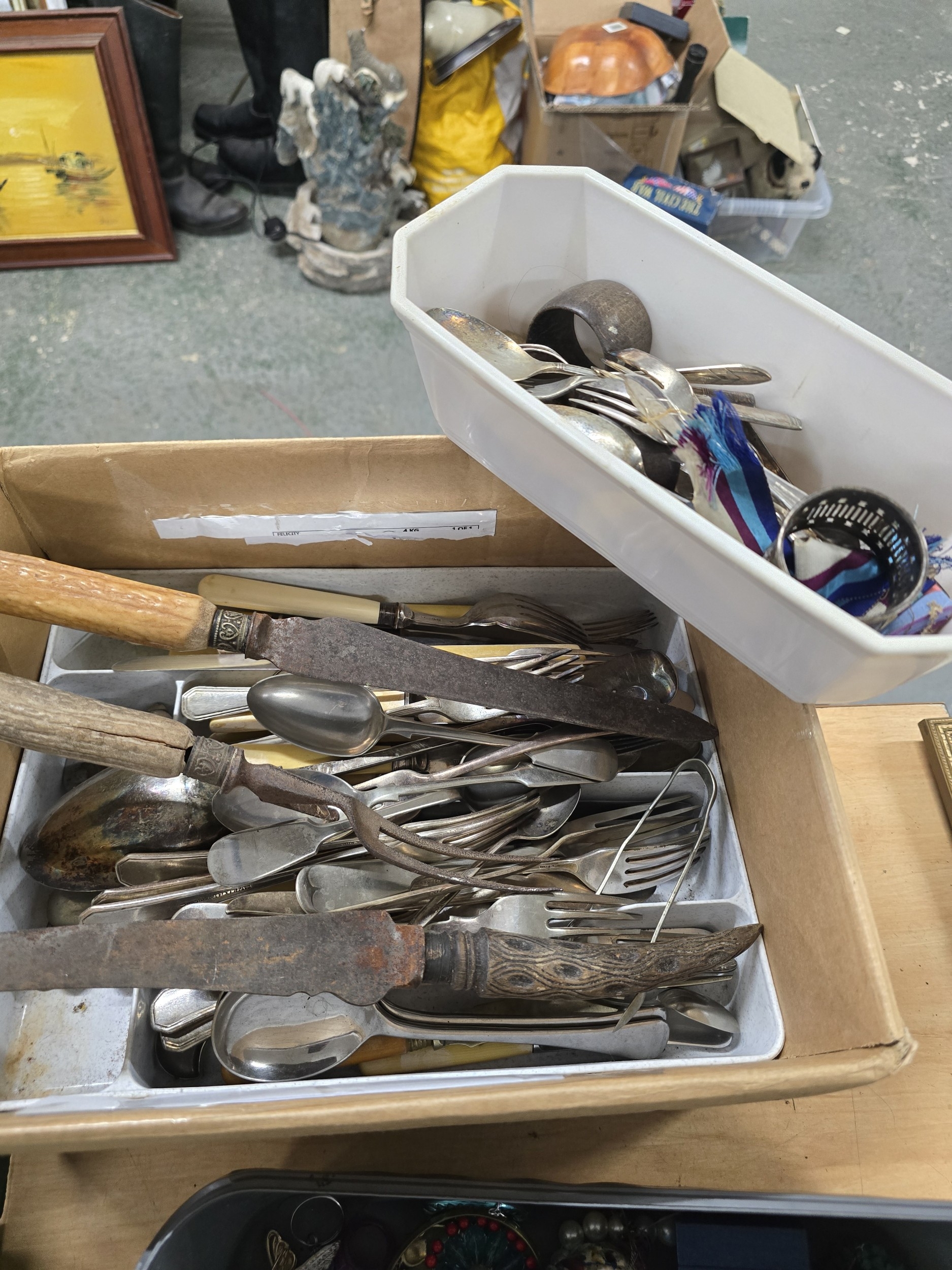 An Assortment of Vintage and Antique Flatware, Napkin Rings, and a Stag Horn Carving Set