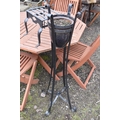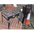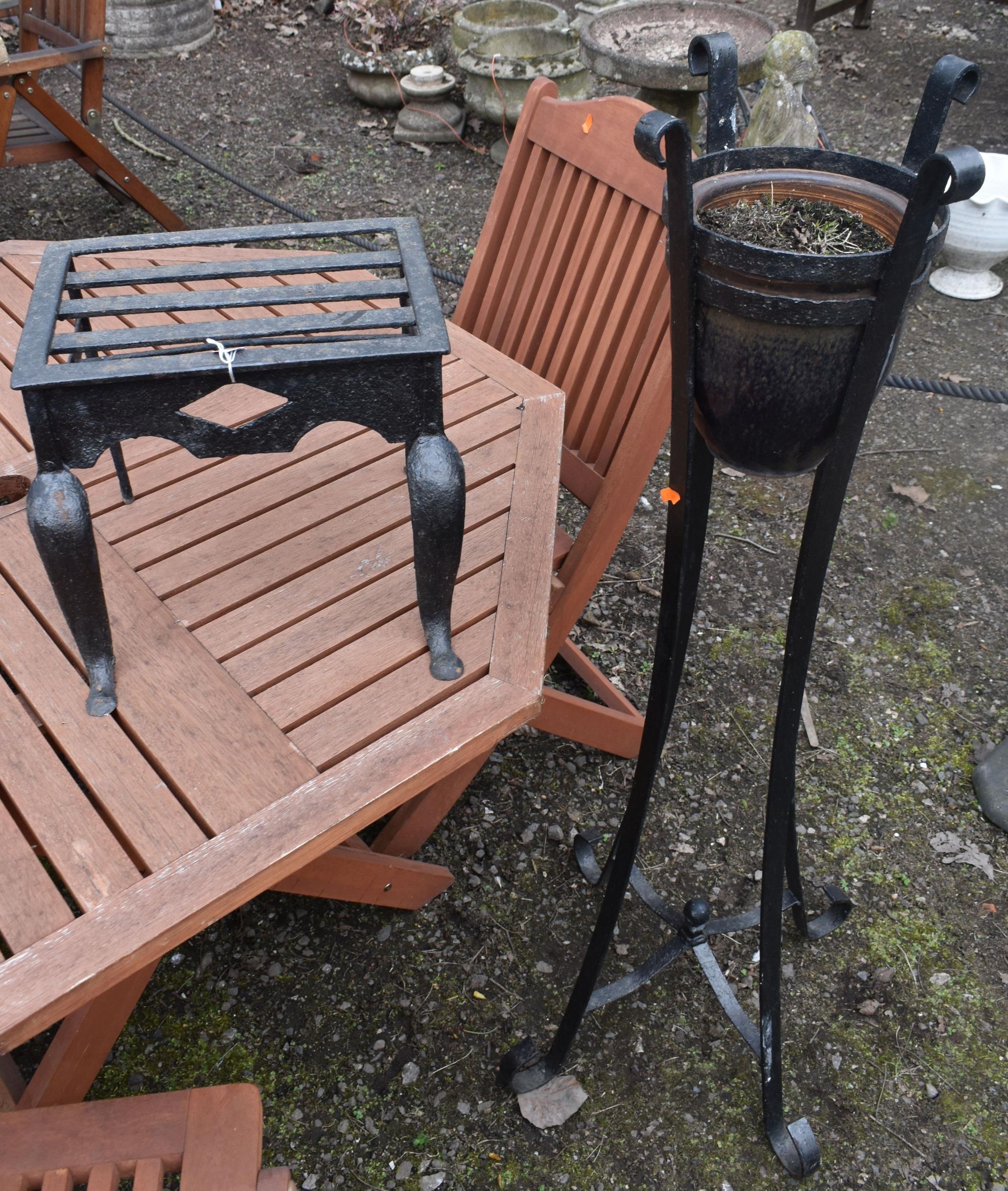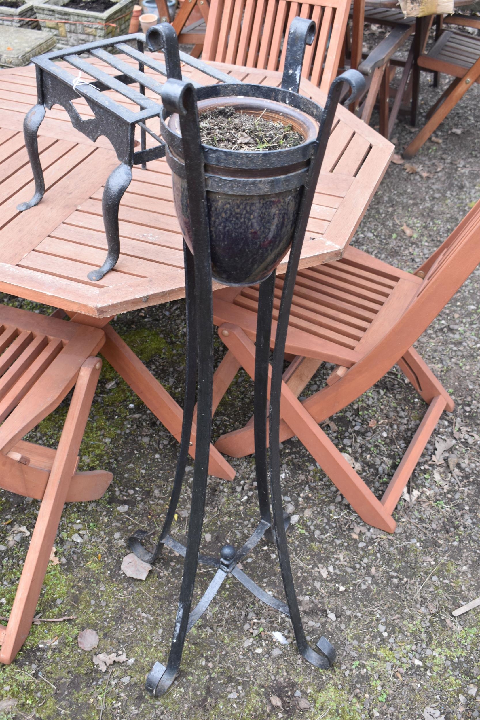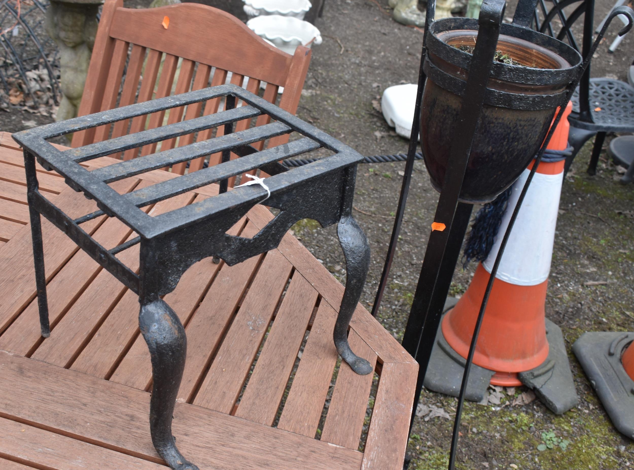 A CAST IRON TRIVET, along with a wrought iron strap work plant stand with a glazed planter, height 117cm (2)