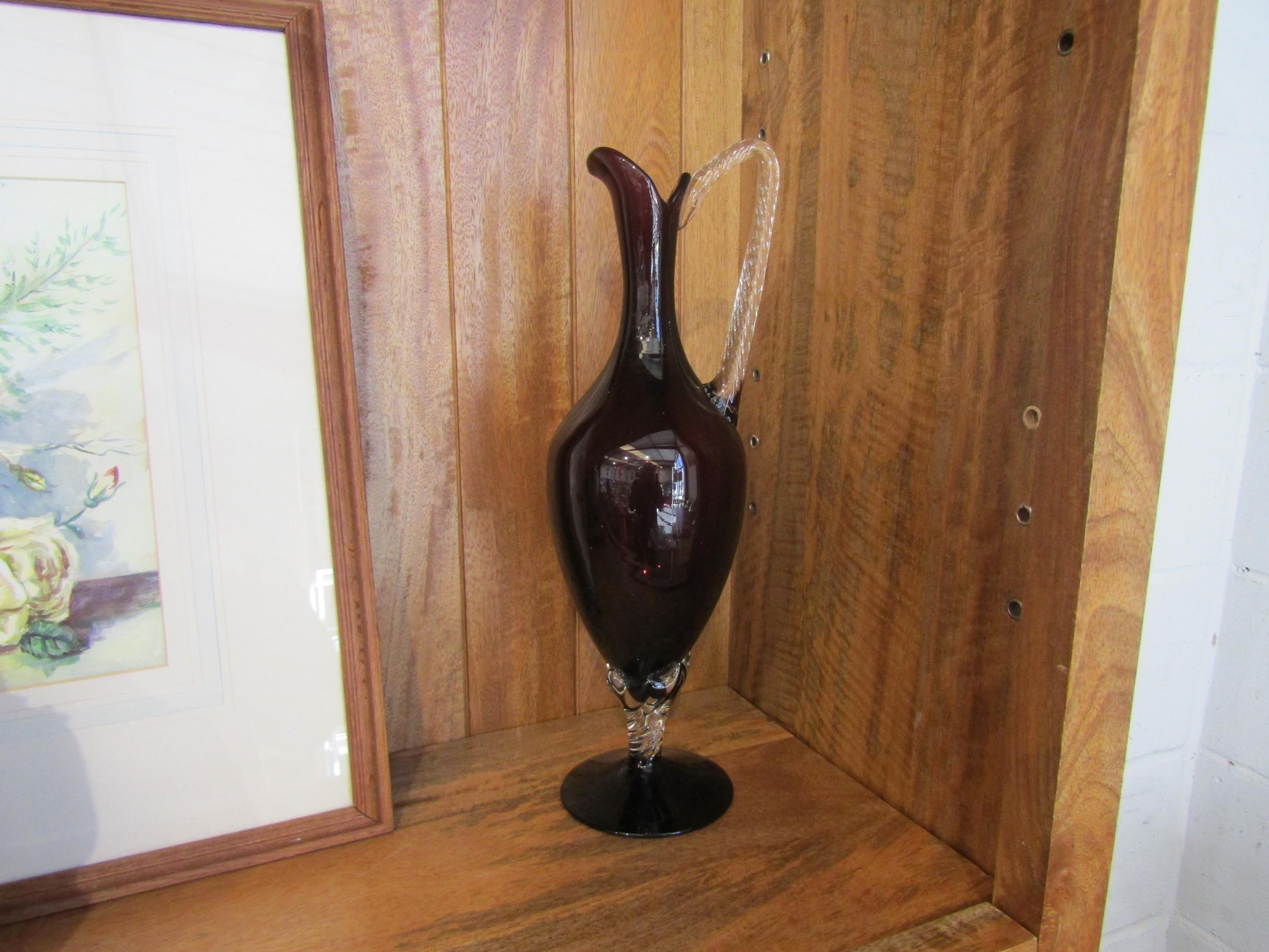 An amethyst and clear wrythen glass ewer, possibly Murano, 40cm tall