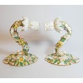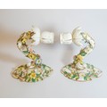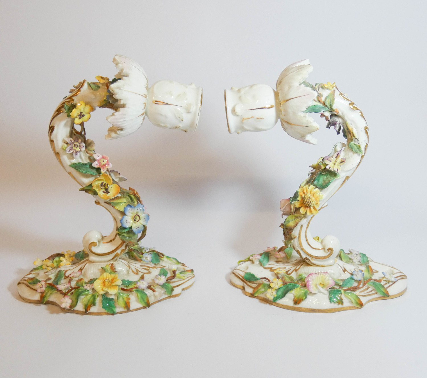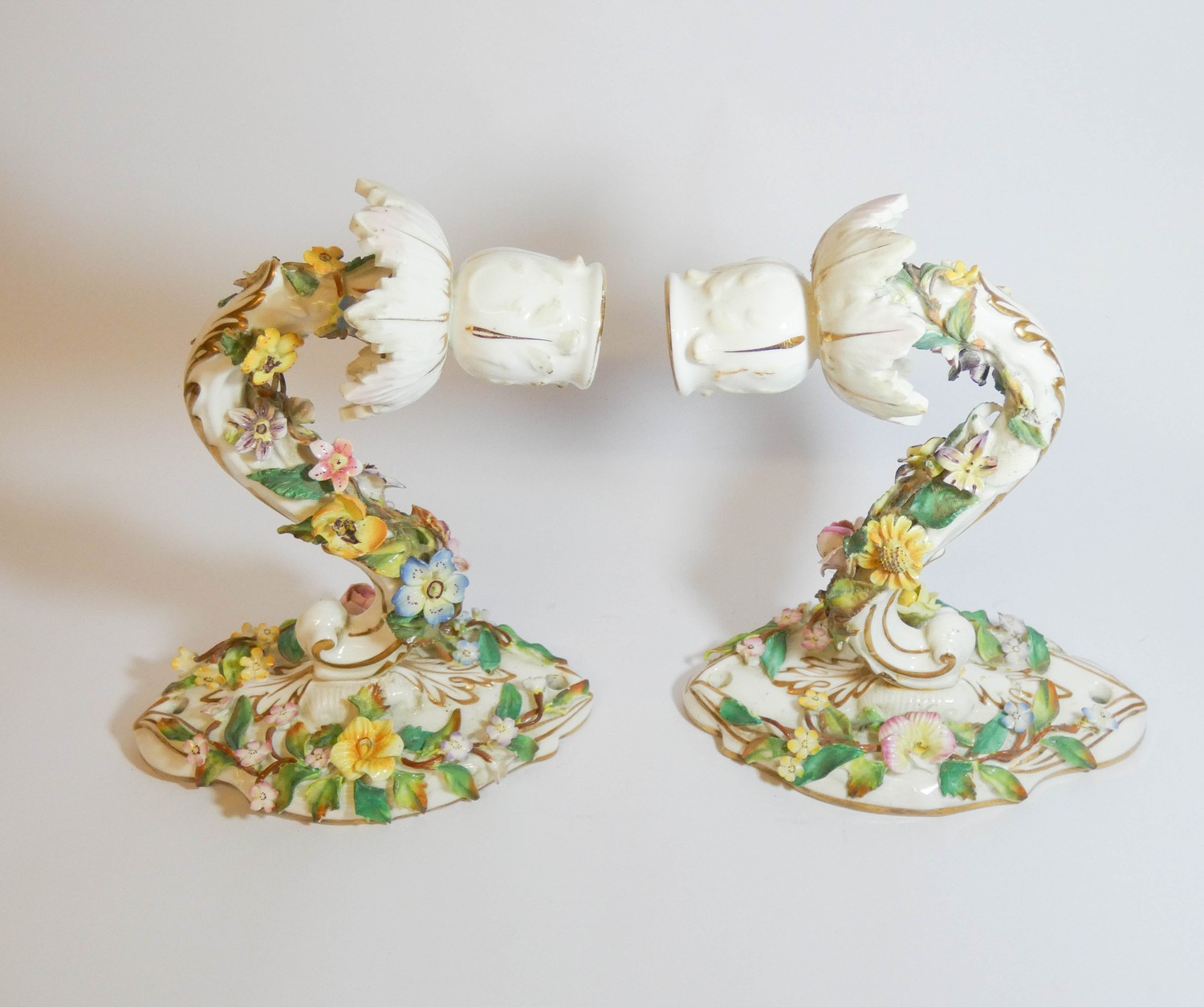A pair of 19th century Dresden floral encrusted wall sconces, blue cross sword mark on reverse