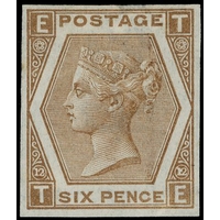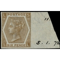 1872 6d Chestnut Pl.11. Very fine unused imperforate right hand marginal imprimatur lettered SL. Endorsed in margin with the plate number ’11’ and date of registration ‘5.1.72’. Scarce one of only 21 possible examples in private hands. SG122. Cat. £3800.