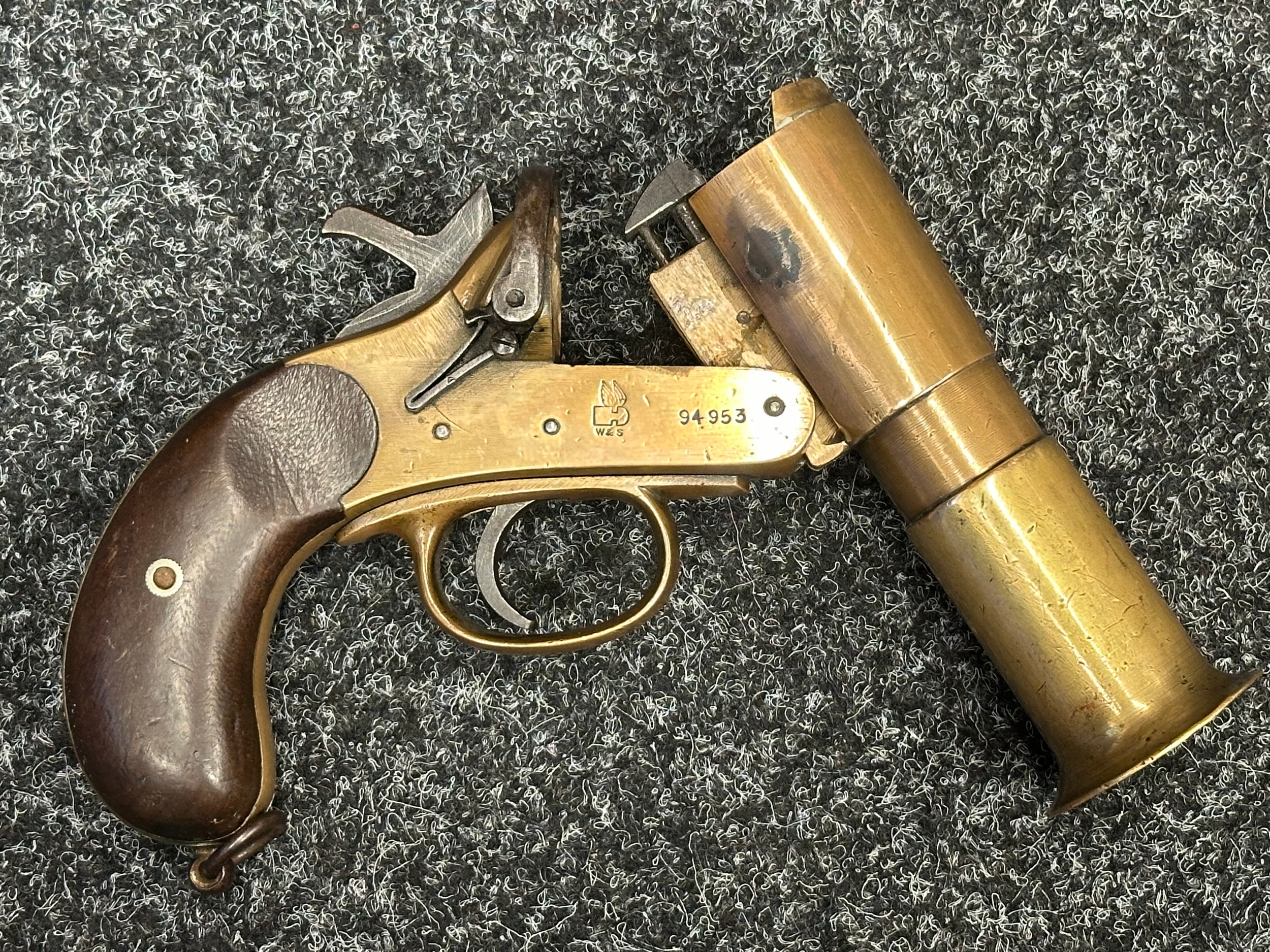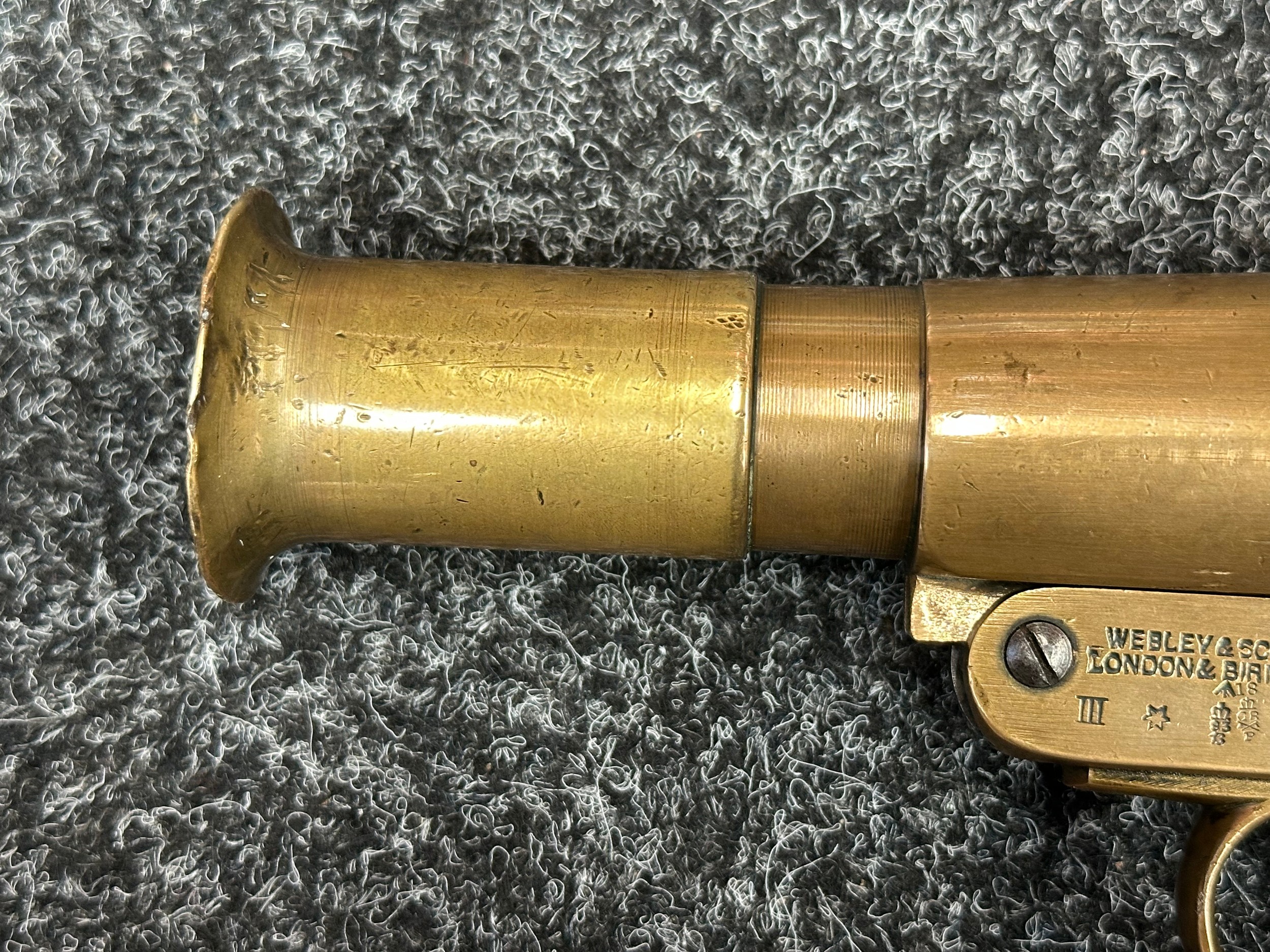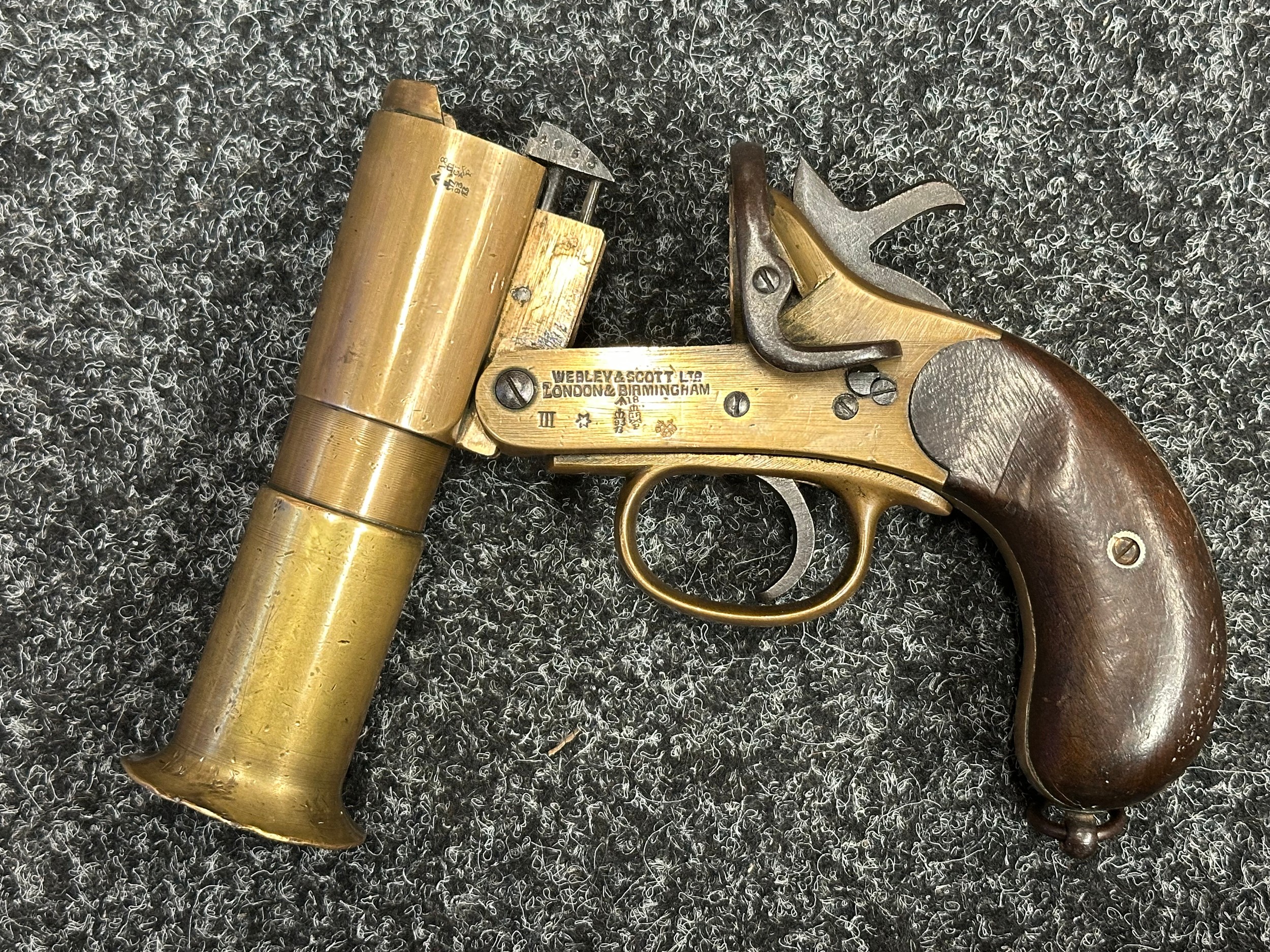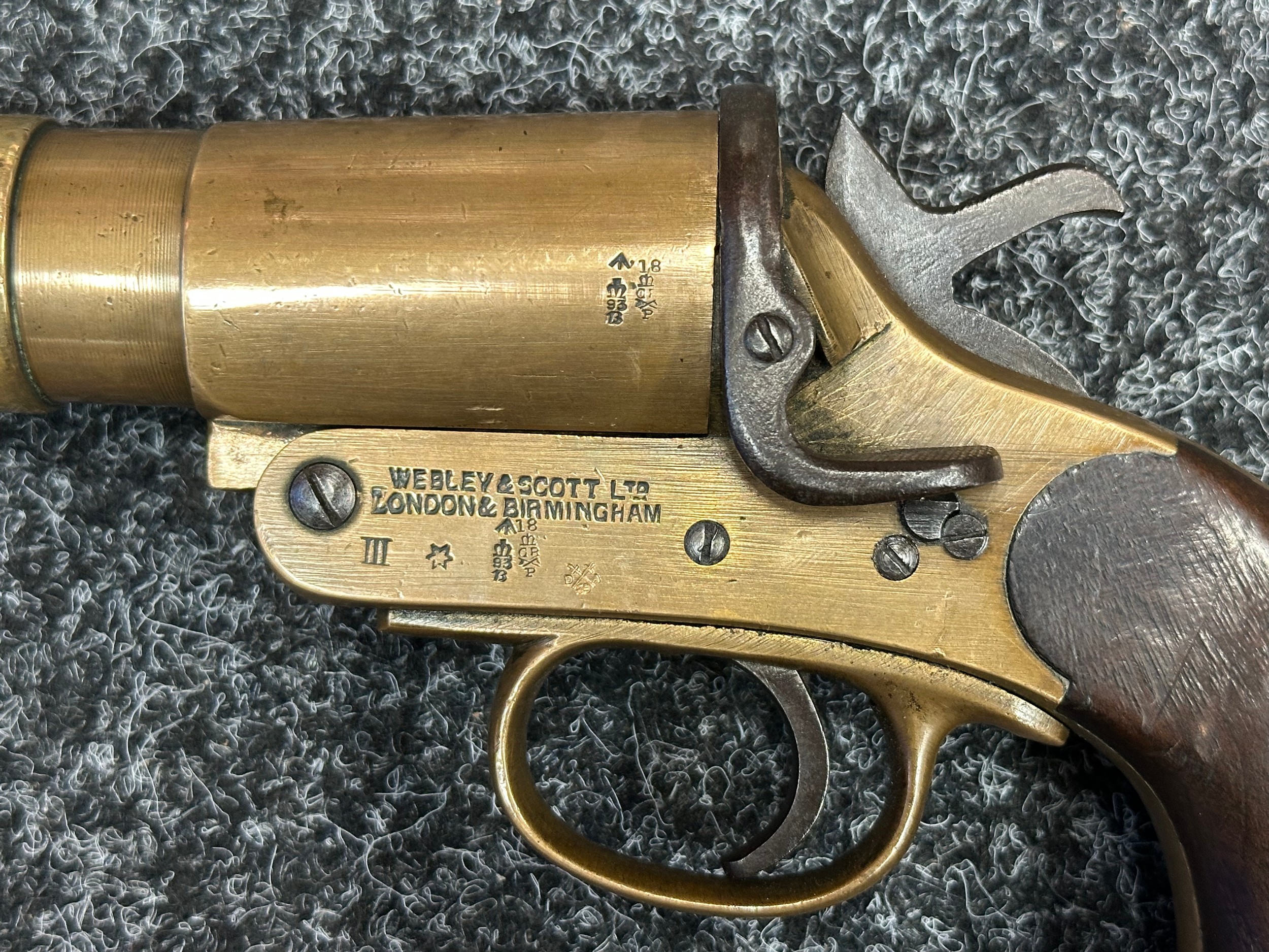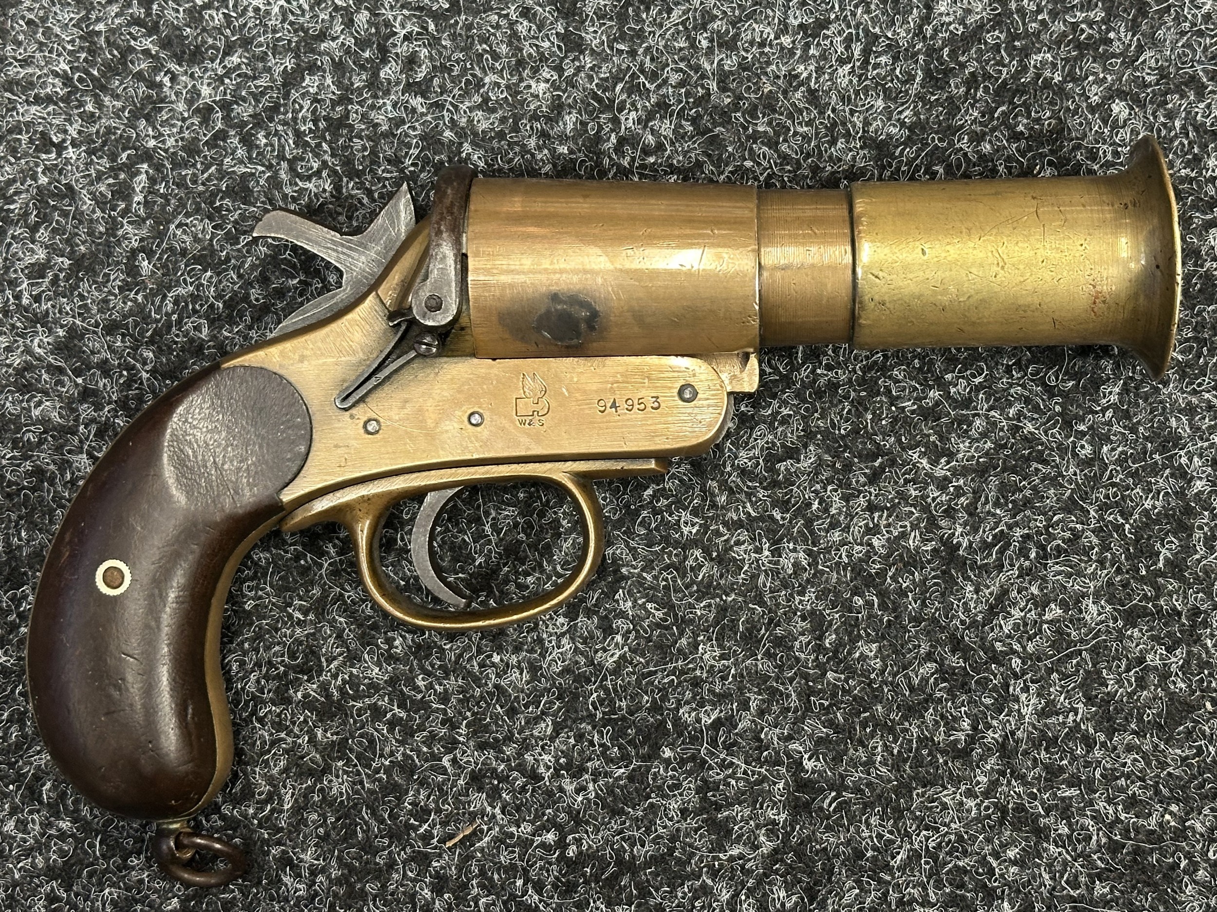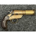 Deactivated WW1 British Webley & Scott Flare Pistol serial number 94953. Complete with Current 2025 UK Spec deactivation certificate. Action will open and cock and dry fire.