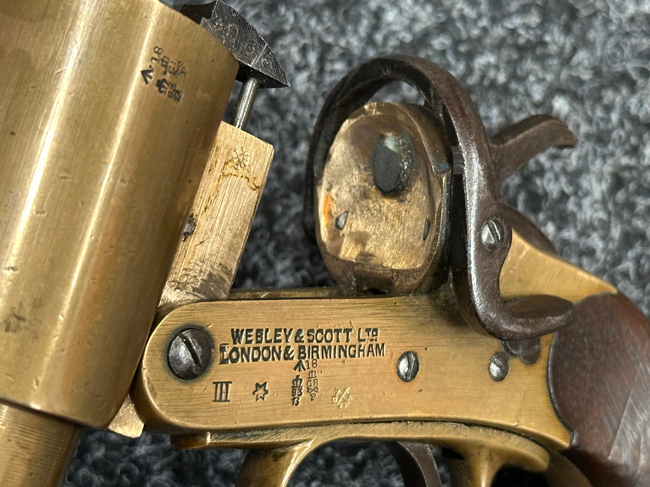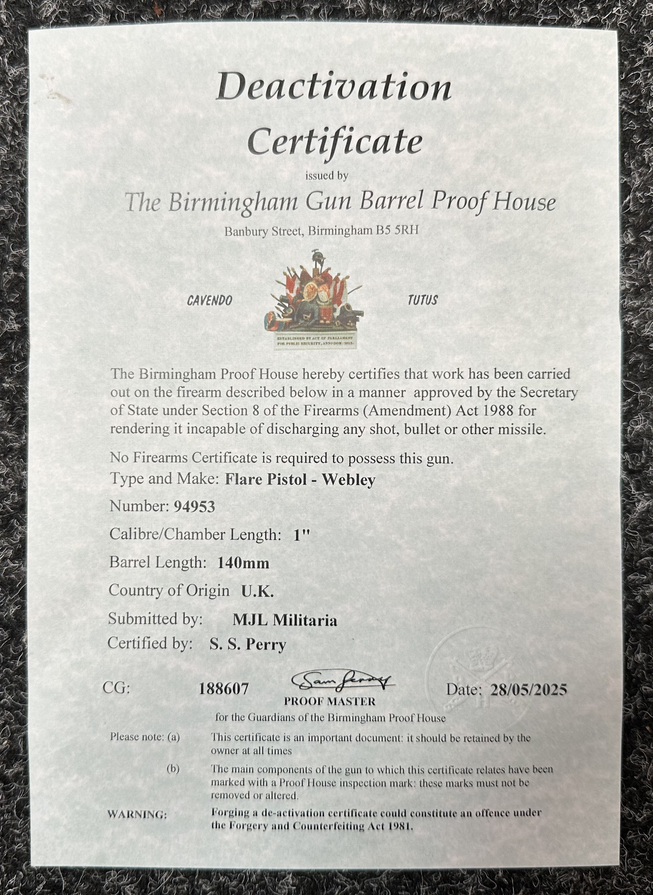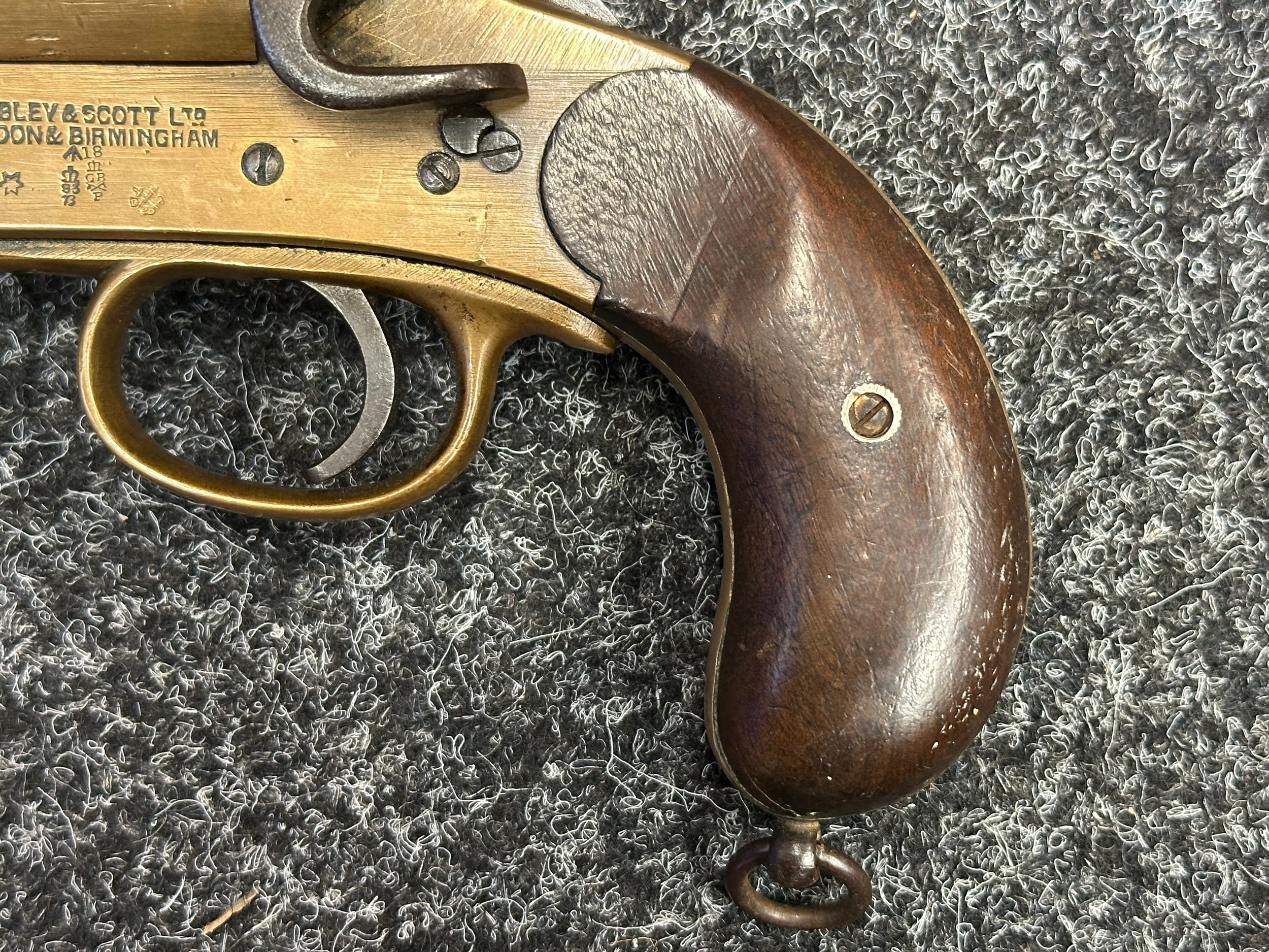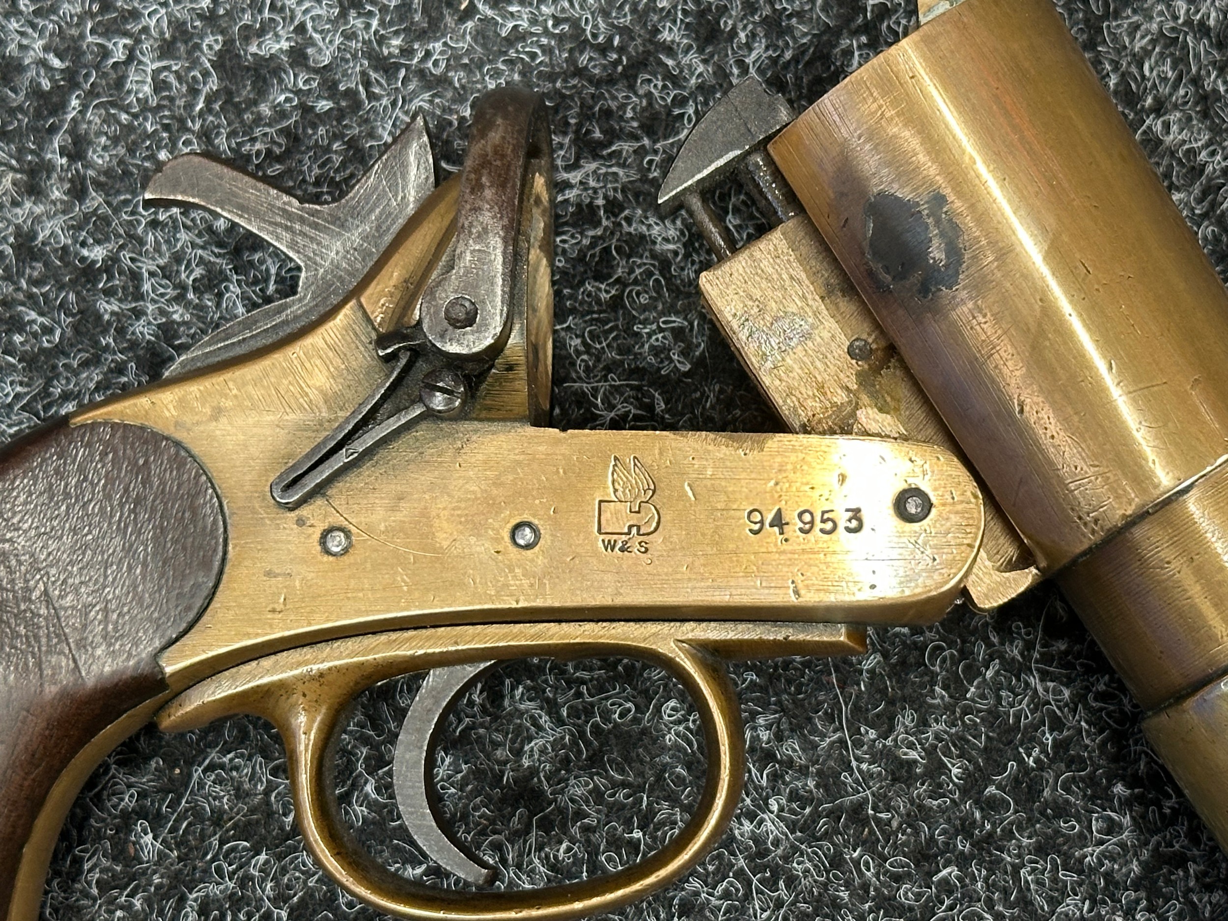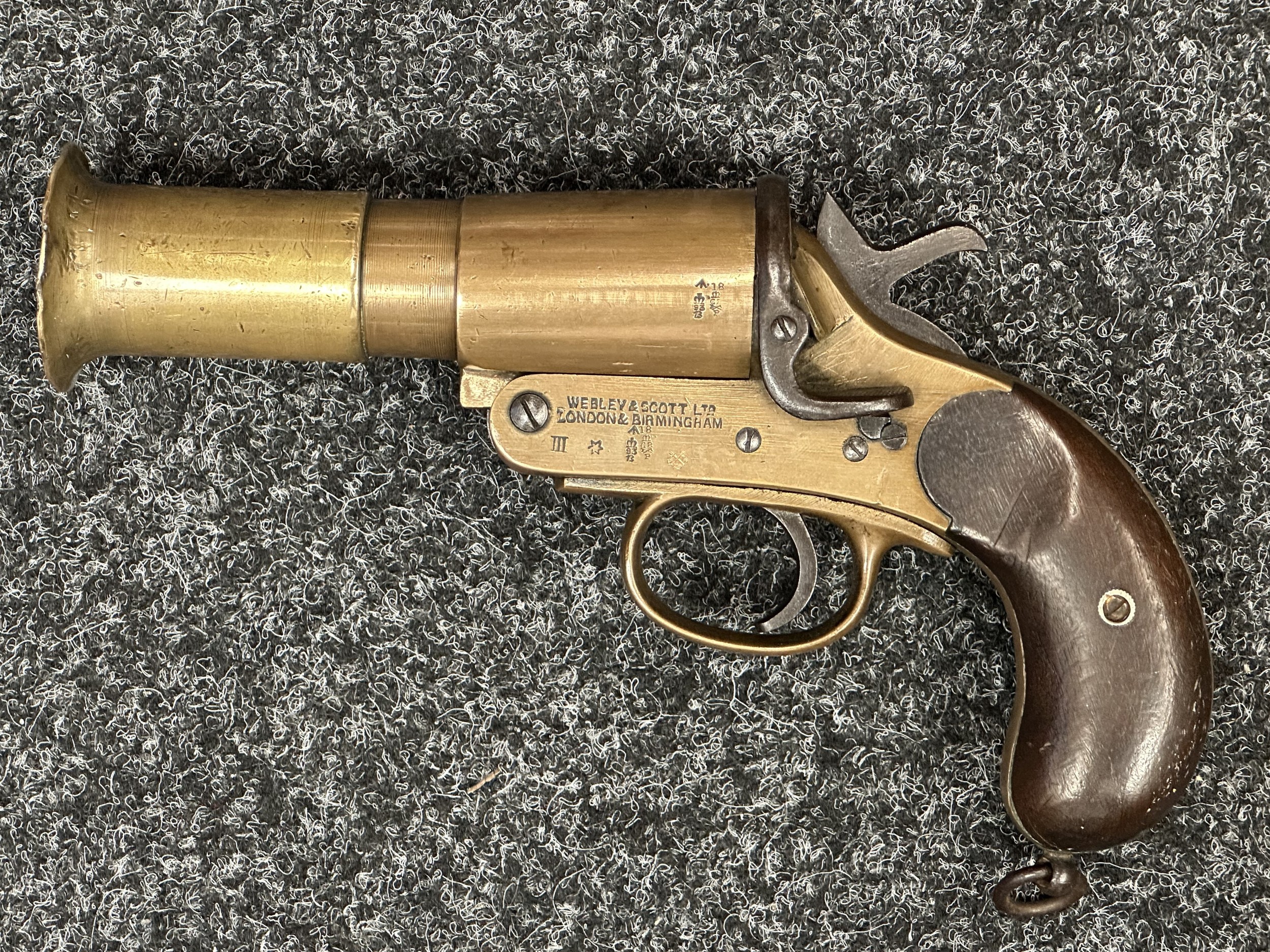 Deactivated WW1 British Webley & Scott Flare Pistol serial number 94953. Complete with Current 2025 UK Spec deactivation certificate. Action will open and cock and dry fire.