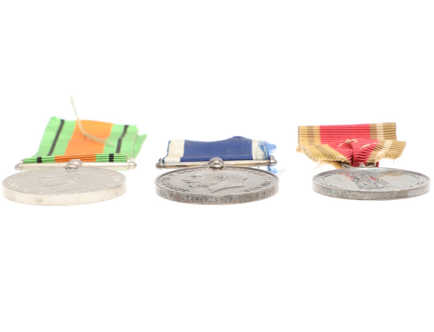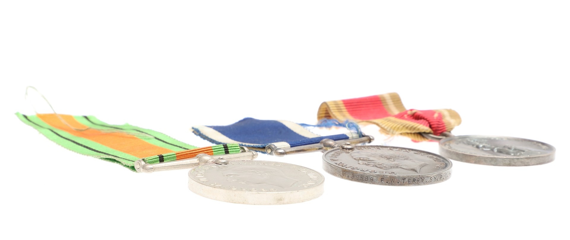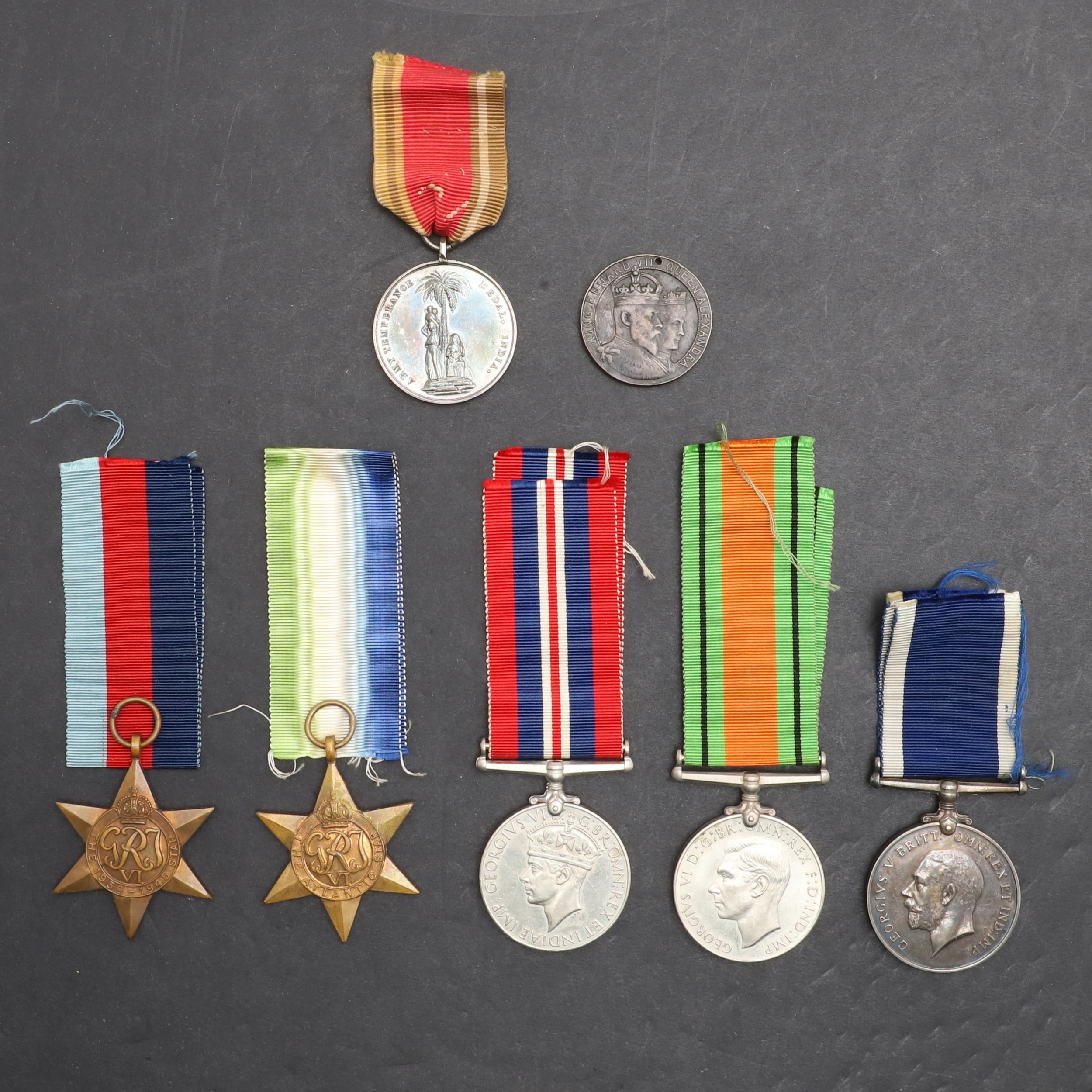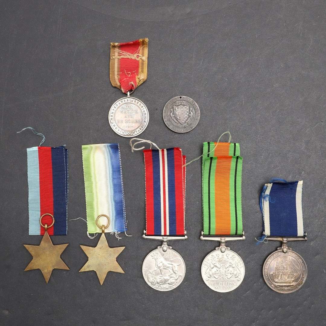 A SECOND WORLD WAR LONG SERVICE GROUP OF FIVE TO THE ROYAL NAVY. A possible group of five comprising 1939-45 and Atlantic Stars, Defence and War Medal, all unnamed as issued and a George V Royal Navy Long Service and Good Conduct medal named to M.38589 F.W. Terry SY P.O. H.M.S. Pembroke. Also an Army Temperance Association Medal, India 1897, 'Watch and be sober'. 1902 coronation medal and partial delivery box. Frank Ward Terry was born on the 4th December 1903 in Leeds. He in enlisted on the 4th December 1921. Award of the group to this individual not confirmed.