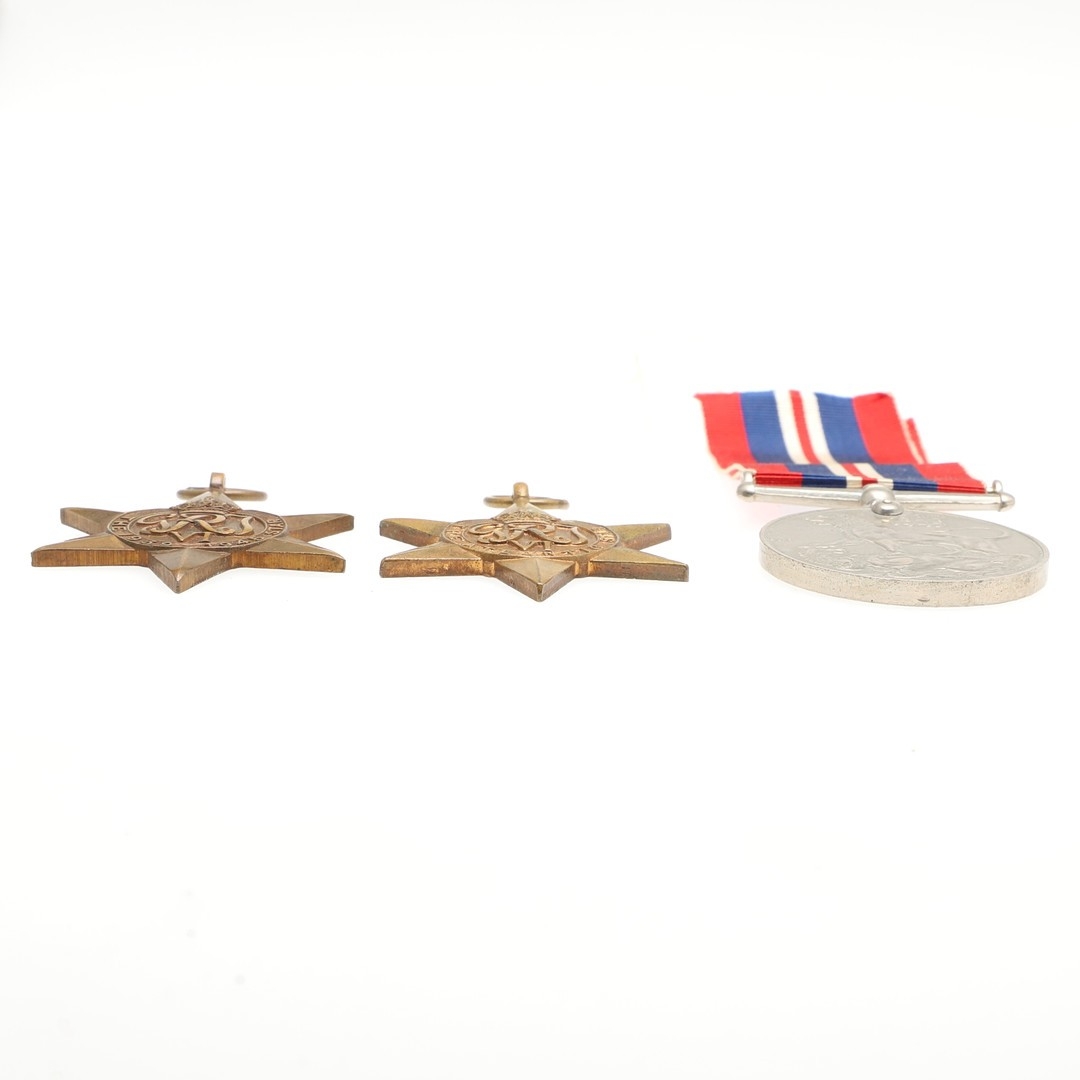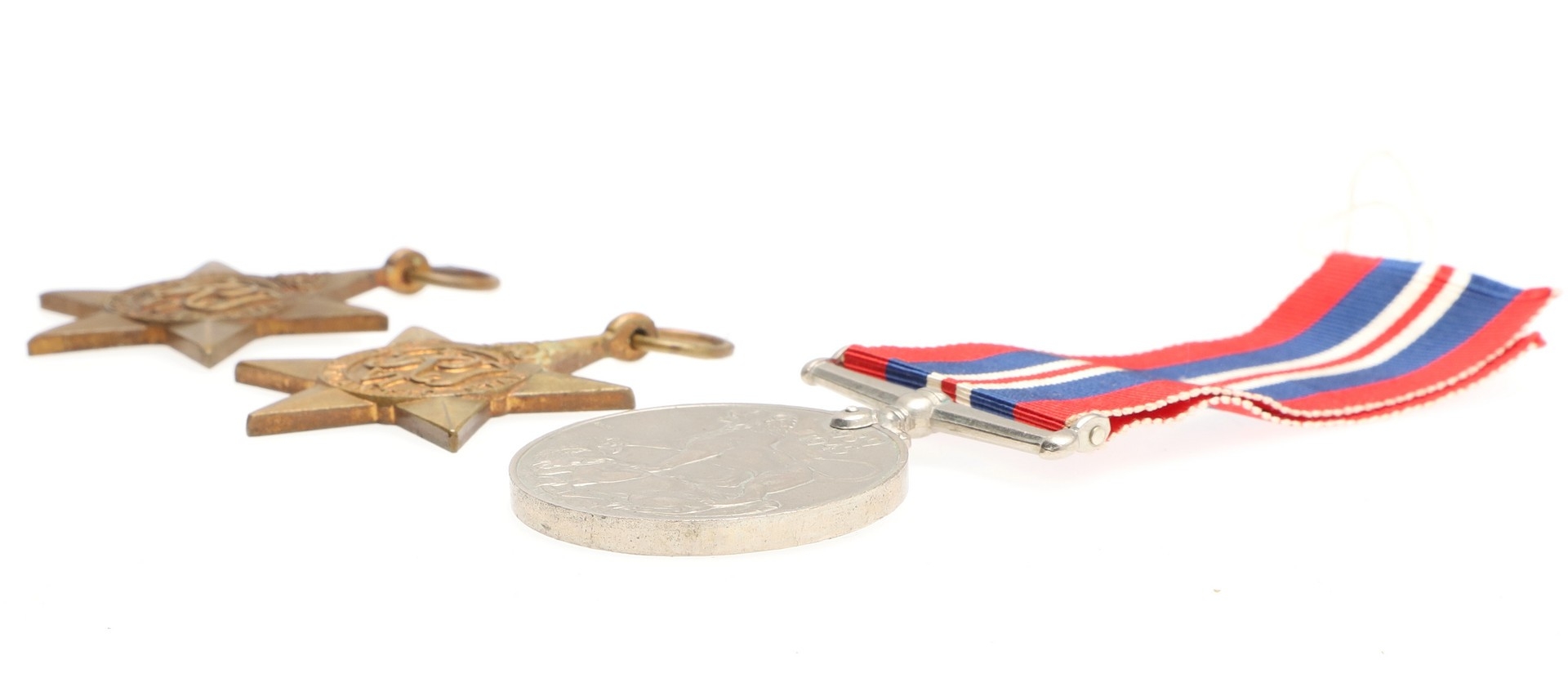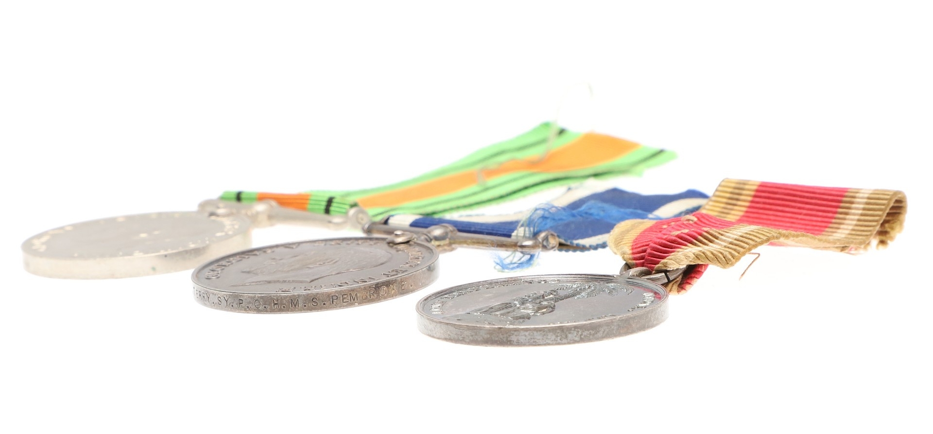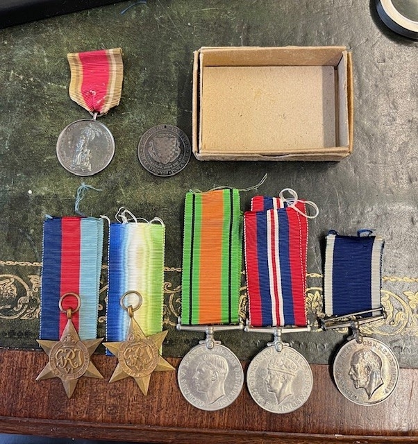 A SECOND WORLD WAR LONG SERVICE GROUP OF FIVE TO THE ROYAL NAVY. A possible group of five comprising 1939-45 and Atlantic Stars, Defence and War Medal, all unnamed as issued and a George V Royal Navy Long Service and Good Conduct medal named to M.38589 F.W. Terry SY P.O. H.M.S. Pembroke. Also an Army Temperance Association Medal, India 1897, 'Watch and be sober'. 1902 coronation medal and partial delivery box. Frank Ward Terry was born on the 4th December 1903 in Leeds. He in enlisted on the 4th December 1921. Award of the group to this individual not confirmed.