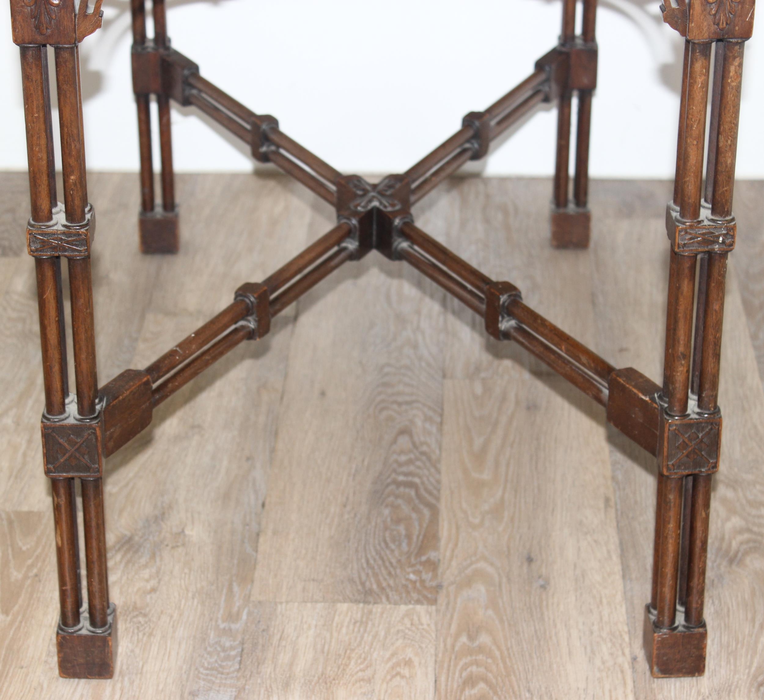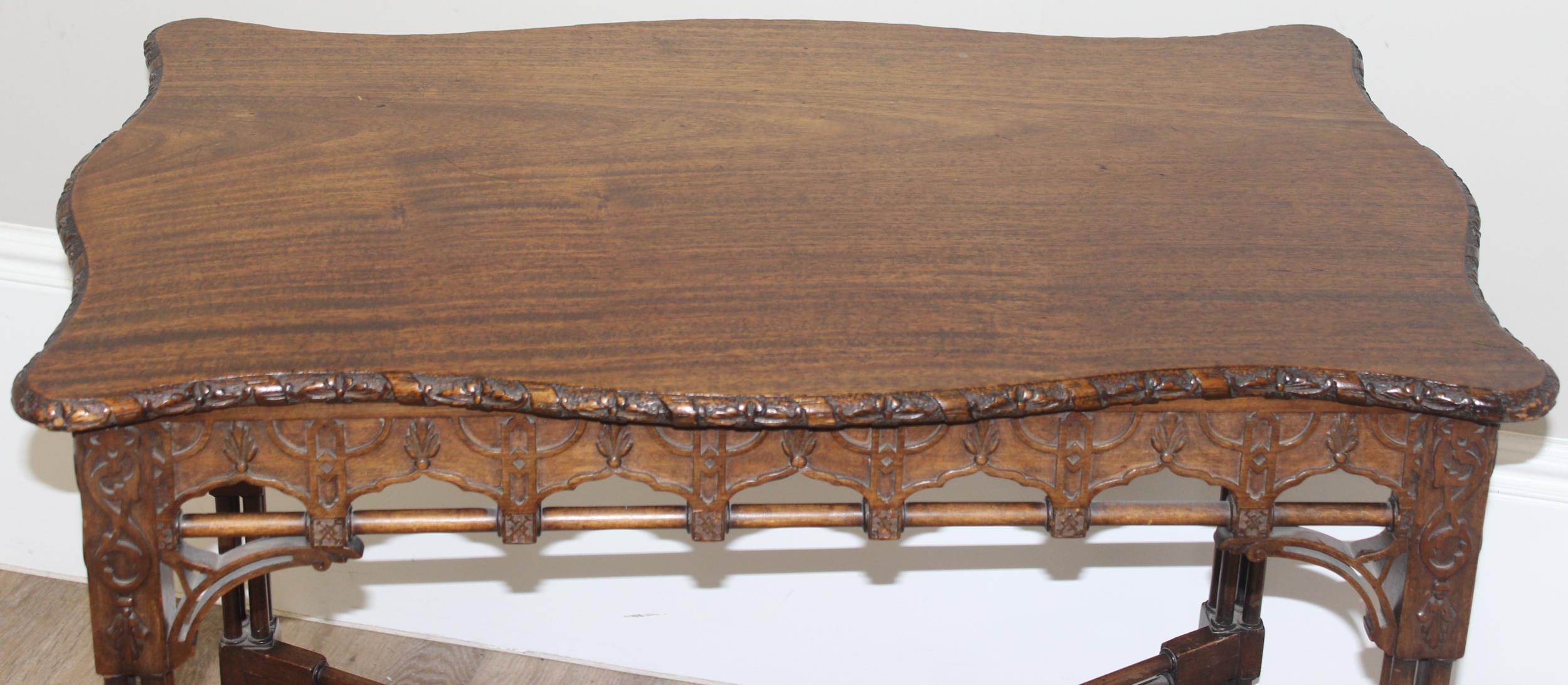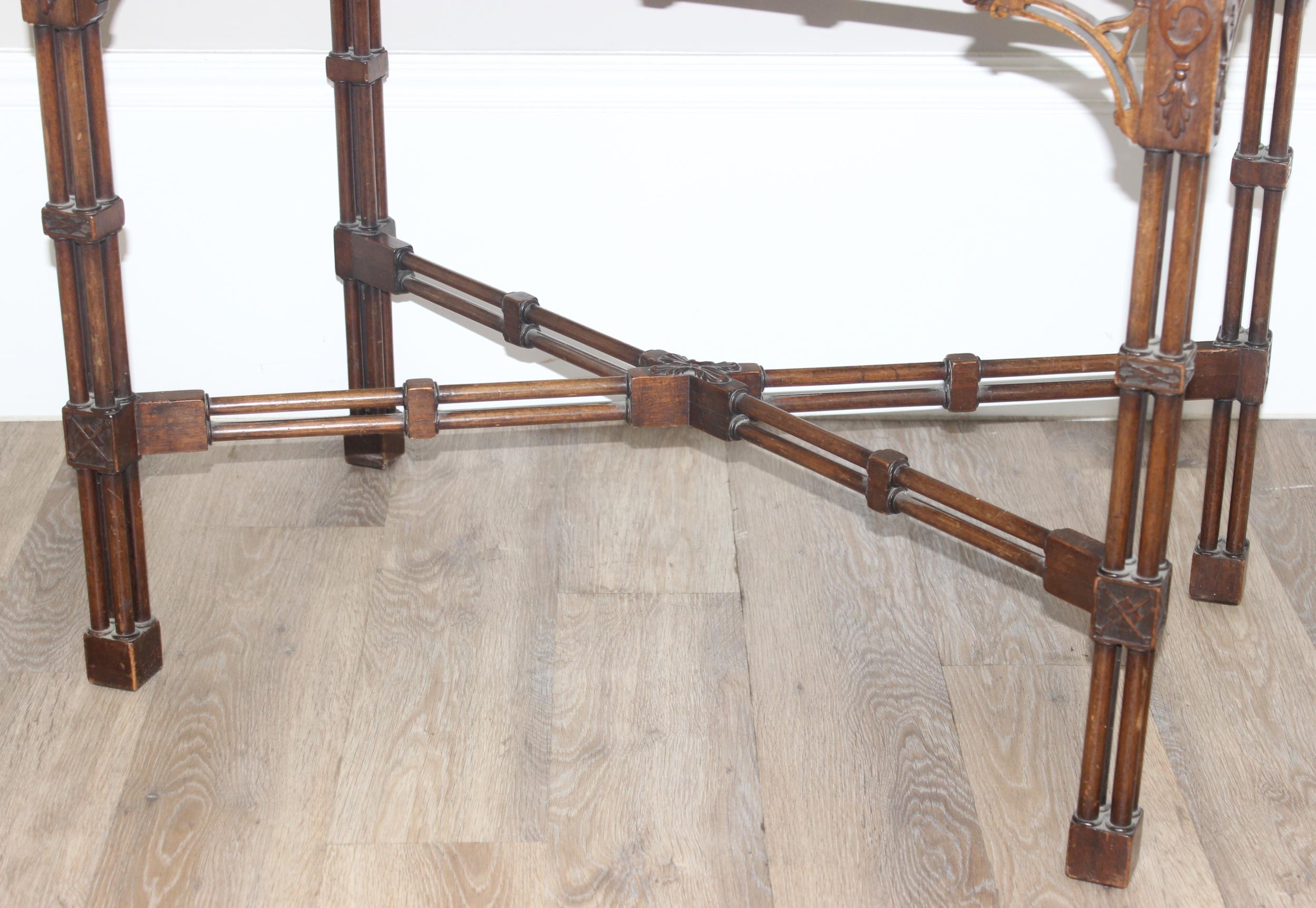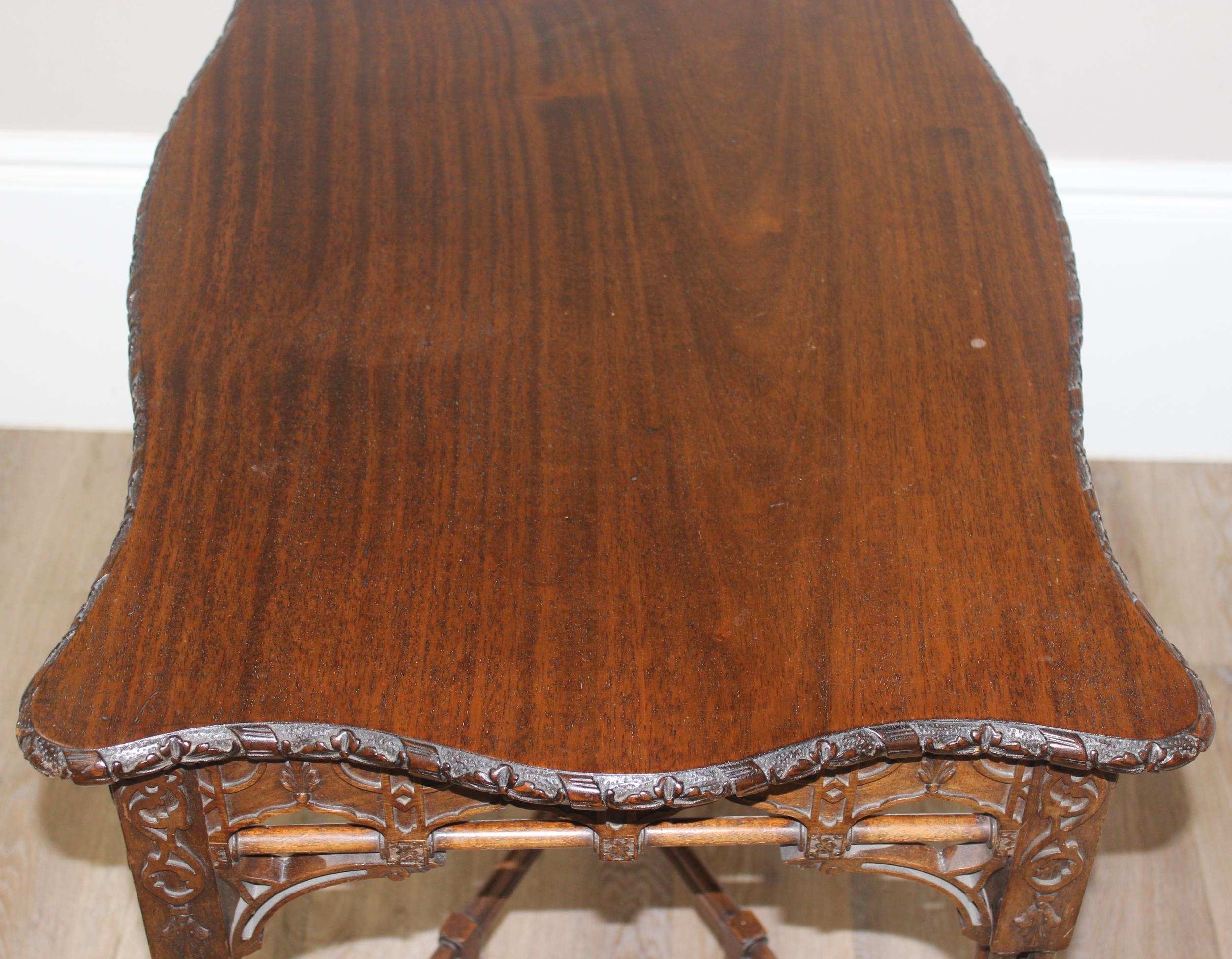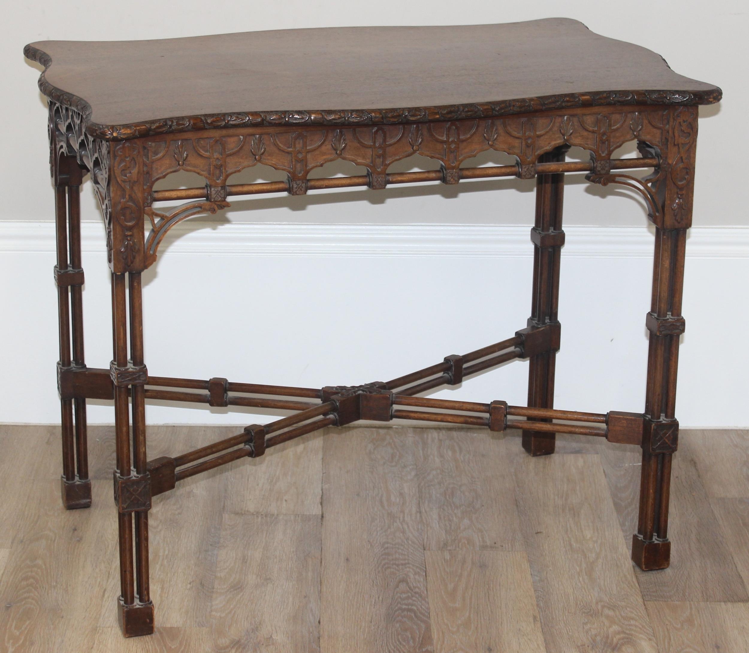 In the manner of Thomas Chippendale, an antique mahogany silver or tea table with profusely carved apron in the Gothic Revival taste and clustered column stretchers and legs, likely late 19th or early 20th century, approx 91cm wide x 56cm deep x 72cm tall