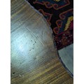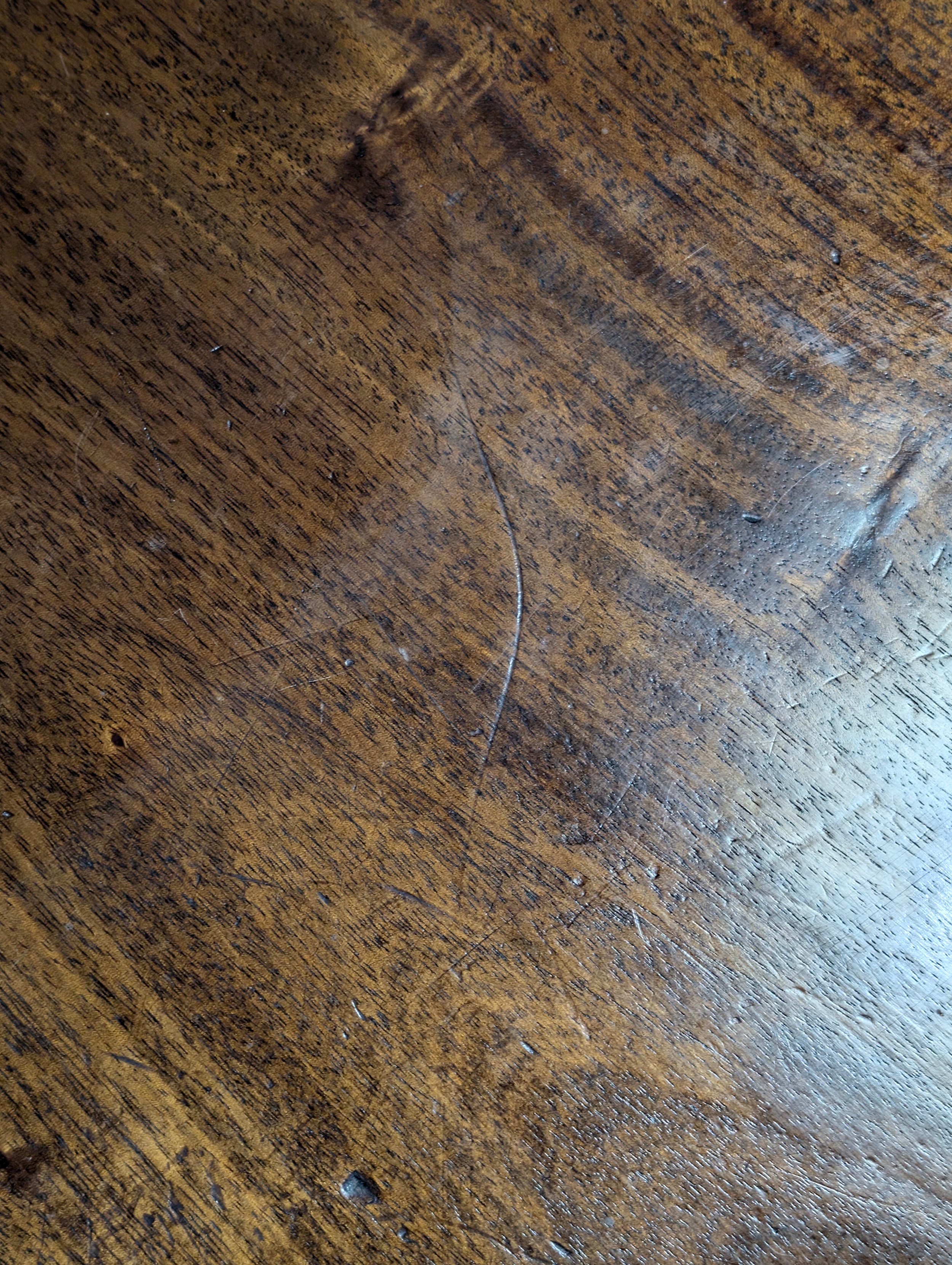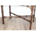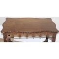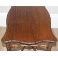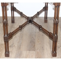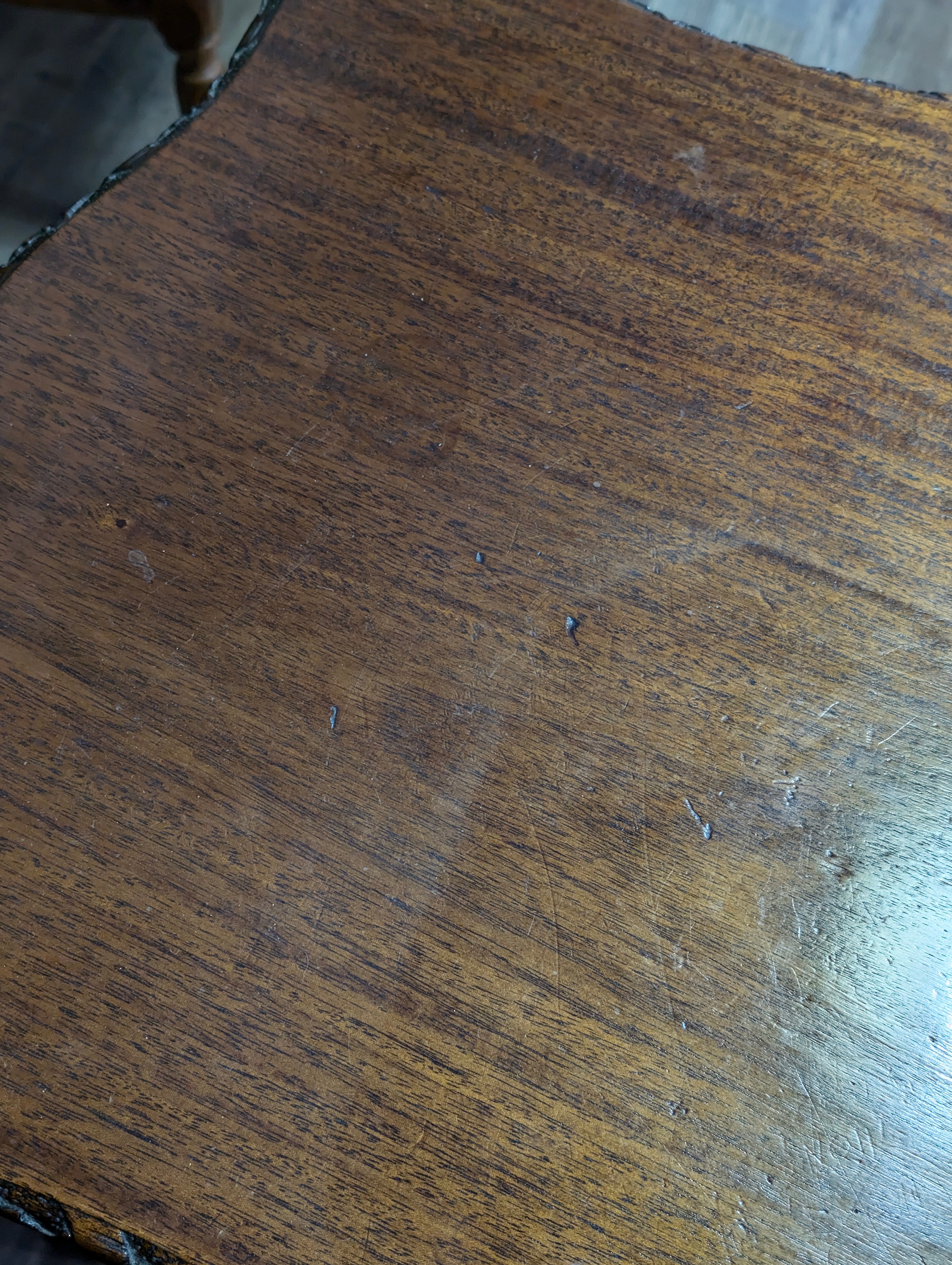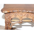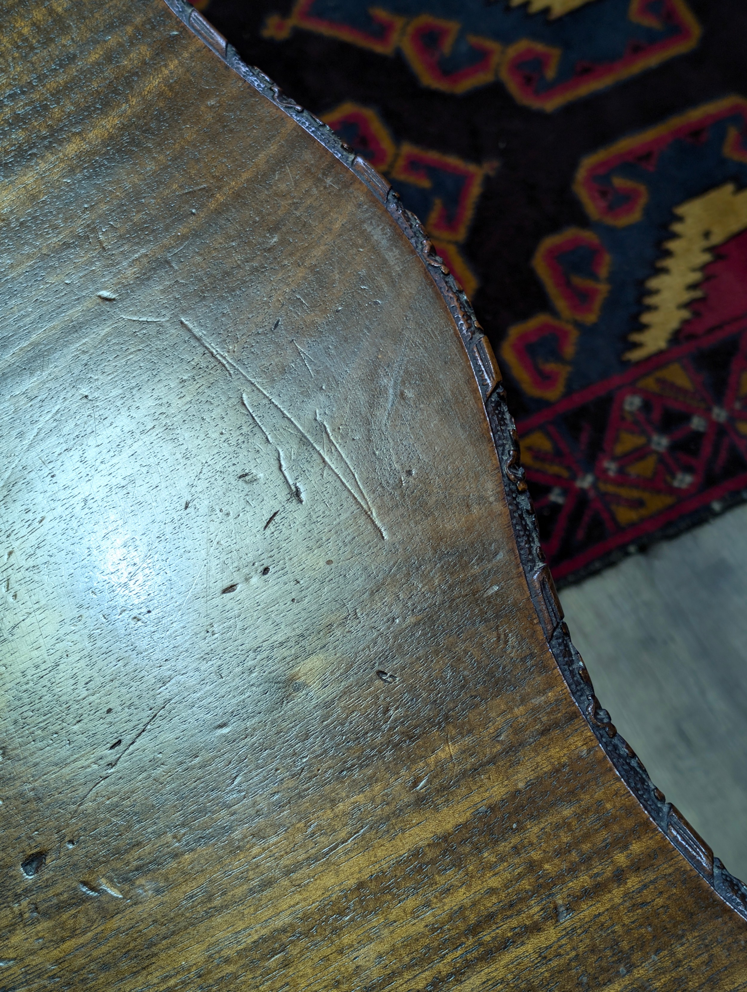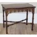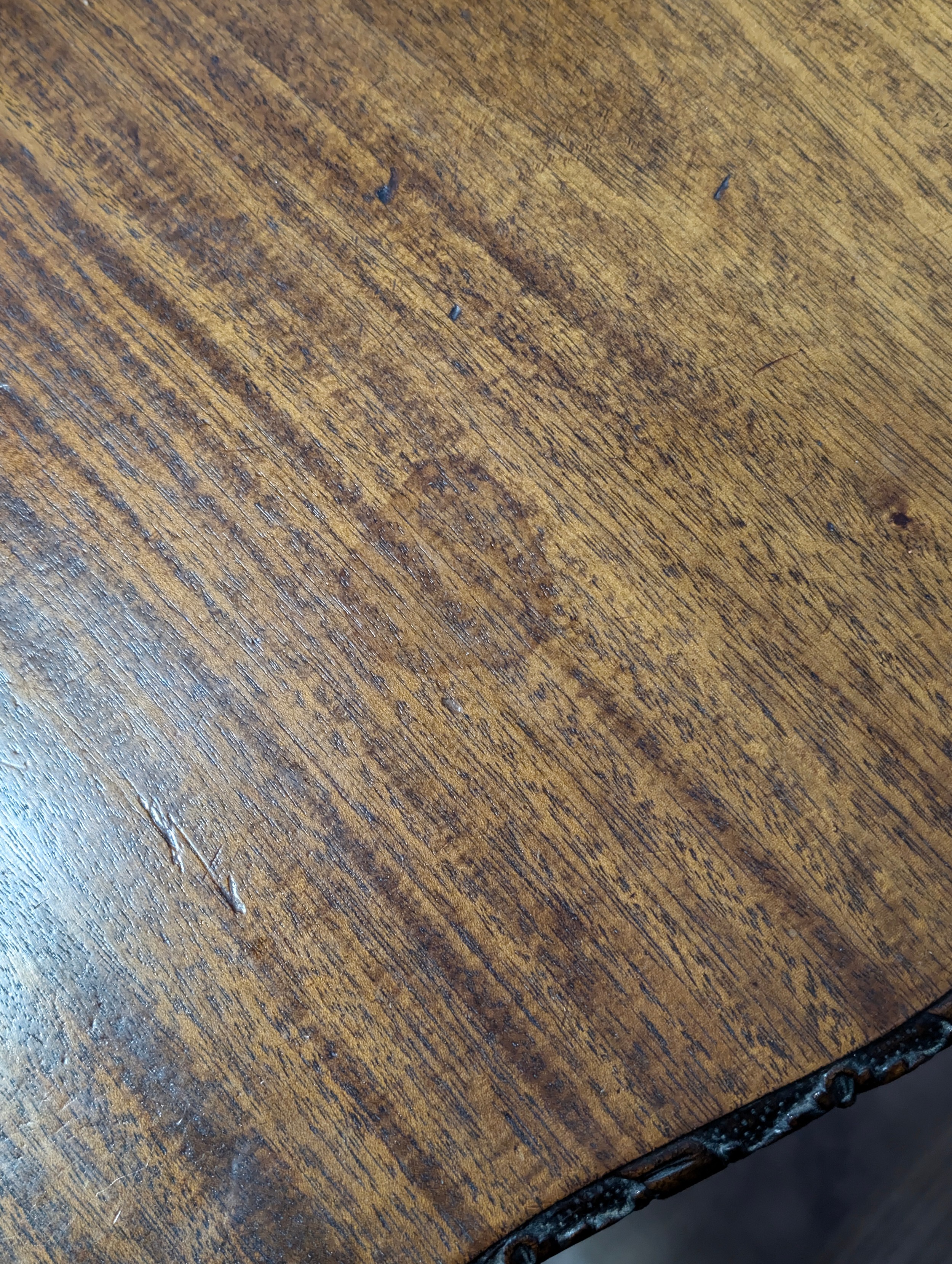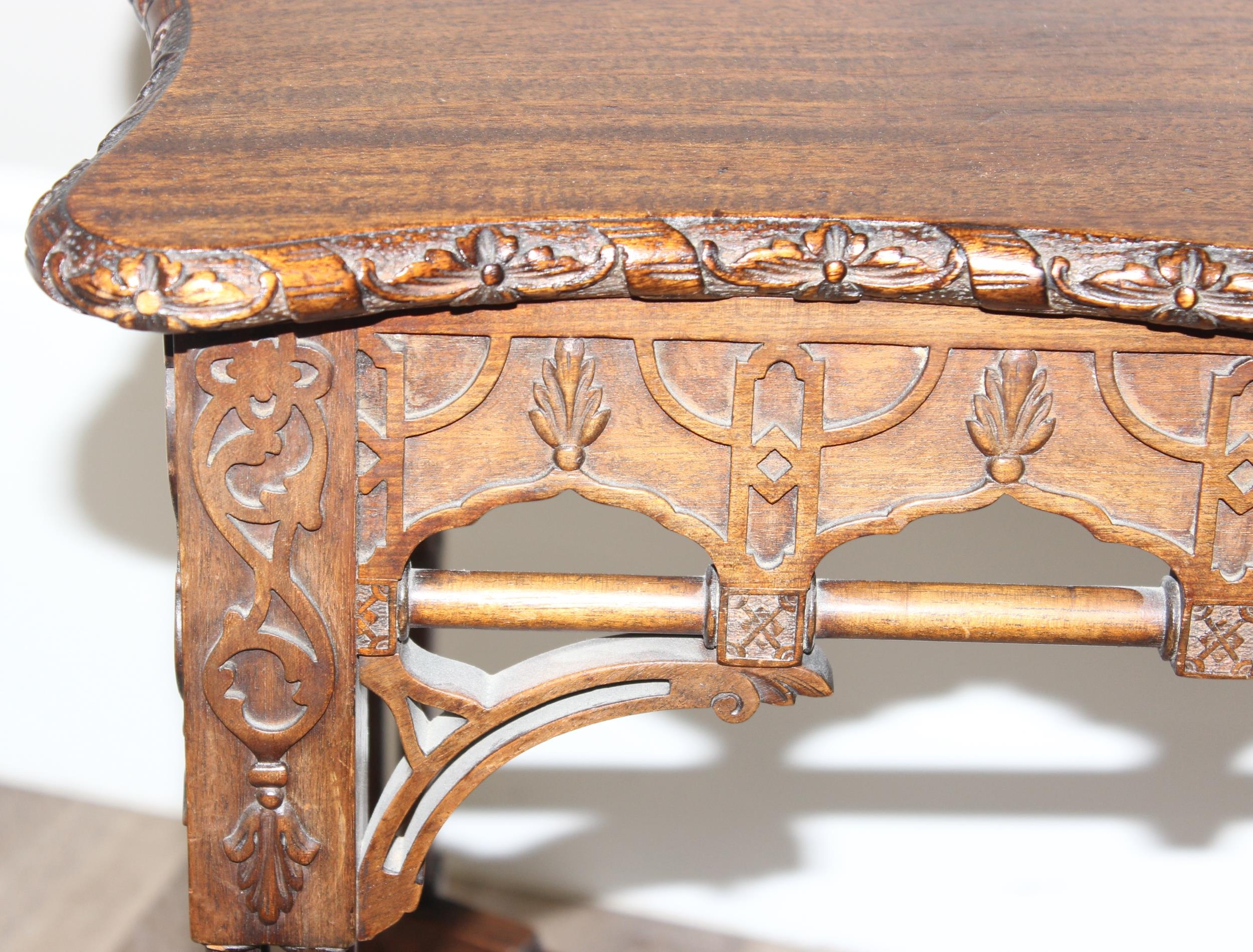 In the manner of Thomas Chippendale, an antique mahogany silver or tea table with profusely carved apron in the Gothic Revival taste and clustered column stretchers and legs, likely late 19th or early 20th century, approx 91cm wide x 56cm deep x 72cm tall