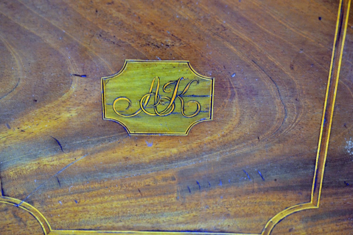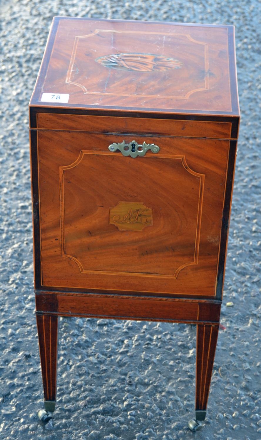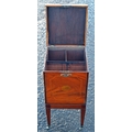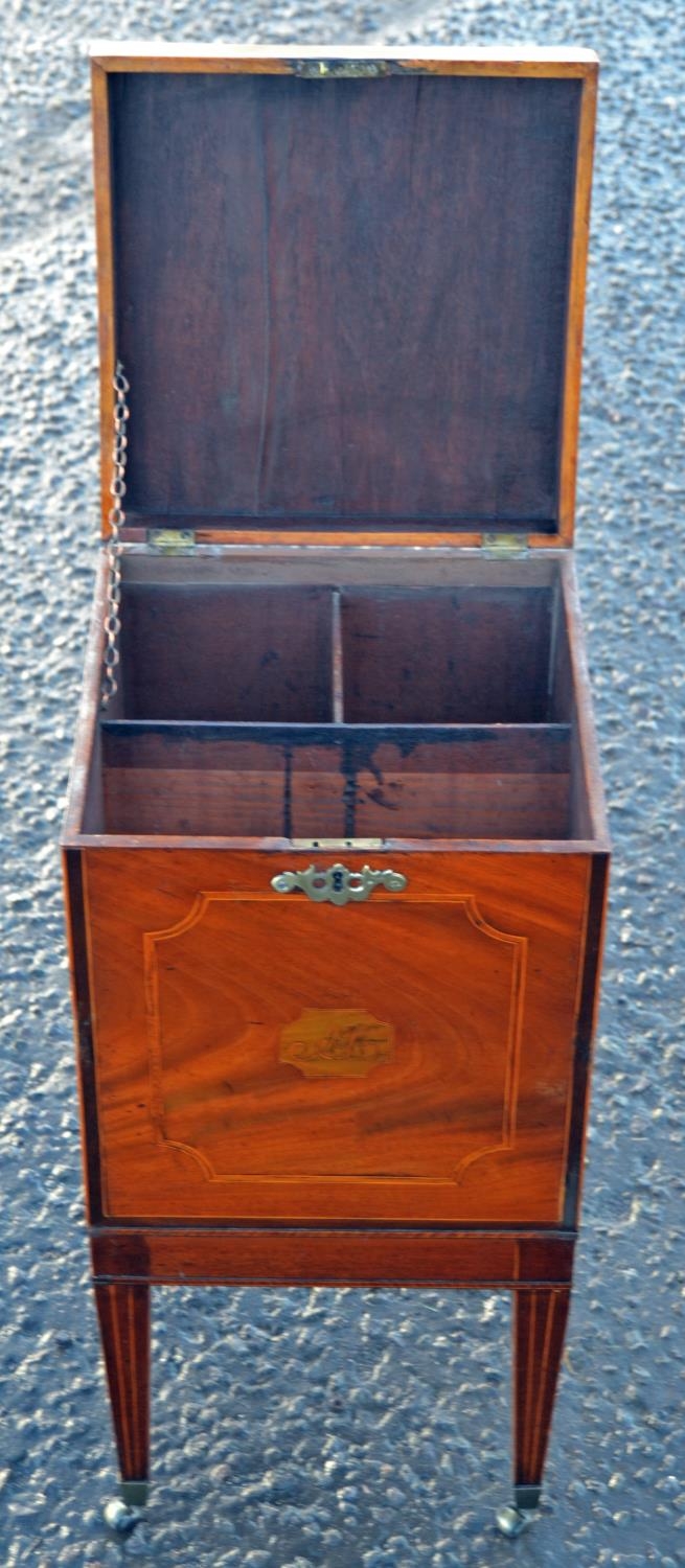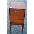 An antique mahogany cellarette with Sheraton type inlay, standing on 4 square legs with castors