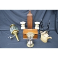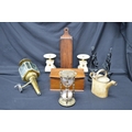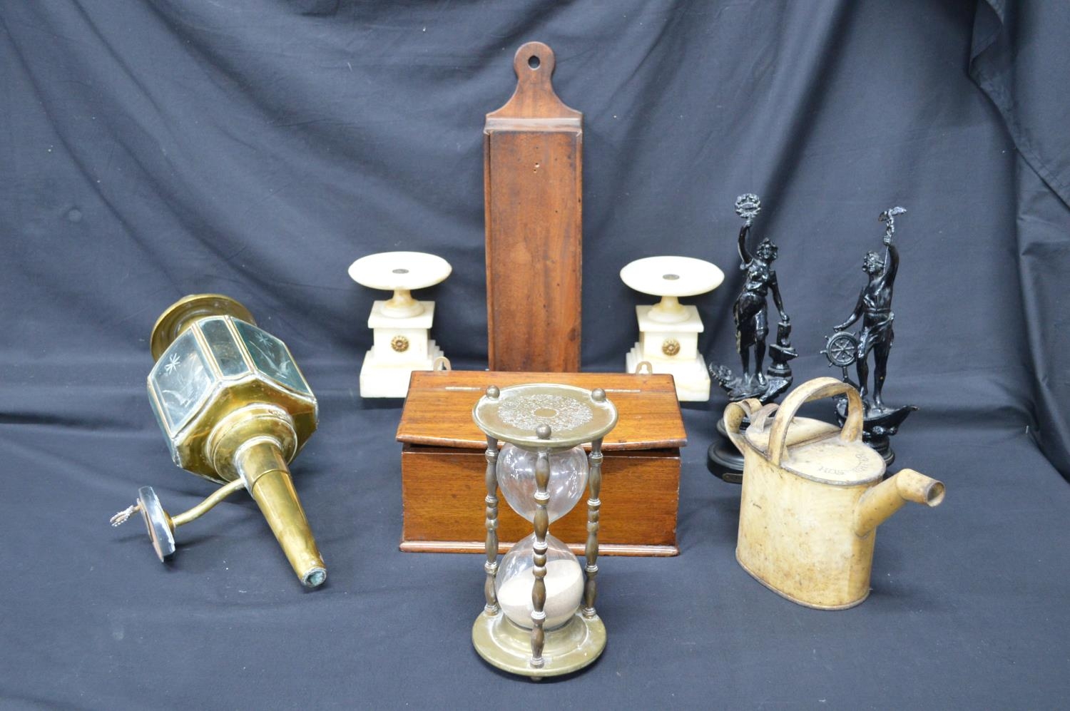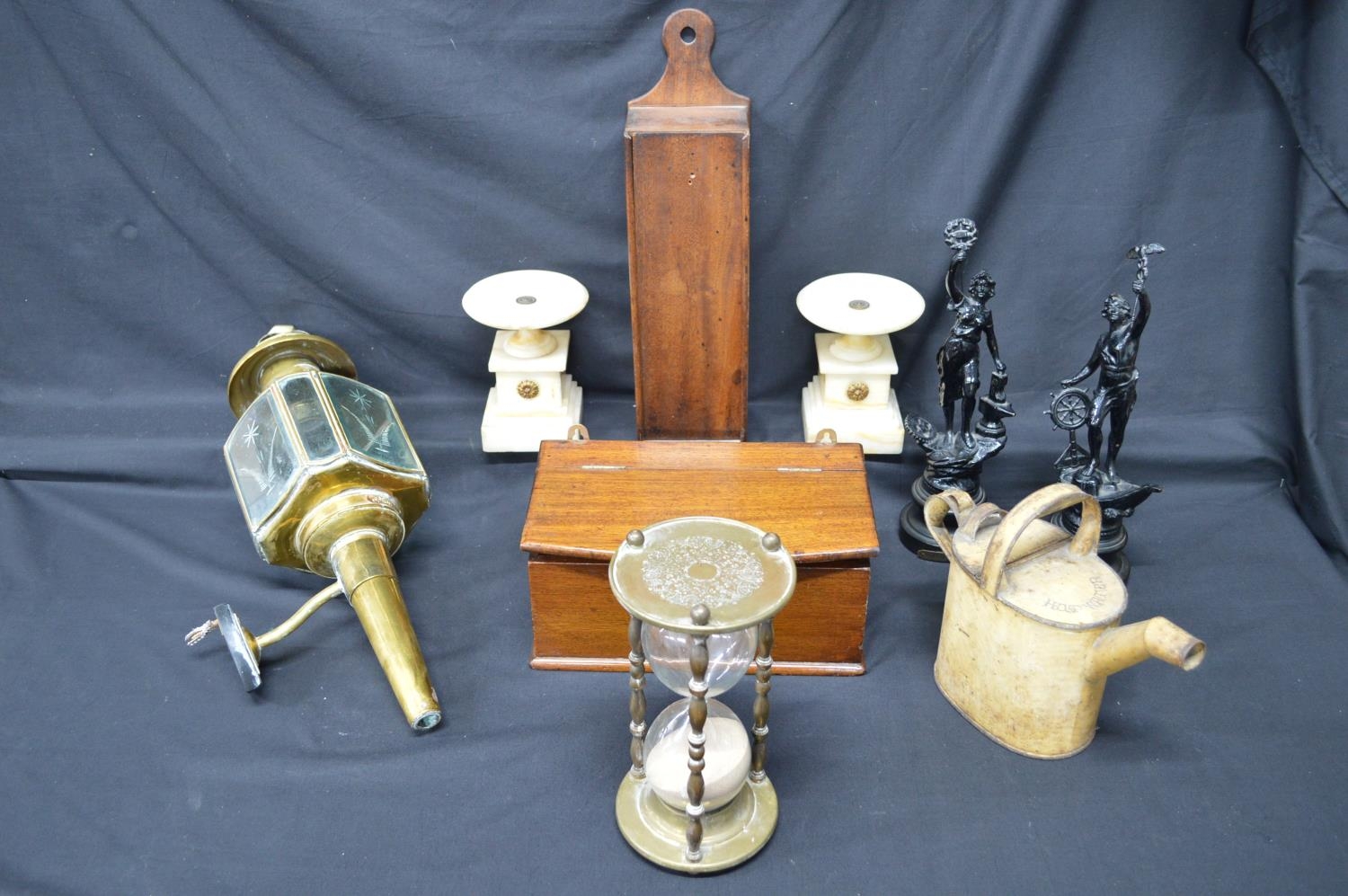 Collection of sundry items to include: pair of painted figures, painted watering can, pair of alabaster garnitures and brass carriage lamp etc