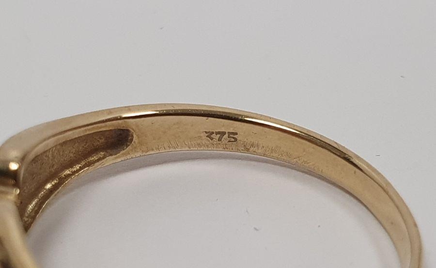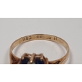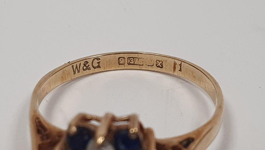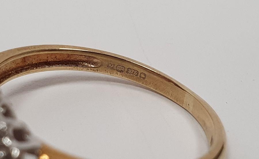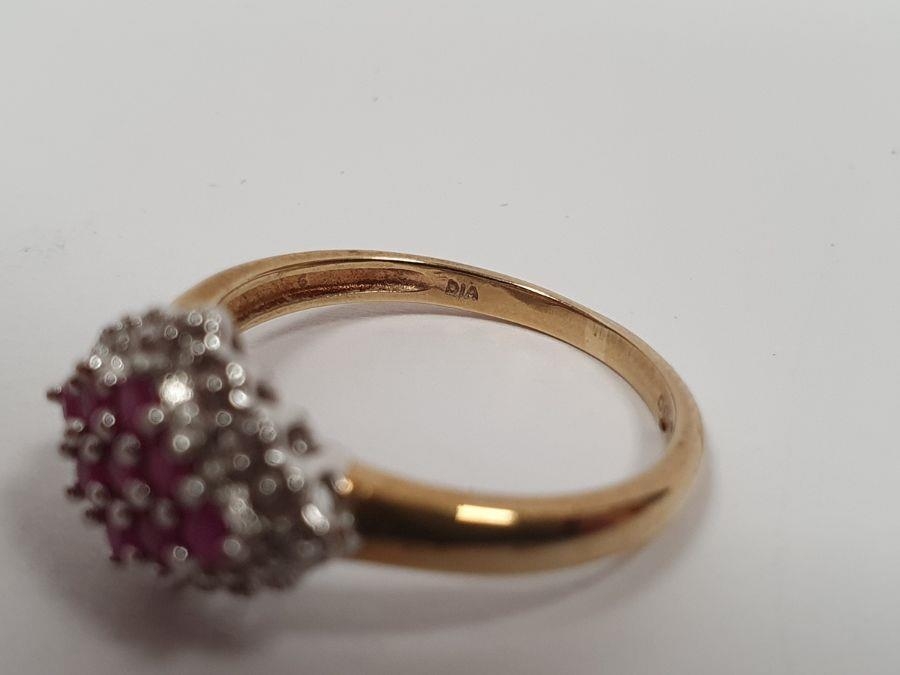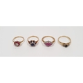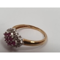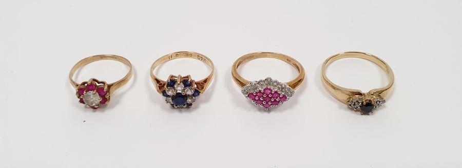 9ct gold, ruby and diamond lozenge-shaped cluster ring, 2.5g, a gold flower-shaped ring, a 9ct gold, sapphire and white stone cluster ring and a 9ct gold flower-shaped ring (4)