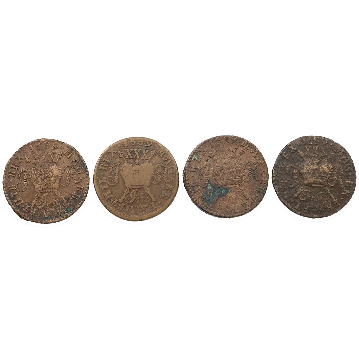 Ireland, James II Gunmoney Halfcrowns, large size (4) - January 1689 (S 6579G) (2); and February (S 6579H) (2), all Very Good to Fine.