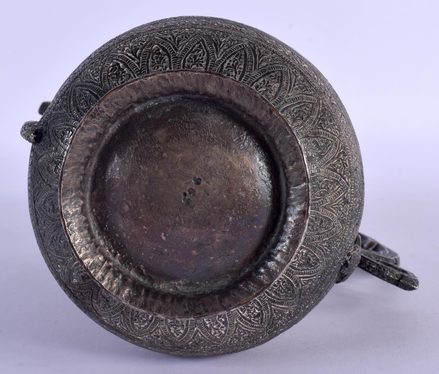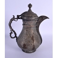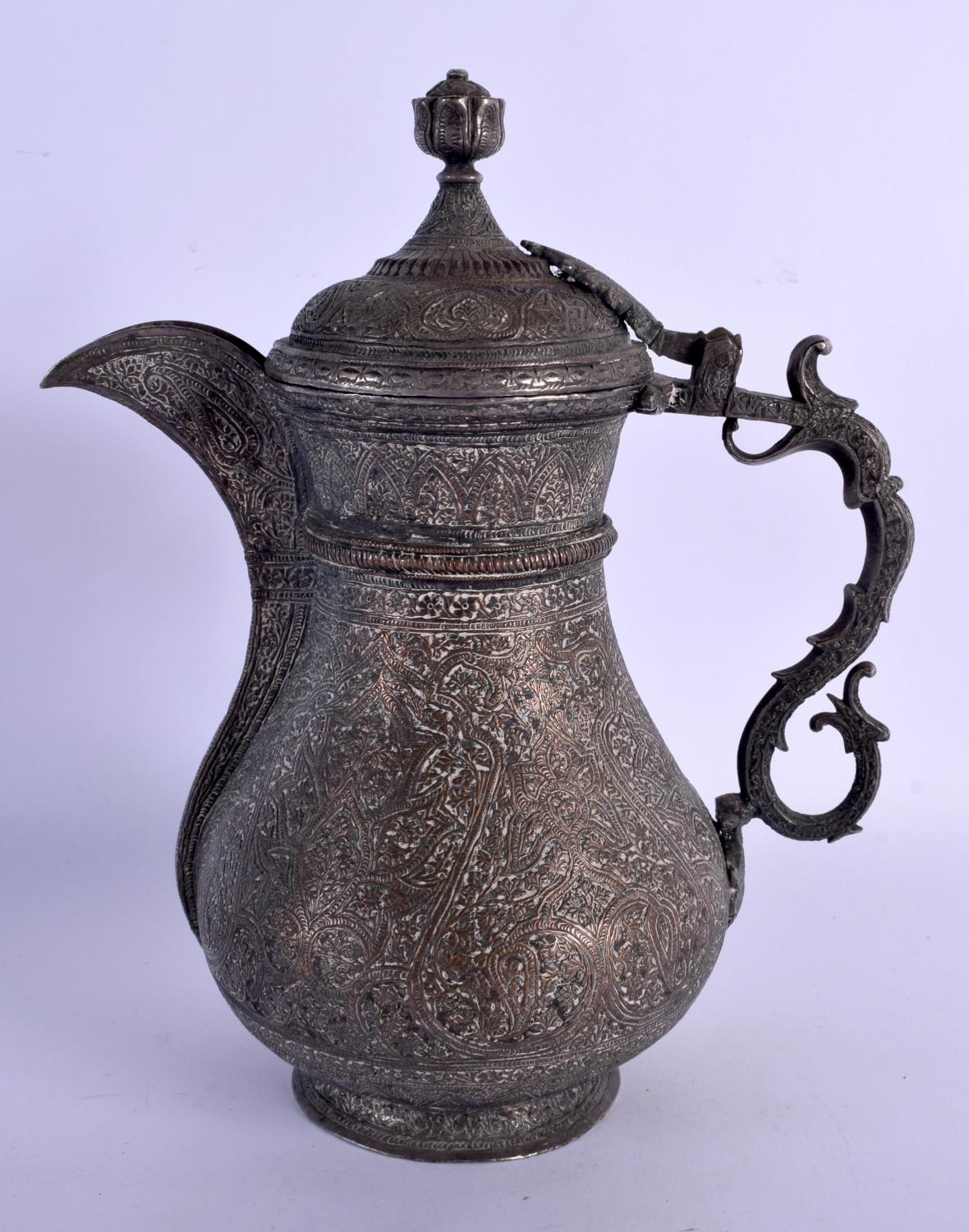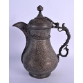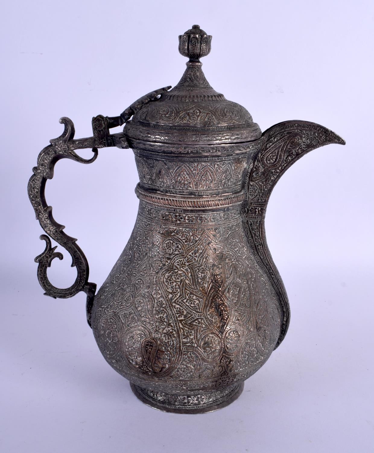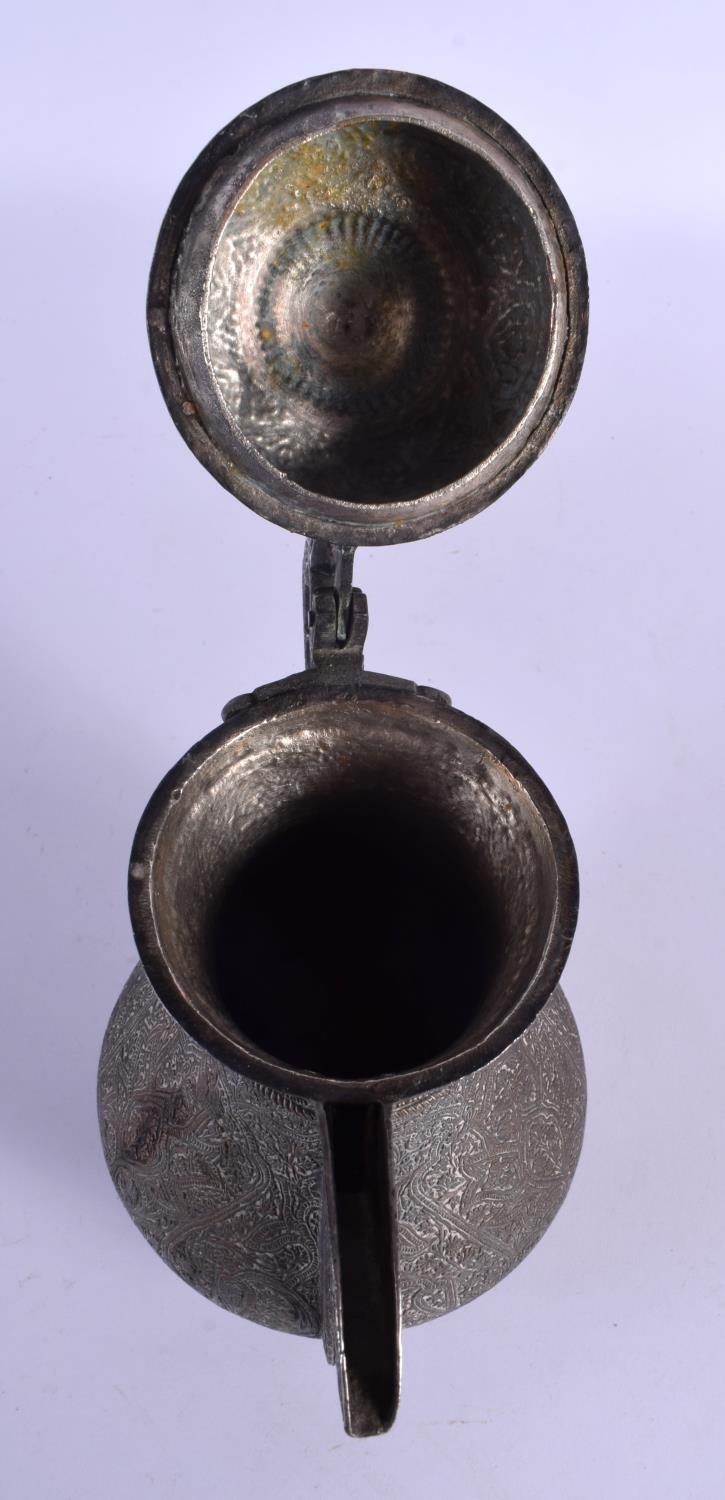 A FINE 19TH CENTURY INDIAN MIDDLE EASTERN KUFIC MIXED METAL BRONZE EWER with silver overlay. 24 cm x 16 cm.
