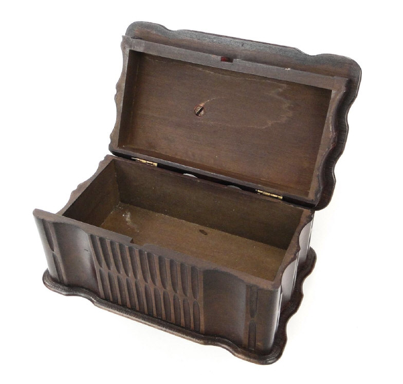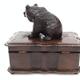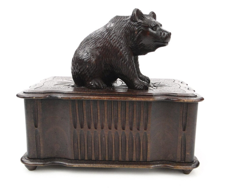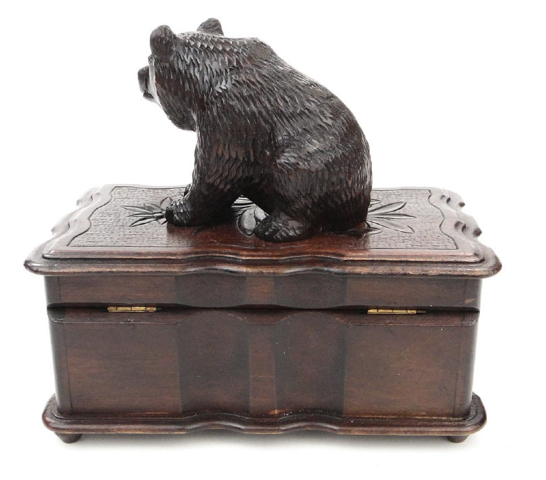 Black Forest style wooden jewellery box, surmounted with a carved bear, 17cm in length
