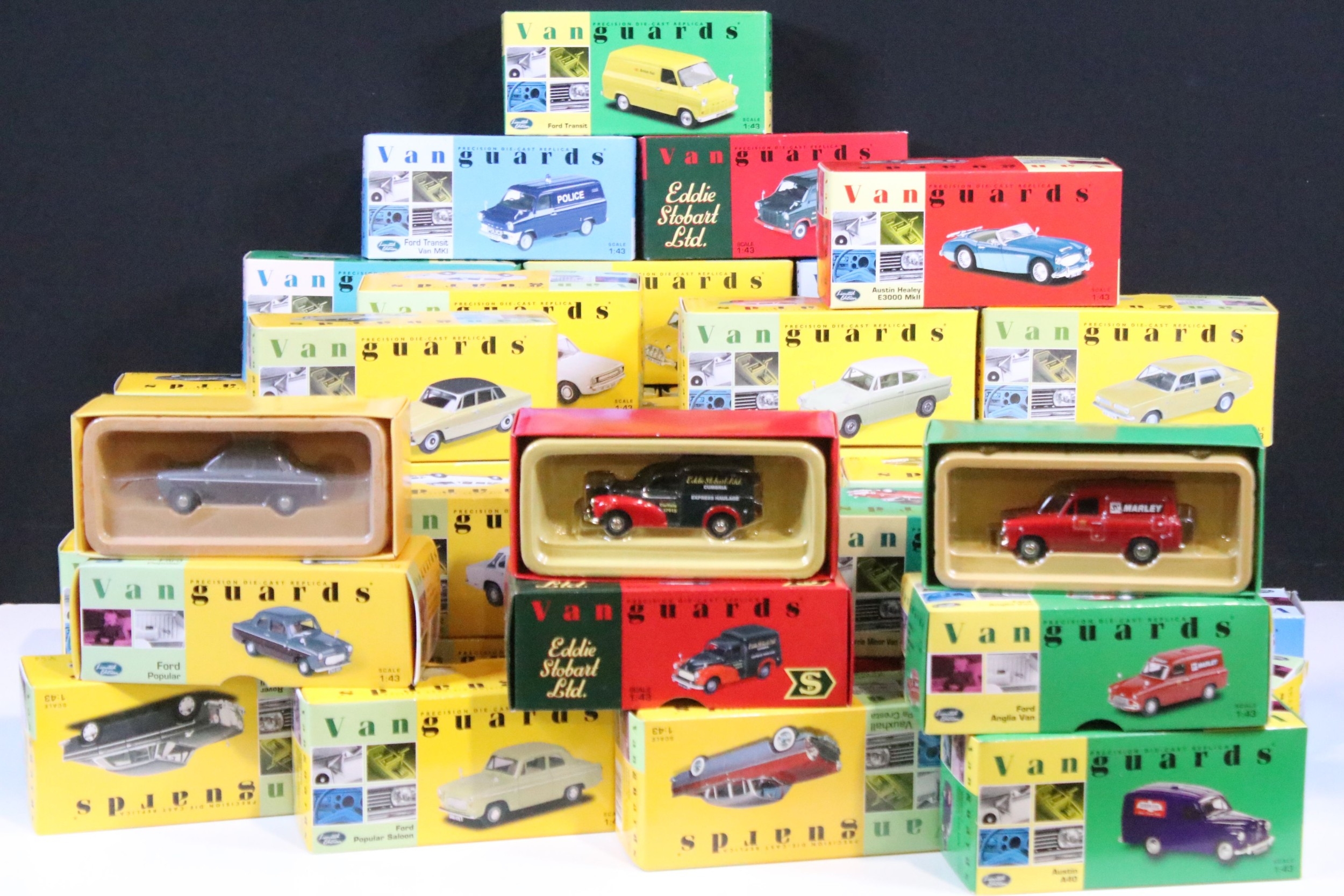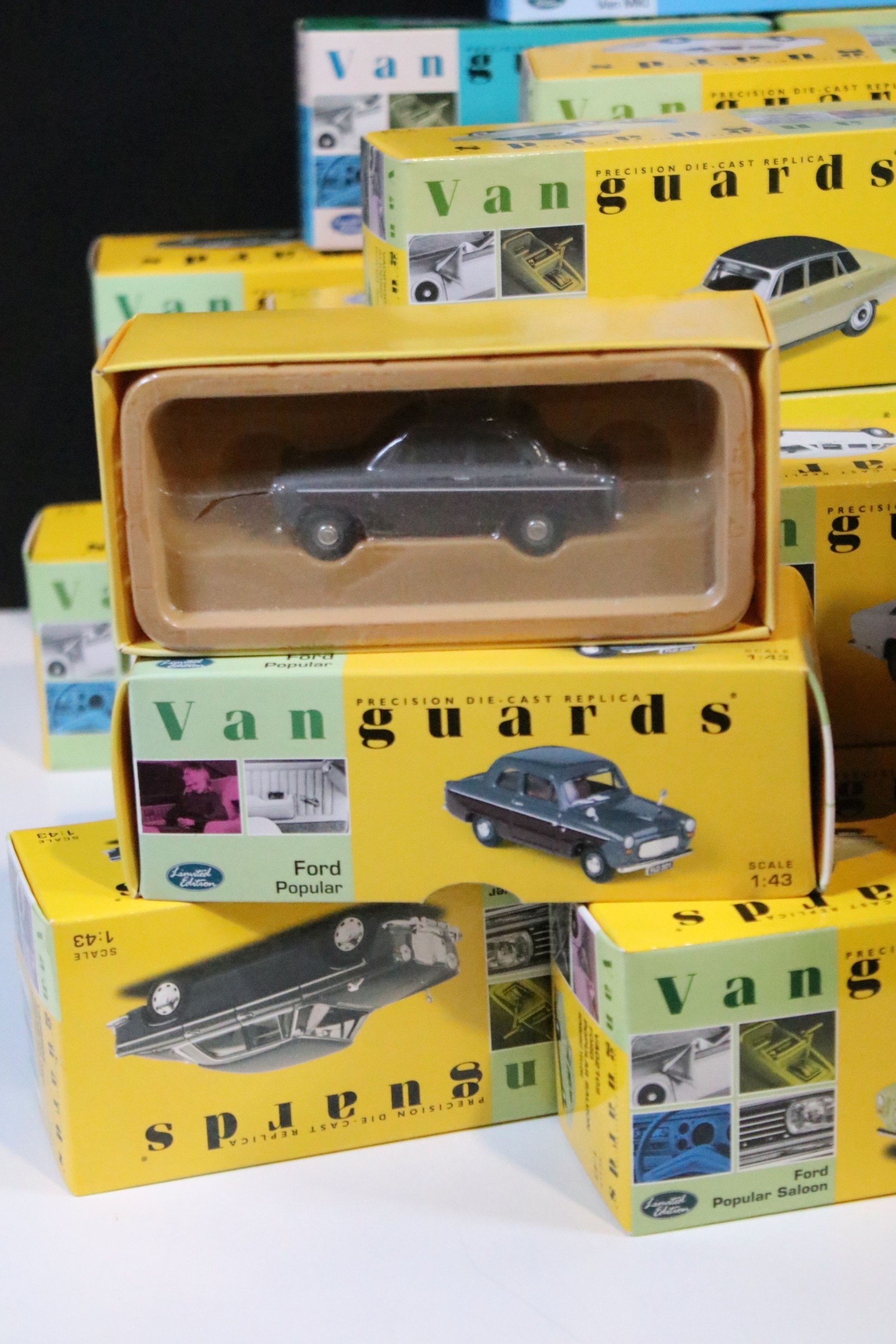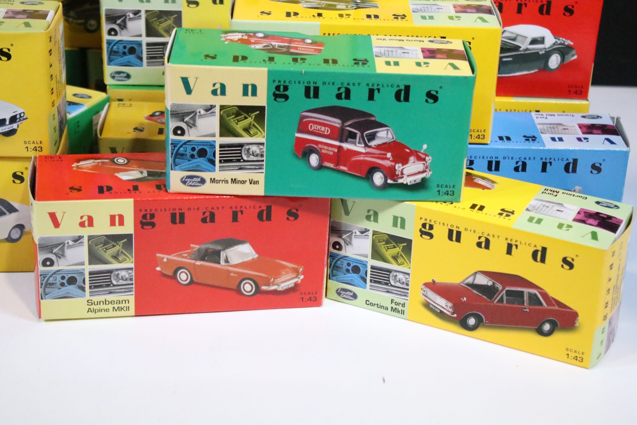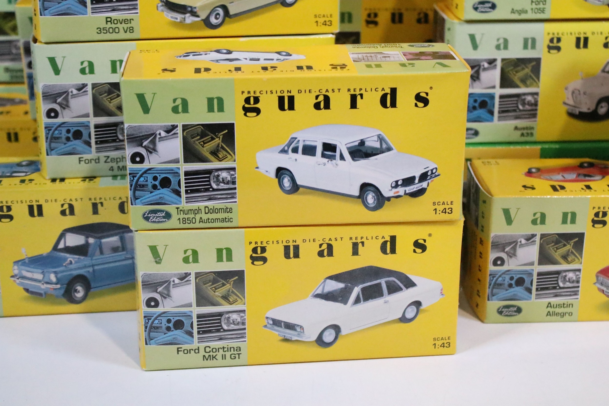 46 Boxed Vanguards diecast models to include VA06000 Lime Green Ford Zephyr 4 MKIII, VA02108 Vulcan Grey & Imperial Maroon Ford Popular, VA07000 Sunbeam Alpine MKII Carnival Red, VA06403 Maroon & Silver Grey Vauxhall PA Cresta, VA34003 Black Ford Capri, etc, all ex overall