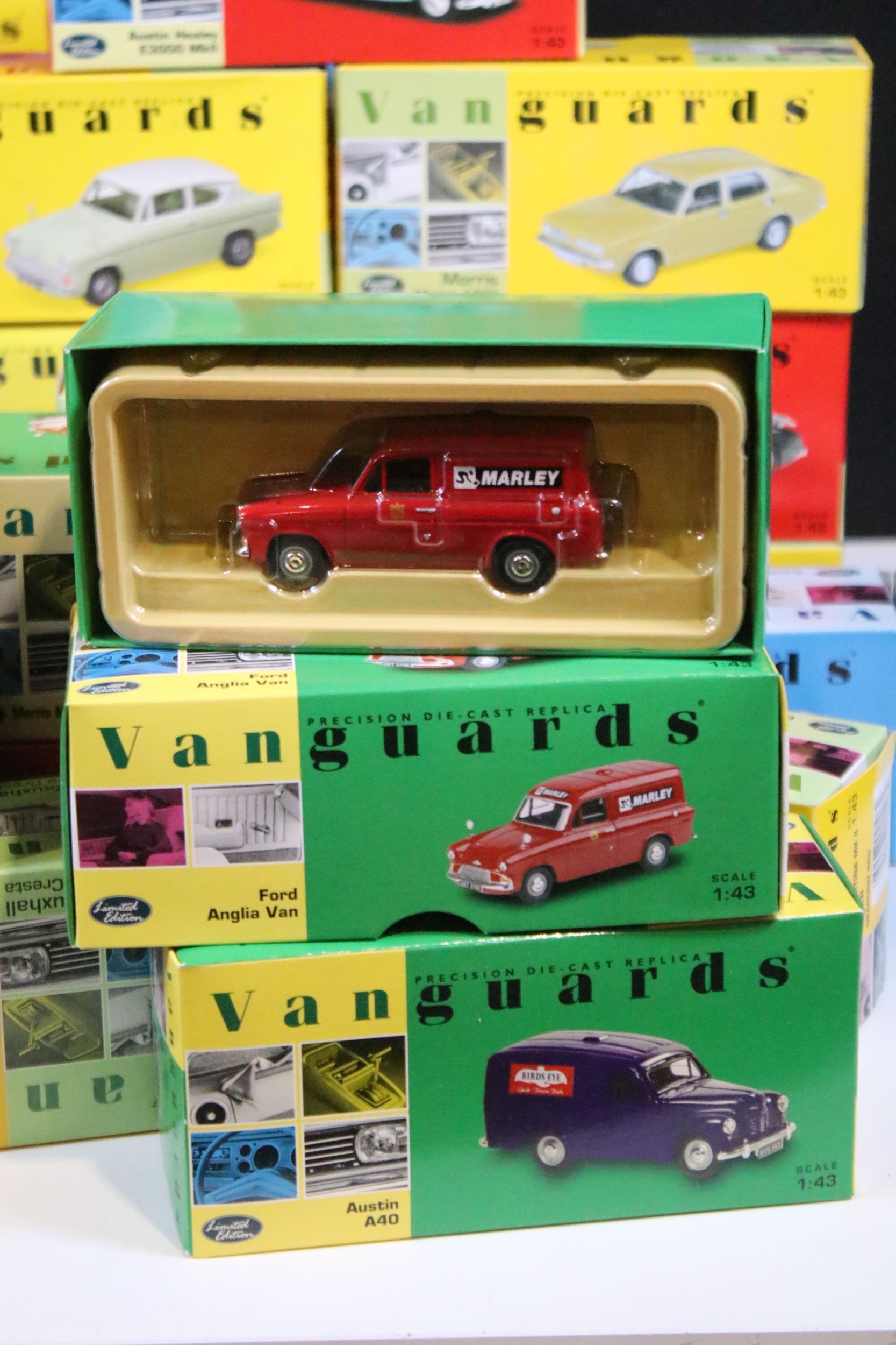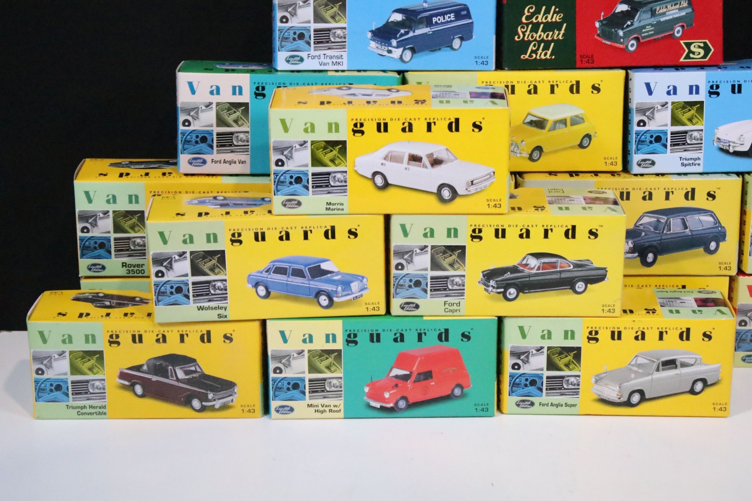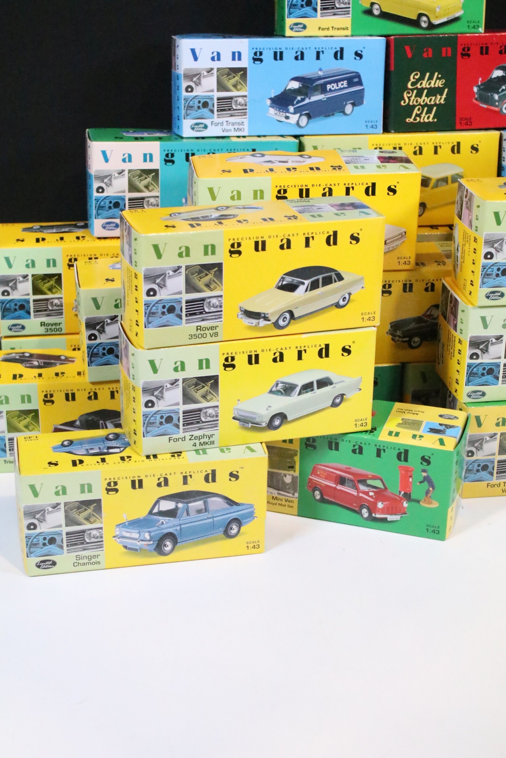 46 Boxed Vanguards diecast models to include VA06000 Lime Green Ford Zephyr 4 MKIII, VA02108 Vulcan Grey & Imperial Maroon Ford Popular, VA07000 Sunbeam Alpine MKII Carnival Red, VA06403 Maroon & Silver Grey Vauxhall PA Cresta, VA34003 Black Ford Capri, etc, all ex overall