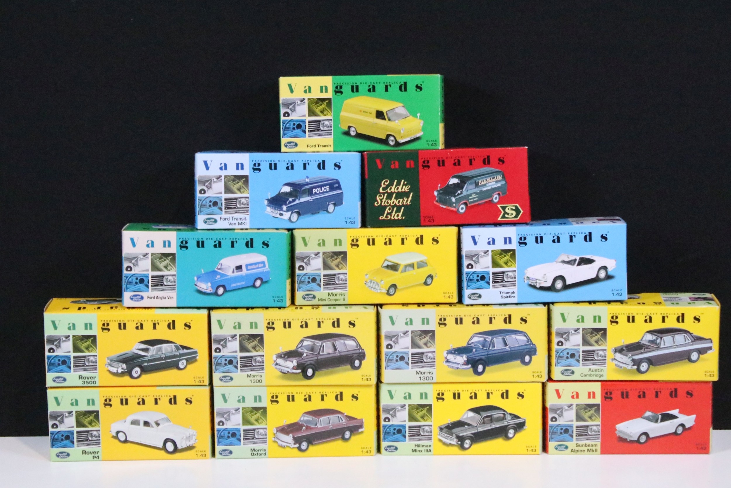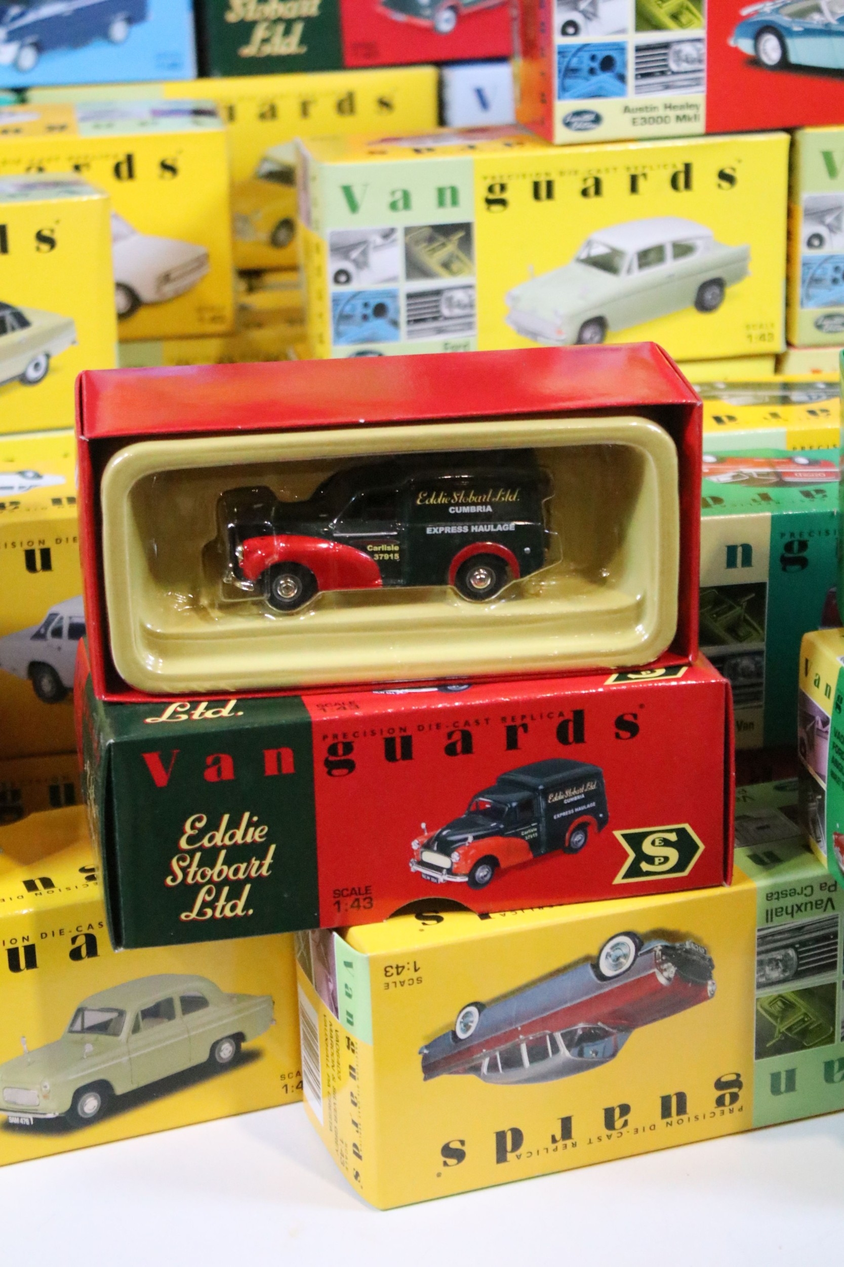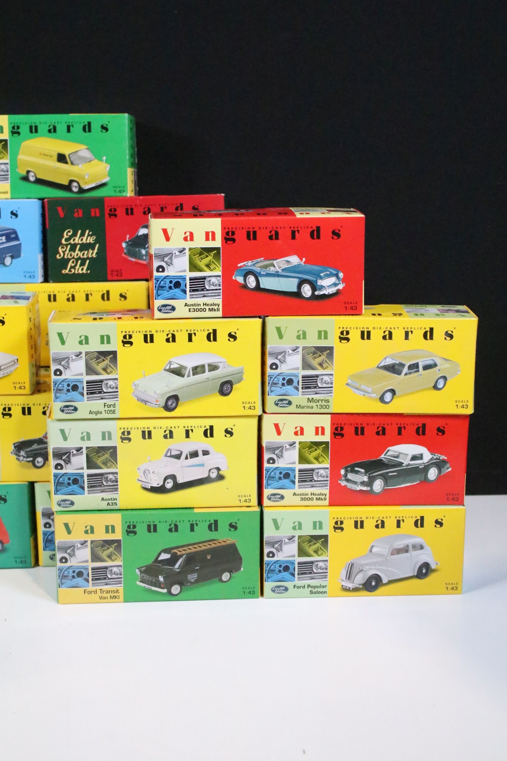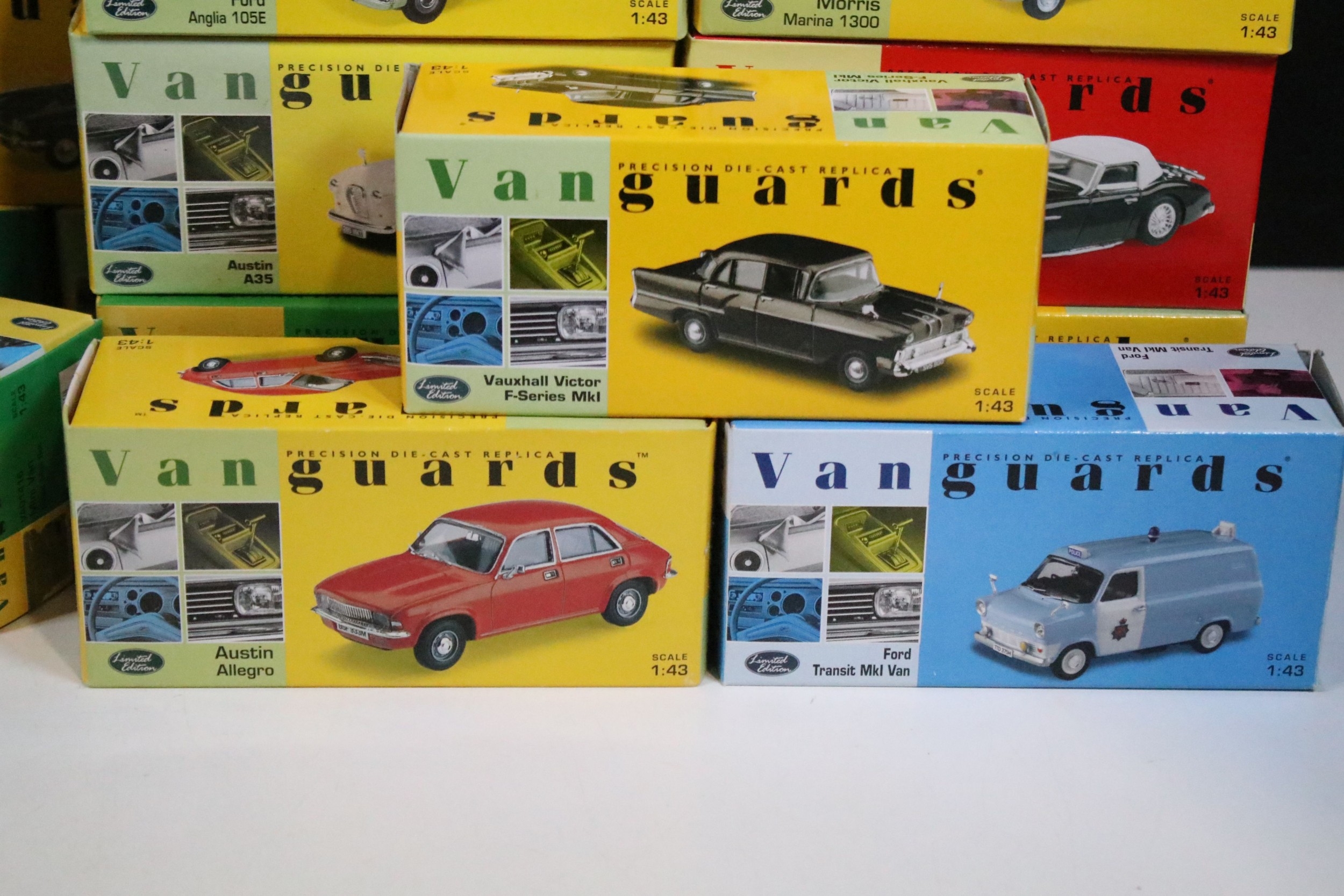46 Boxed Vanguards diecast models to include VA06000 Lime Green Ford Zephyr 4 MKIII, VA02108 Vulcan Grey & Imperial Maroon Ford Popular, VA07000 Sunbeam Alpine MKII Carnival Red, VA06403 Maroon & Silver Grey Vauxhall PA Cresta, VA34003 Black Ford Capri, etc, all ex overall