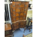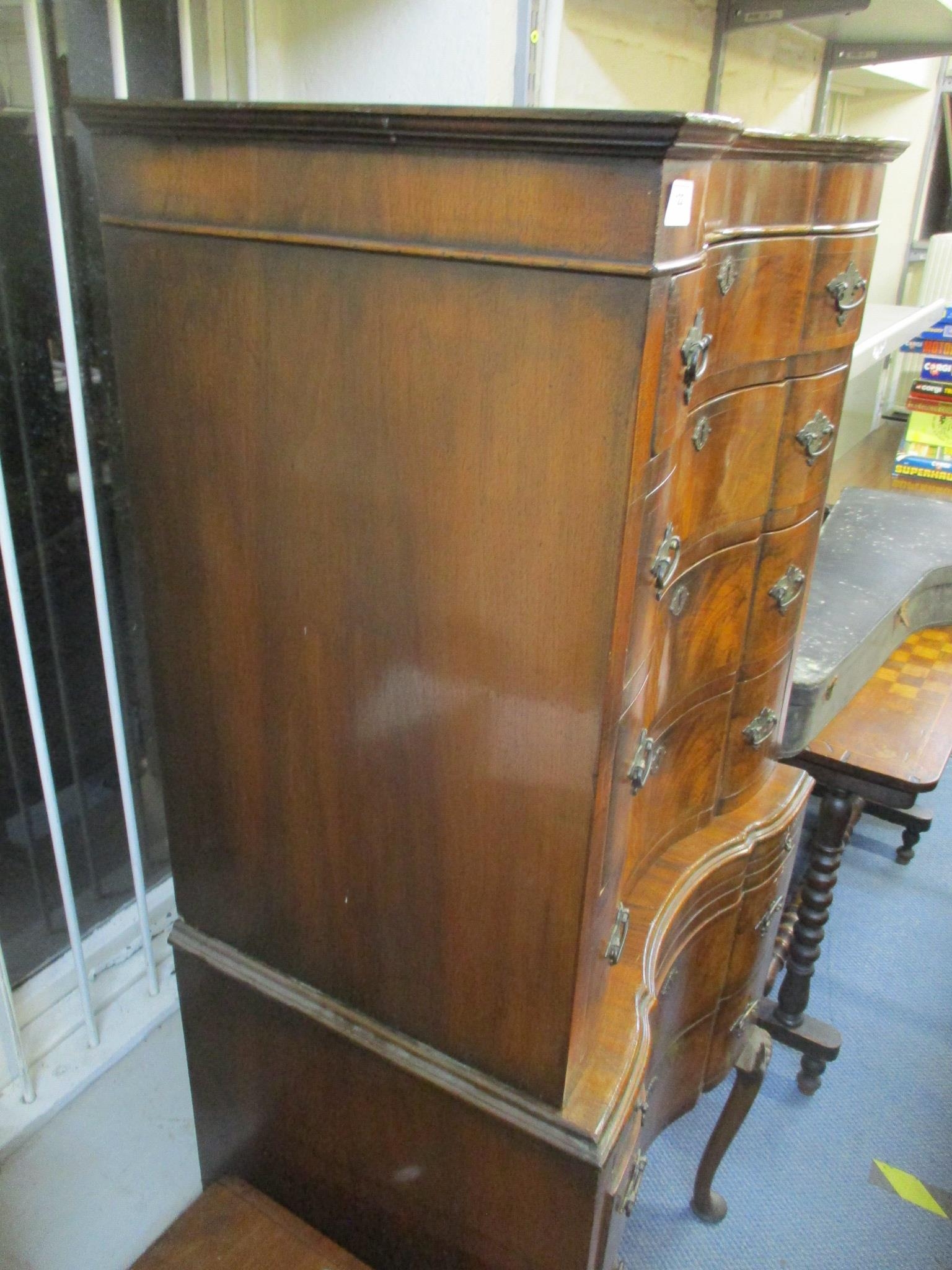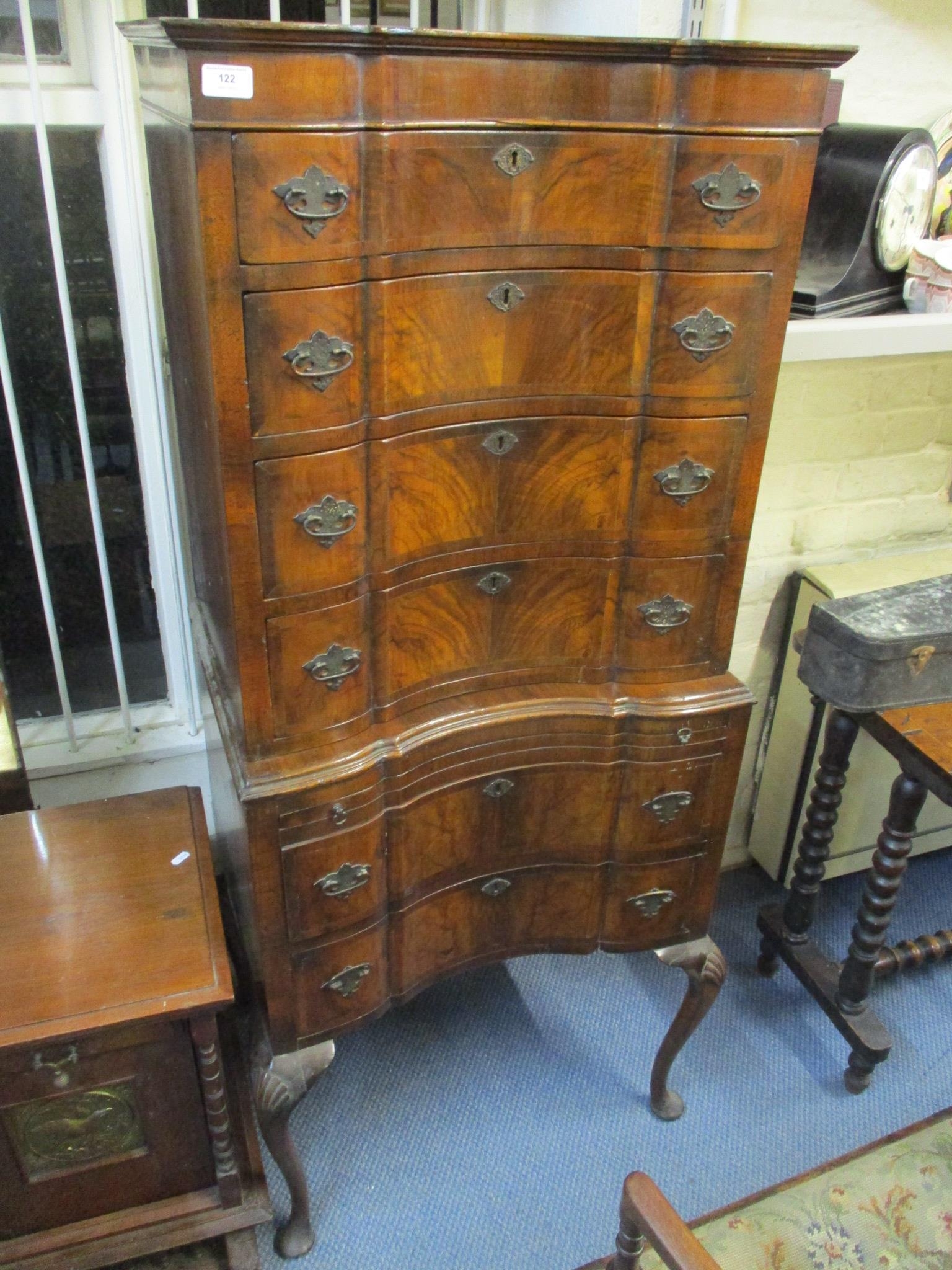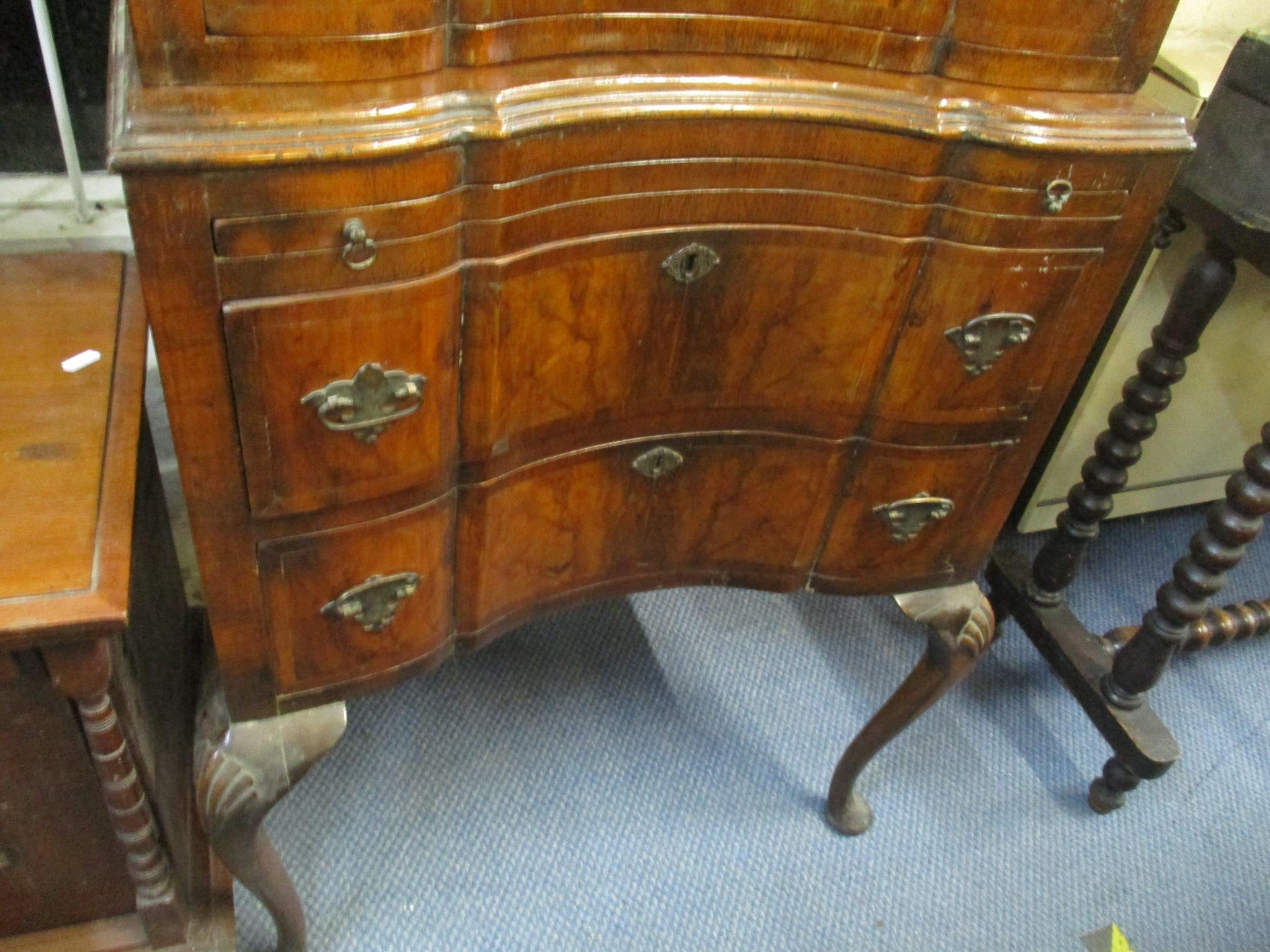 A Queen Anne style figured walnut chest on stand having a stepped cornice above six drawers with a brush slide and on cabriole legs, 148cm h x 62cm w